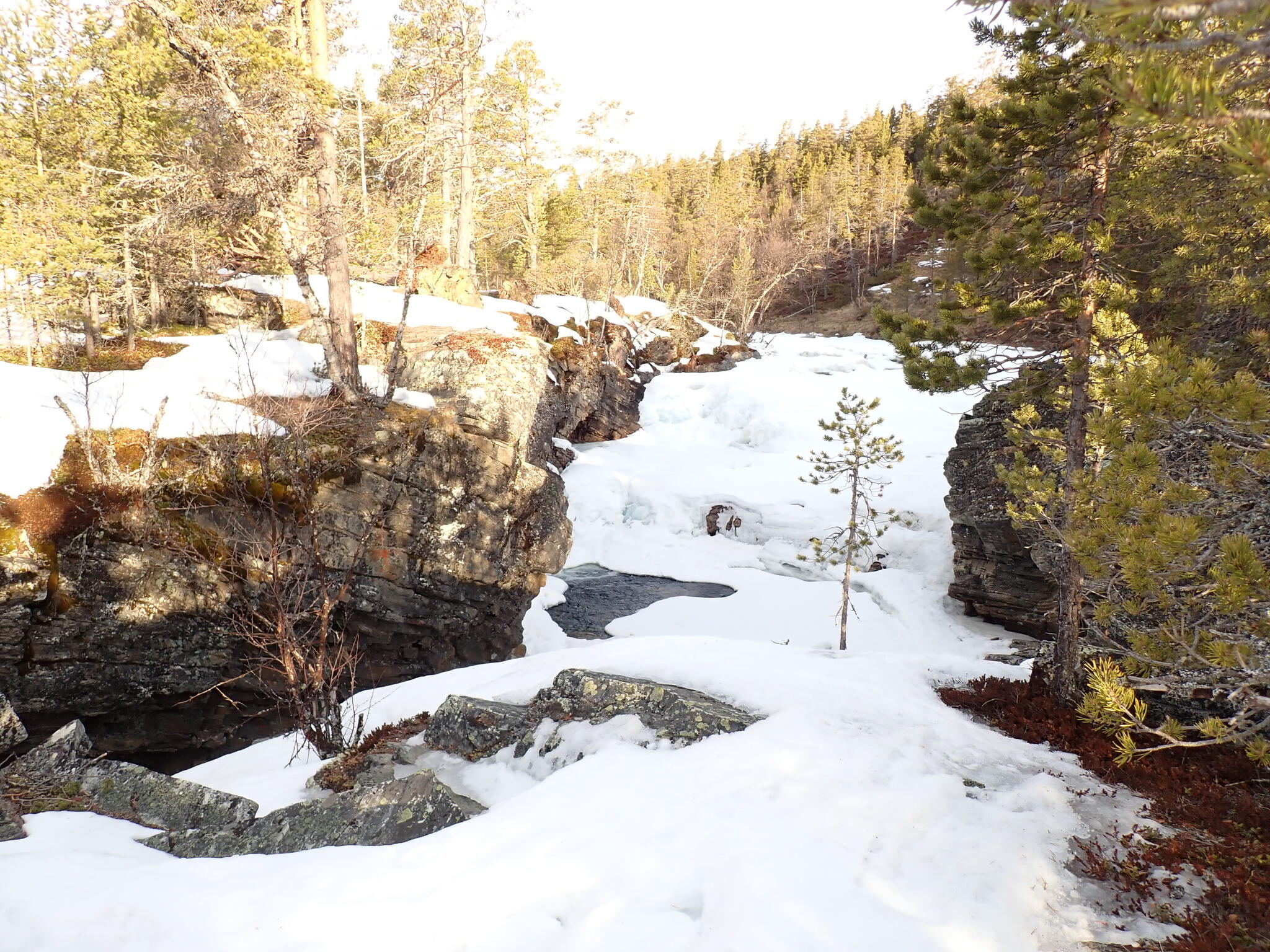 Vi packade ihop och skidade ner till där vinterleden går mot mot fjällstationen Rondvassbu, som ligger i södra delen av nationalparken. Skidade på ån dit och lite i skog bredvid.