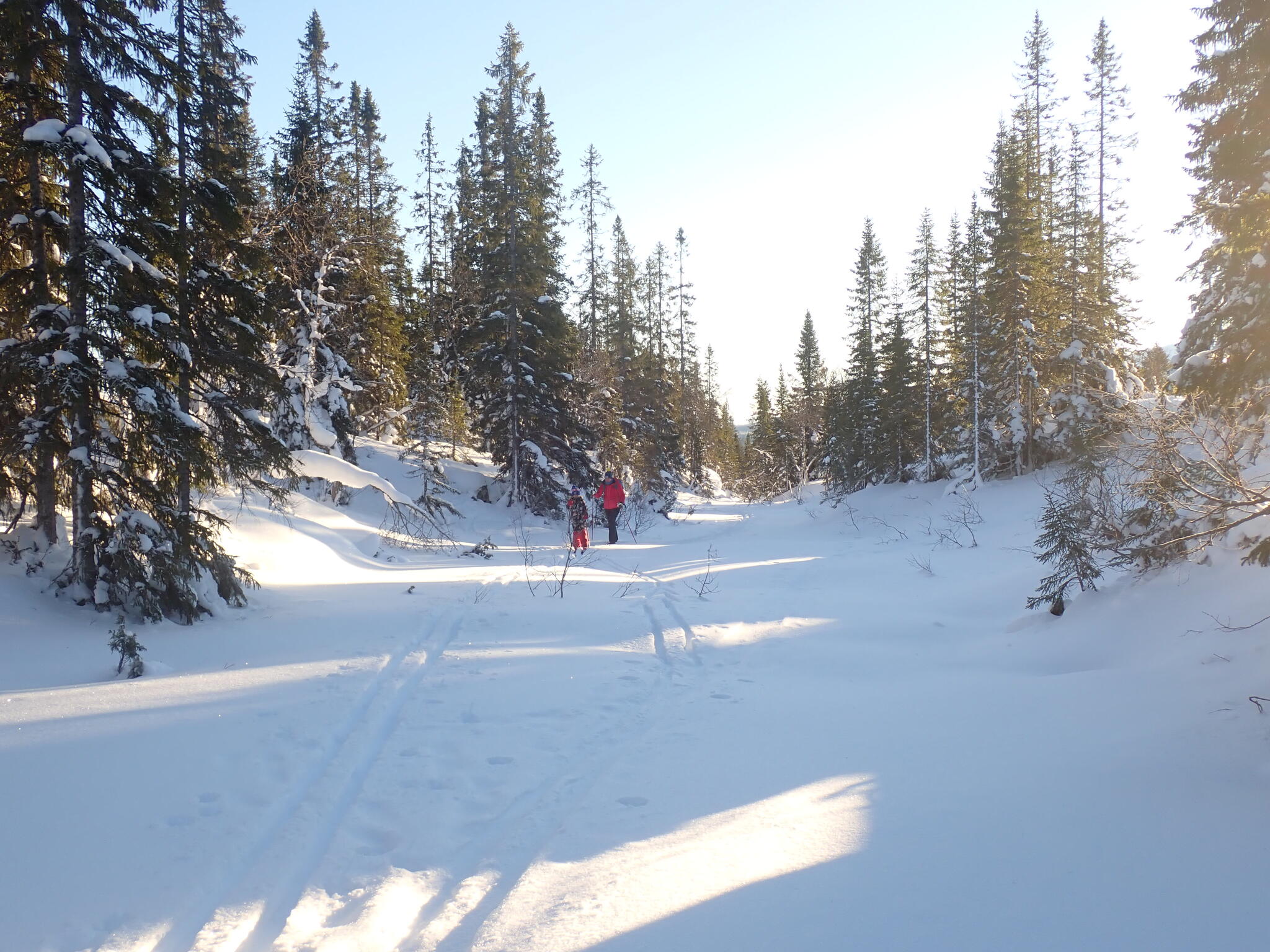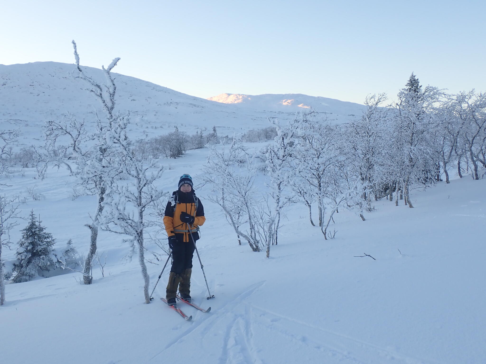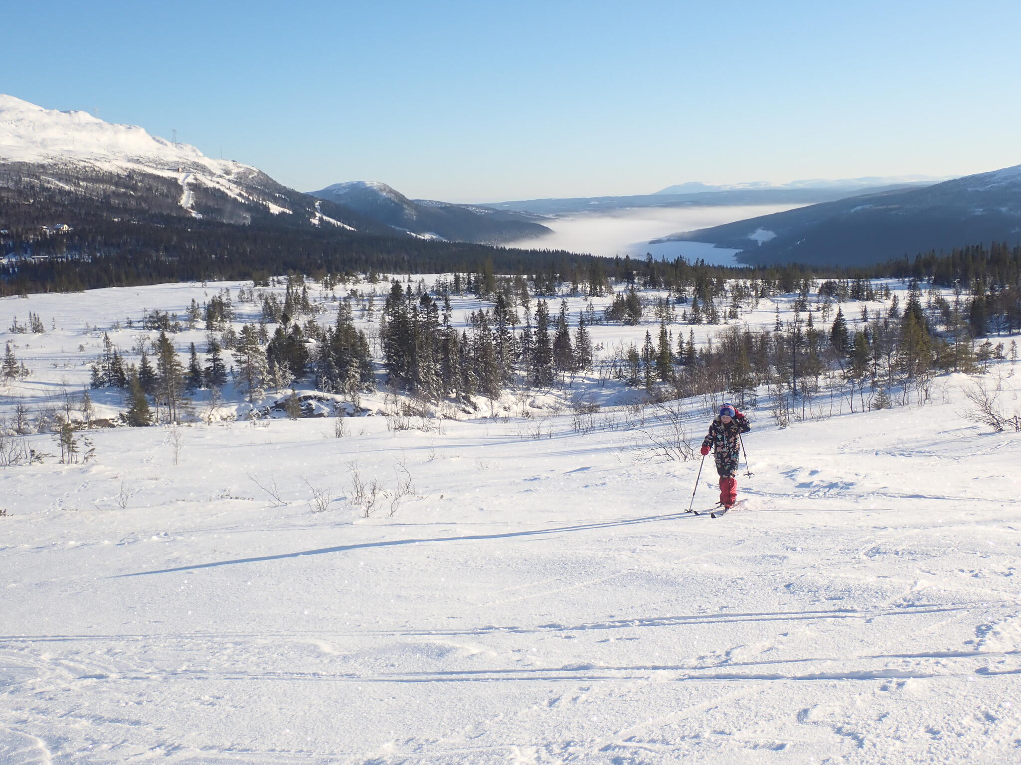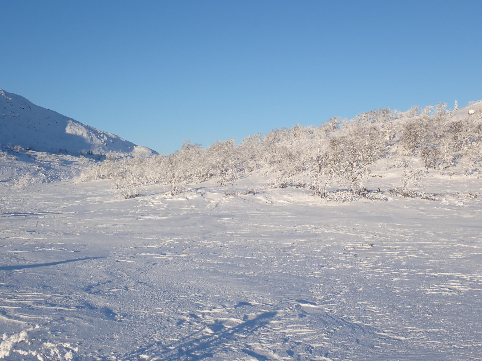 Vi skråade sedan och försökte hålla höjd åt nordost, för att komma mot leden. Det blev några utmanande nerförsbackar då snön var hård och ibland isig.