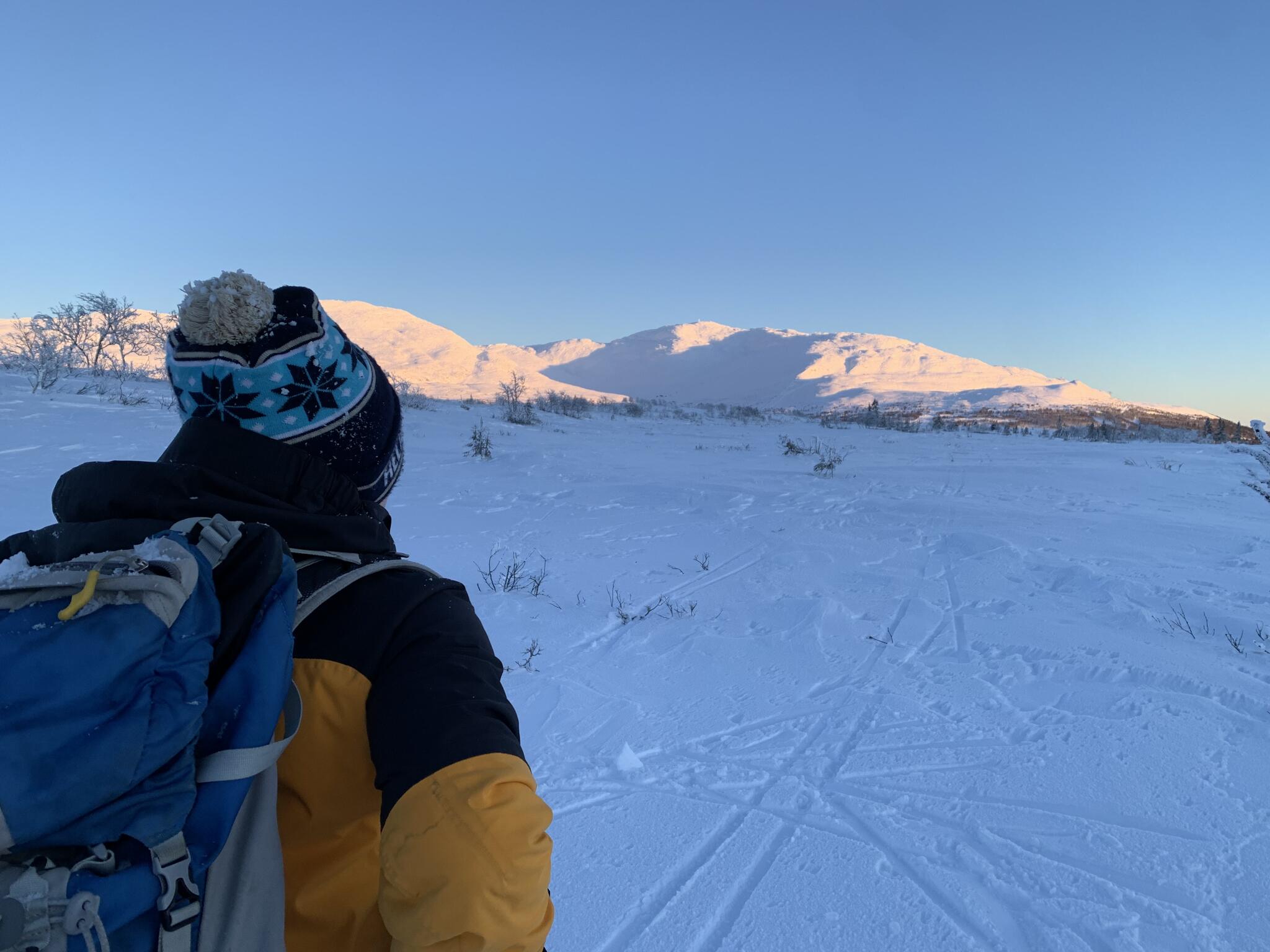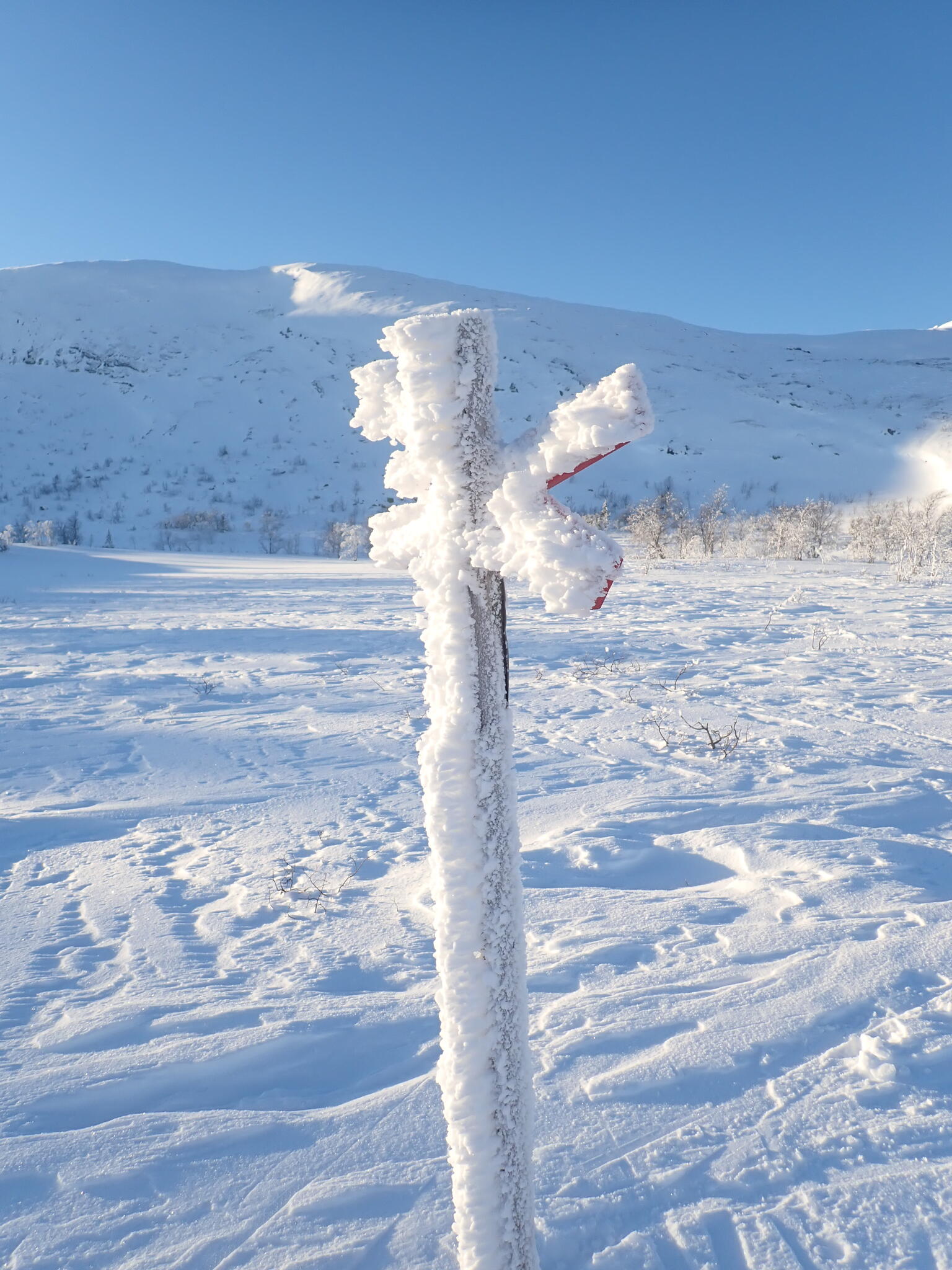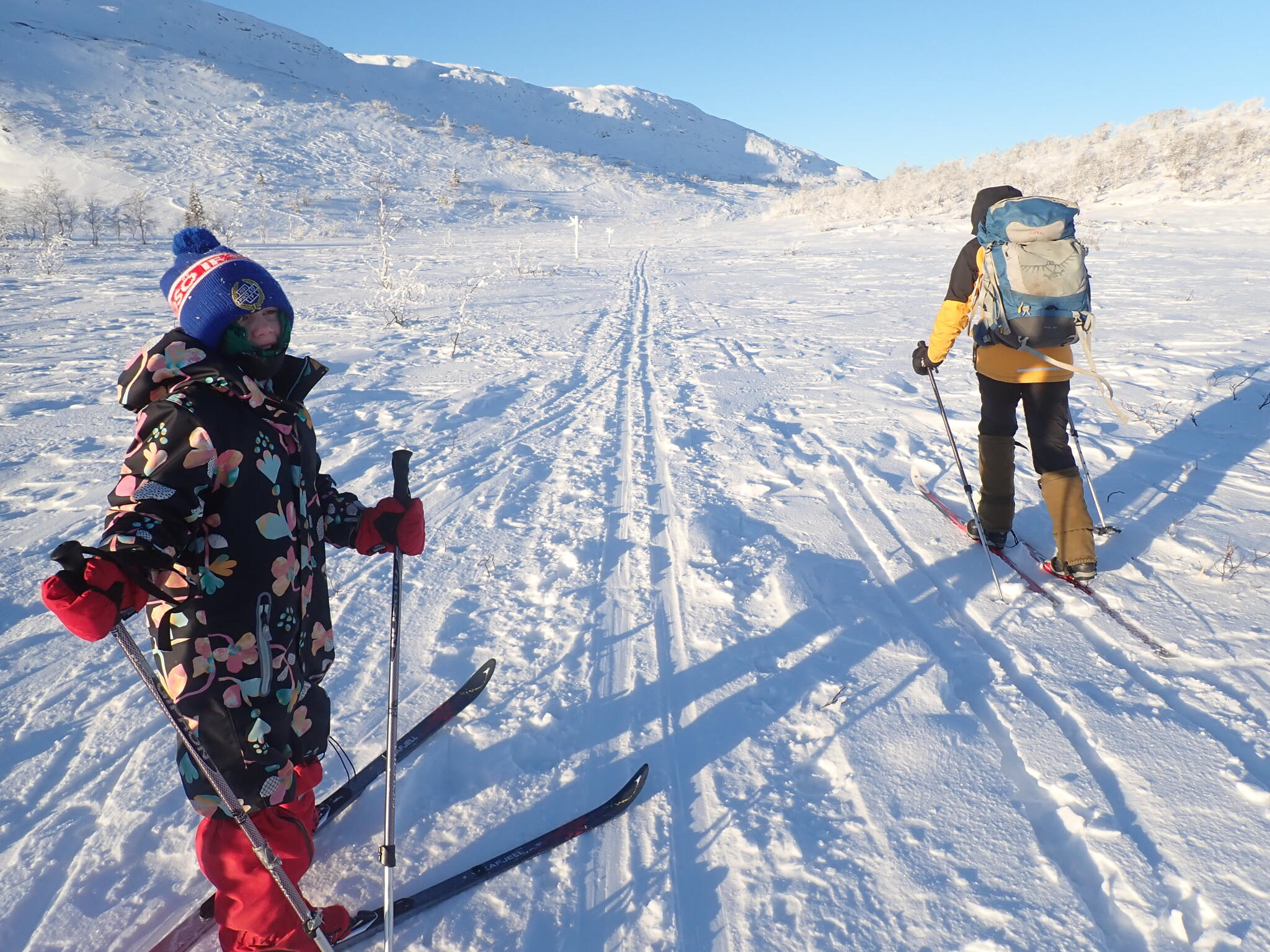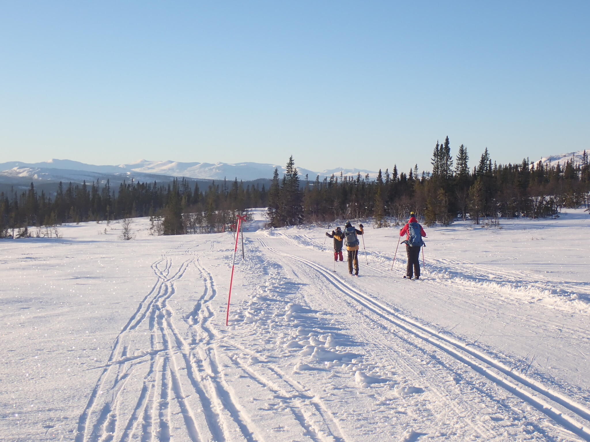 Vi skråade sedan och försökte hålla höjd åt nordost, för att komma mot leden. Det blev några utmanande nerförsbackar då snön var hård och ibland isig.