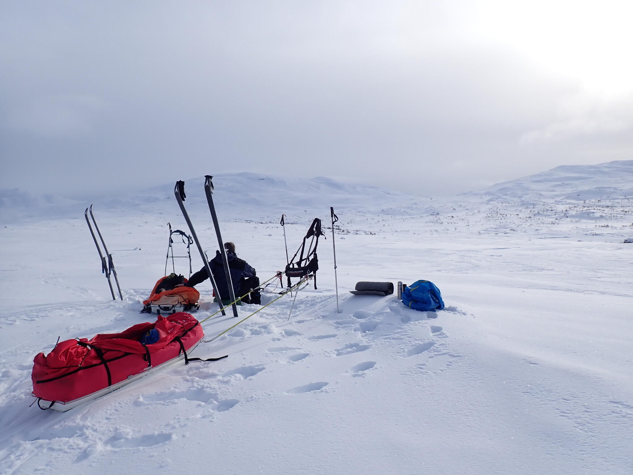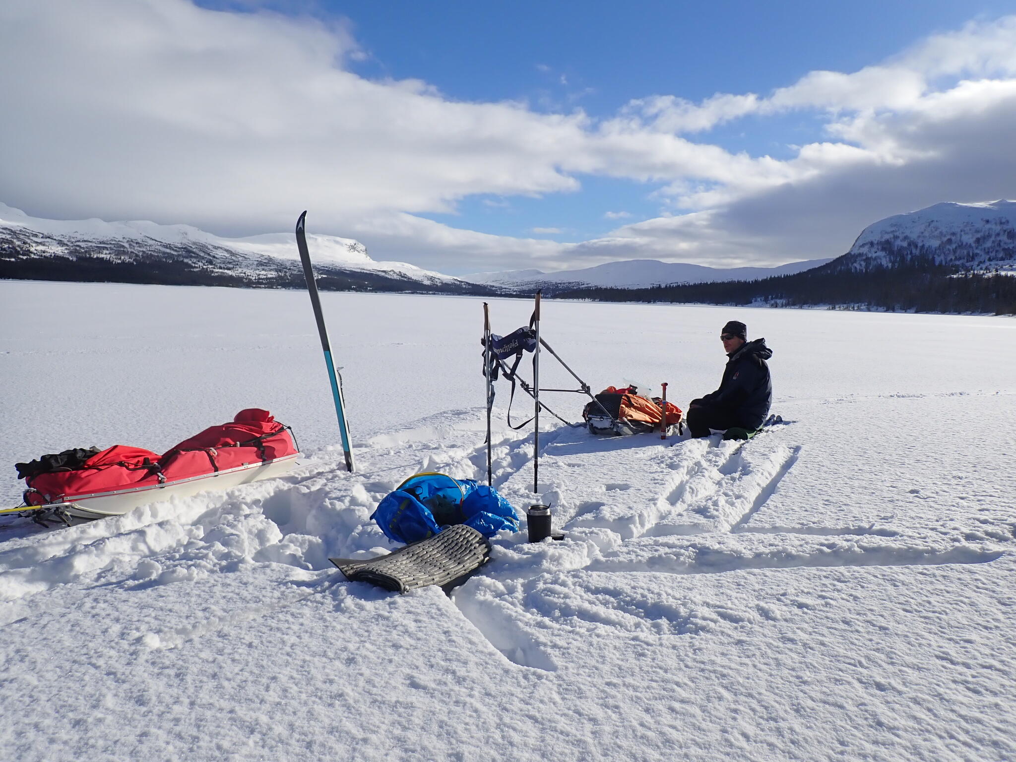 Vi skråade upp till en lite sjö och sedan uppför mot kalfjället. Där i kanten mot kalfjället vid några granar blev det eftermiddagsfika. Nu hade vi bra skid- pch pulkaföre.