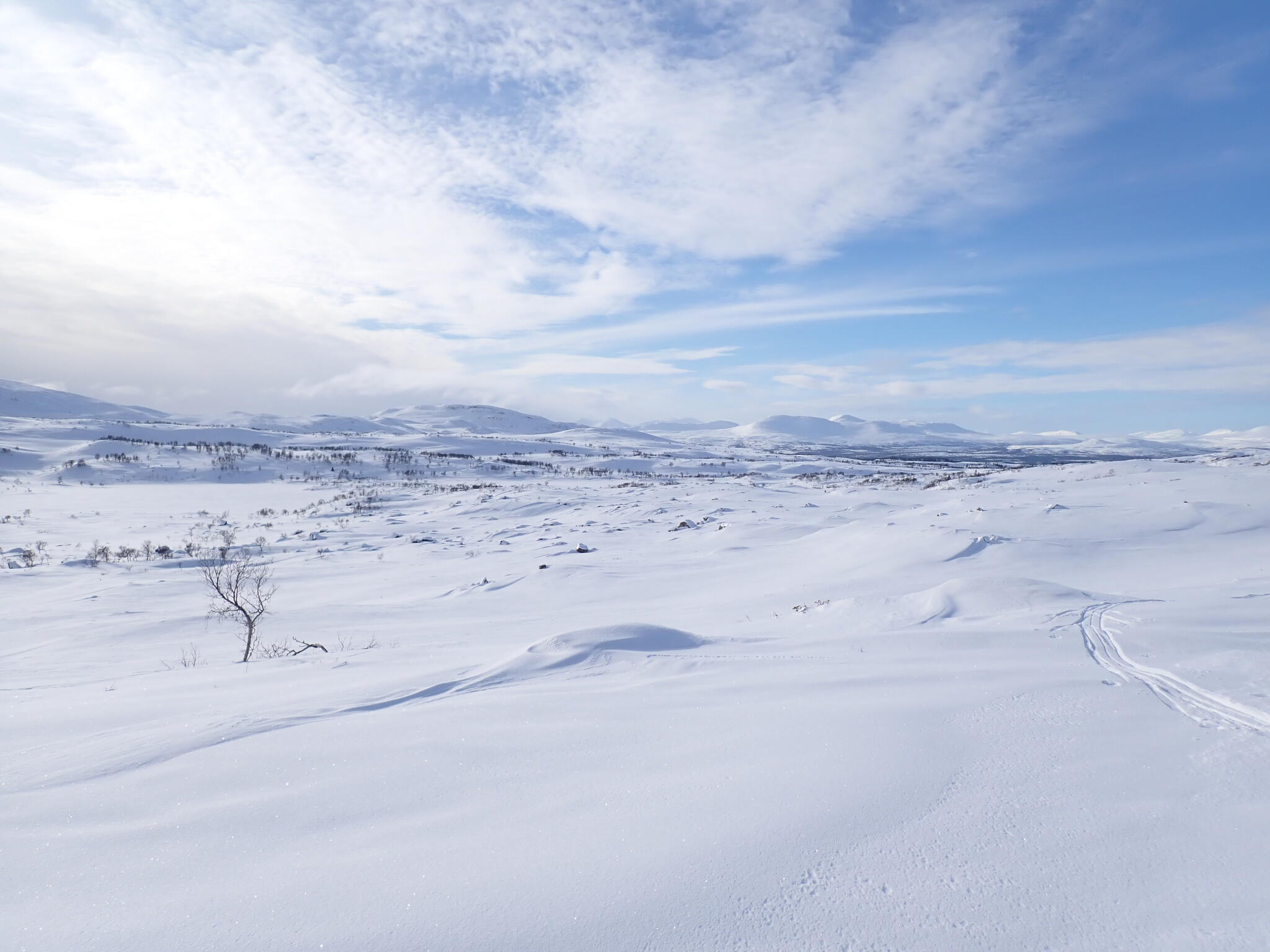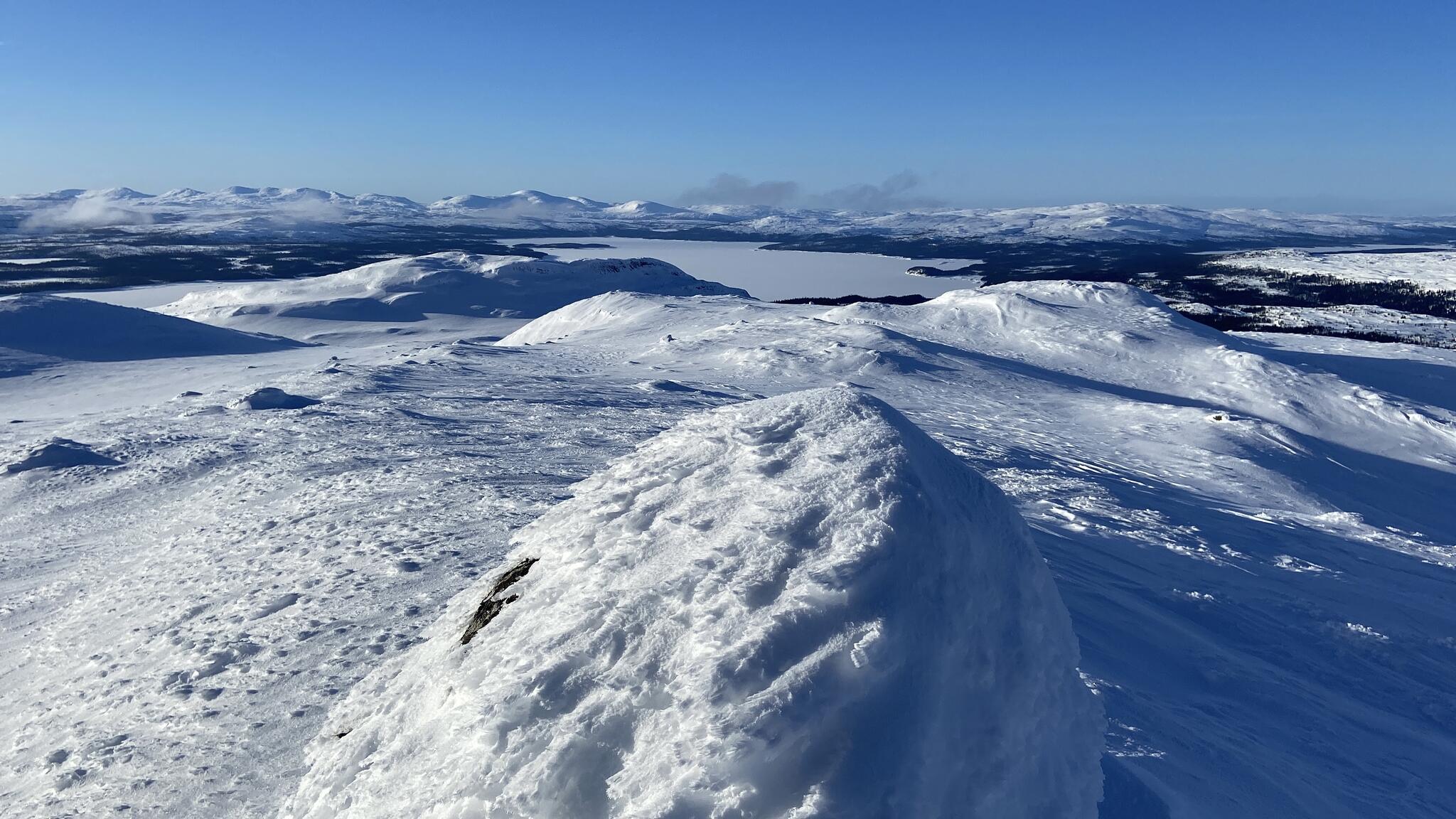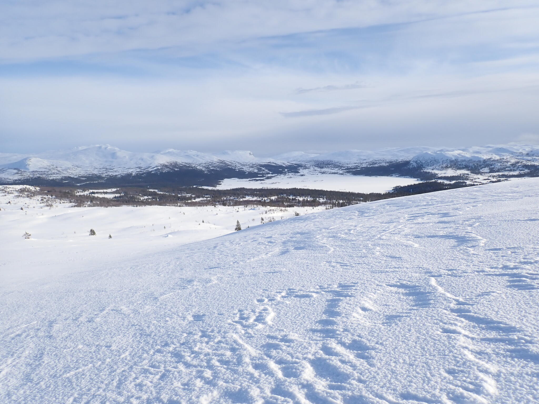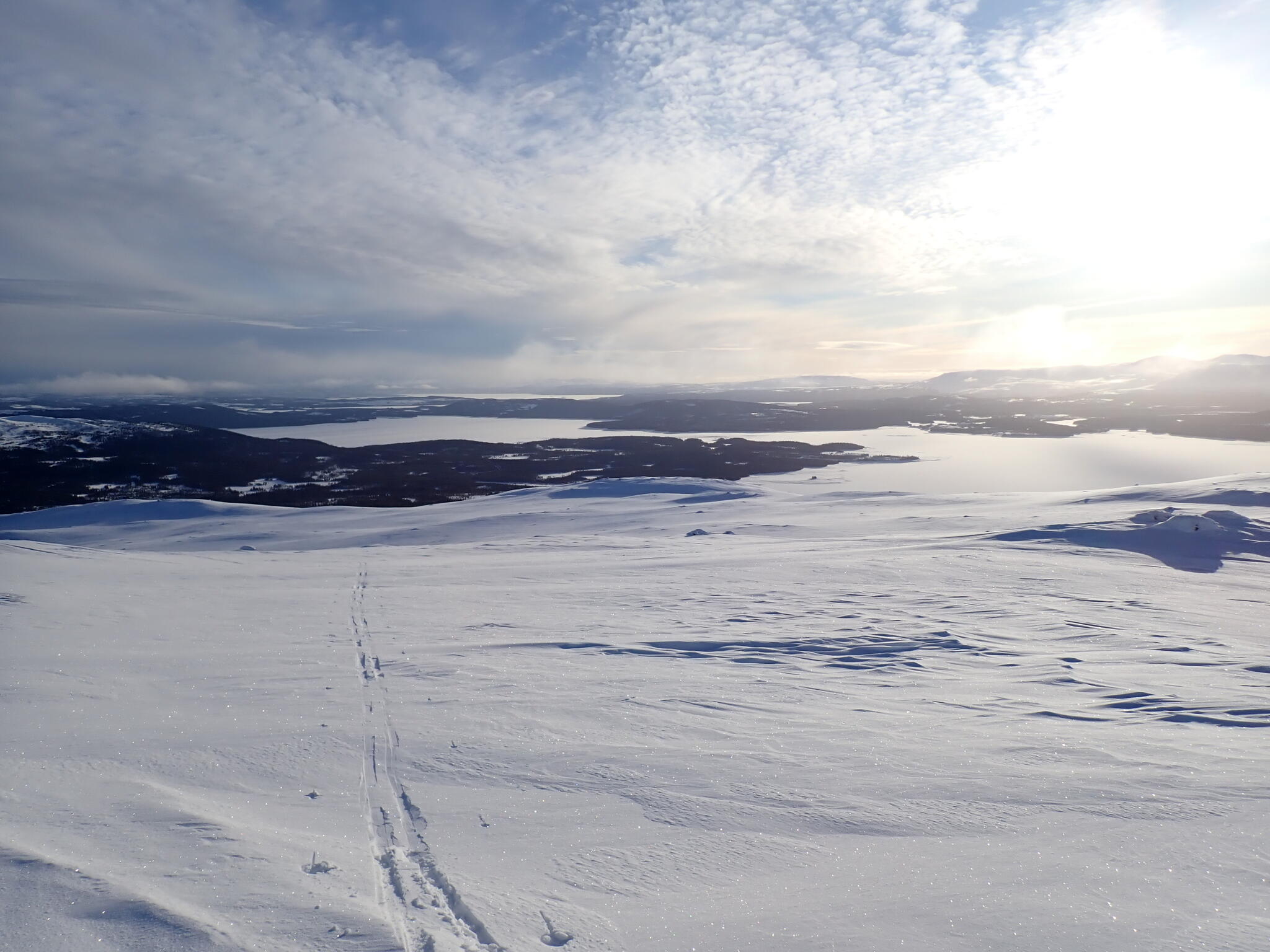 Vi korsade sjön och sedan följde några rätt tunga km där vi skidade uppför delvis på myrar och dels genom skog med djup lössnö. Detta var nog den jobbigaste delen av turen. Till slut kom vi upp på högt liggande myrar där snön var vindpackad. Äntligen!