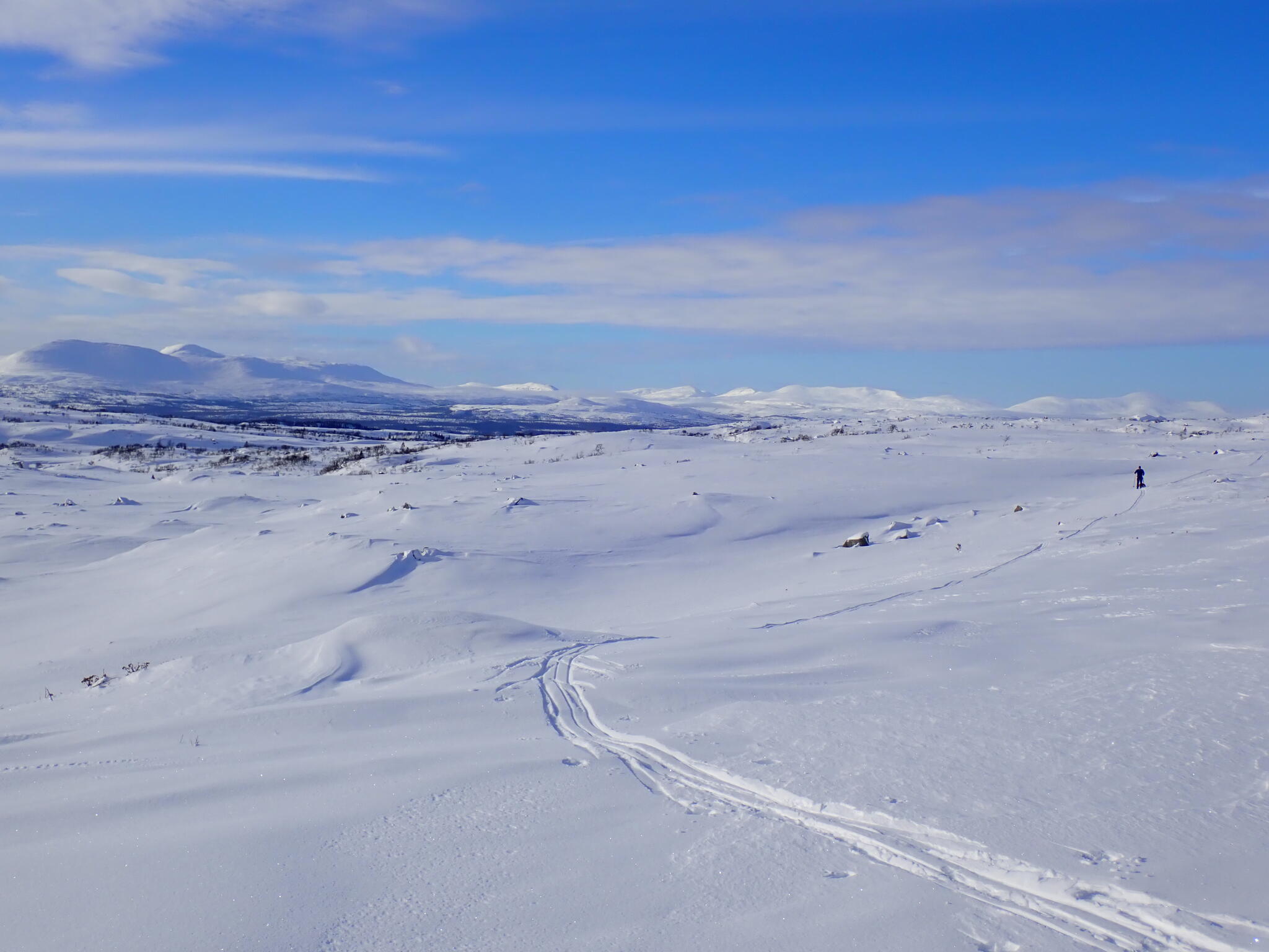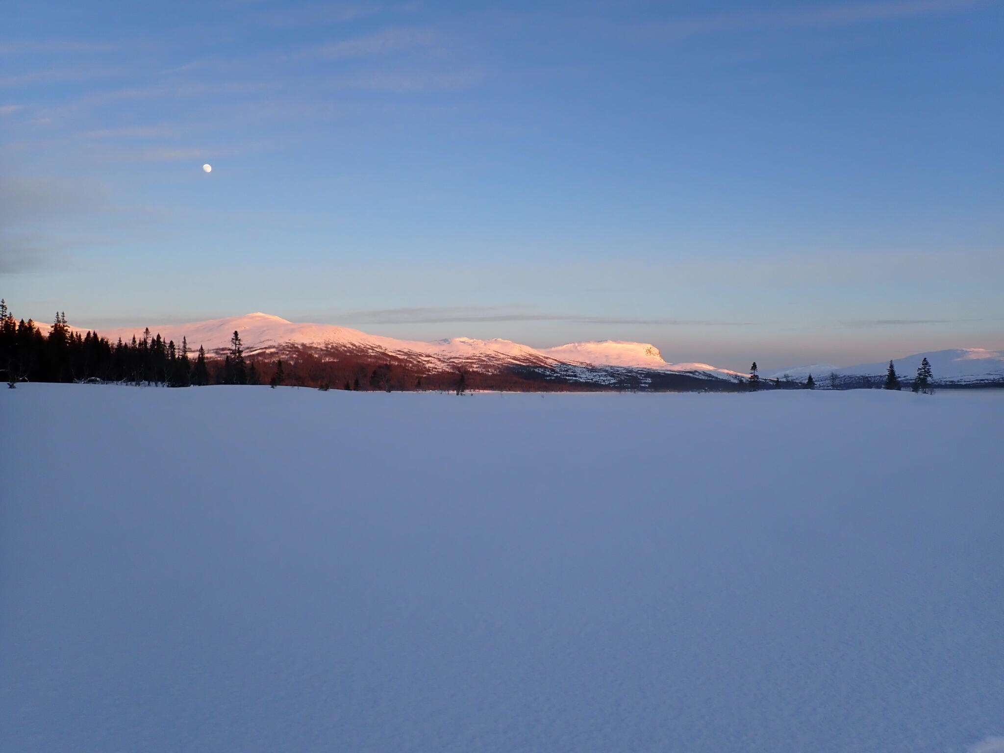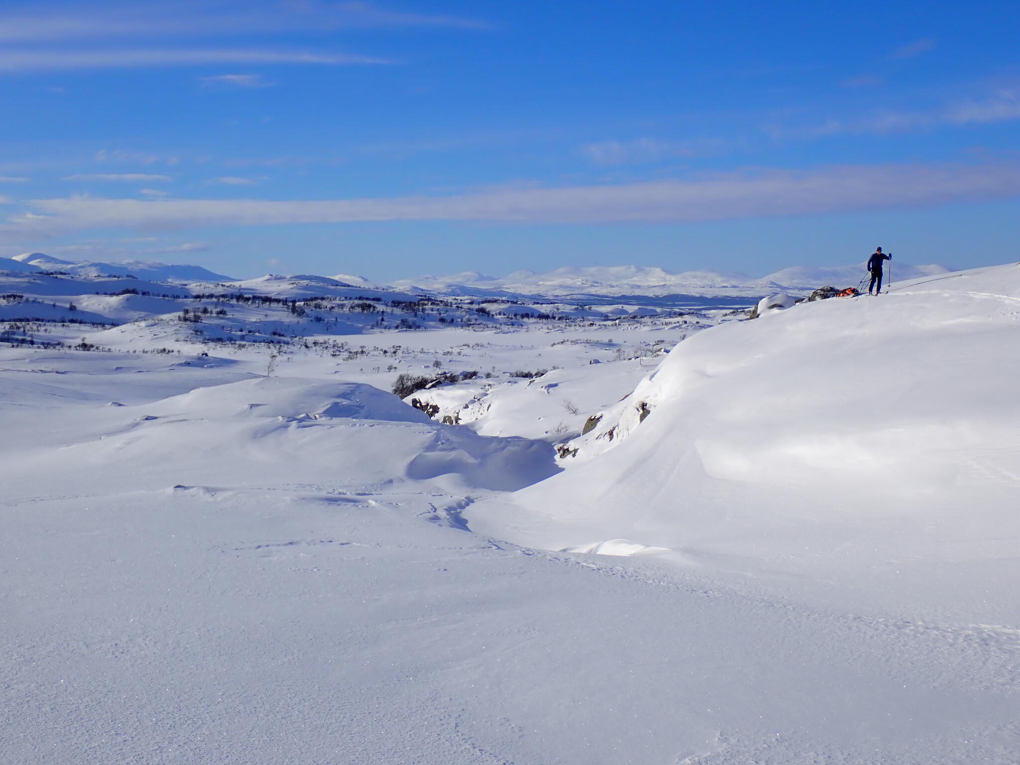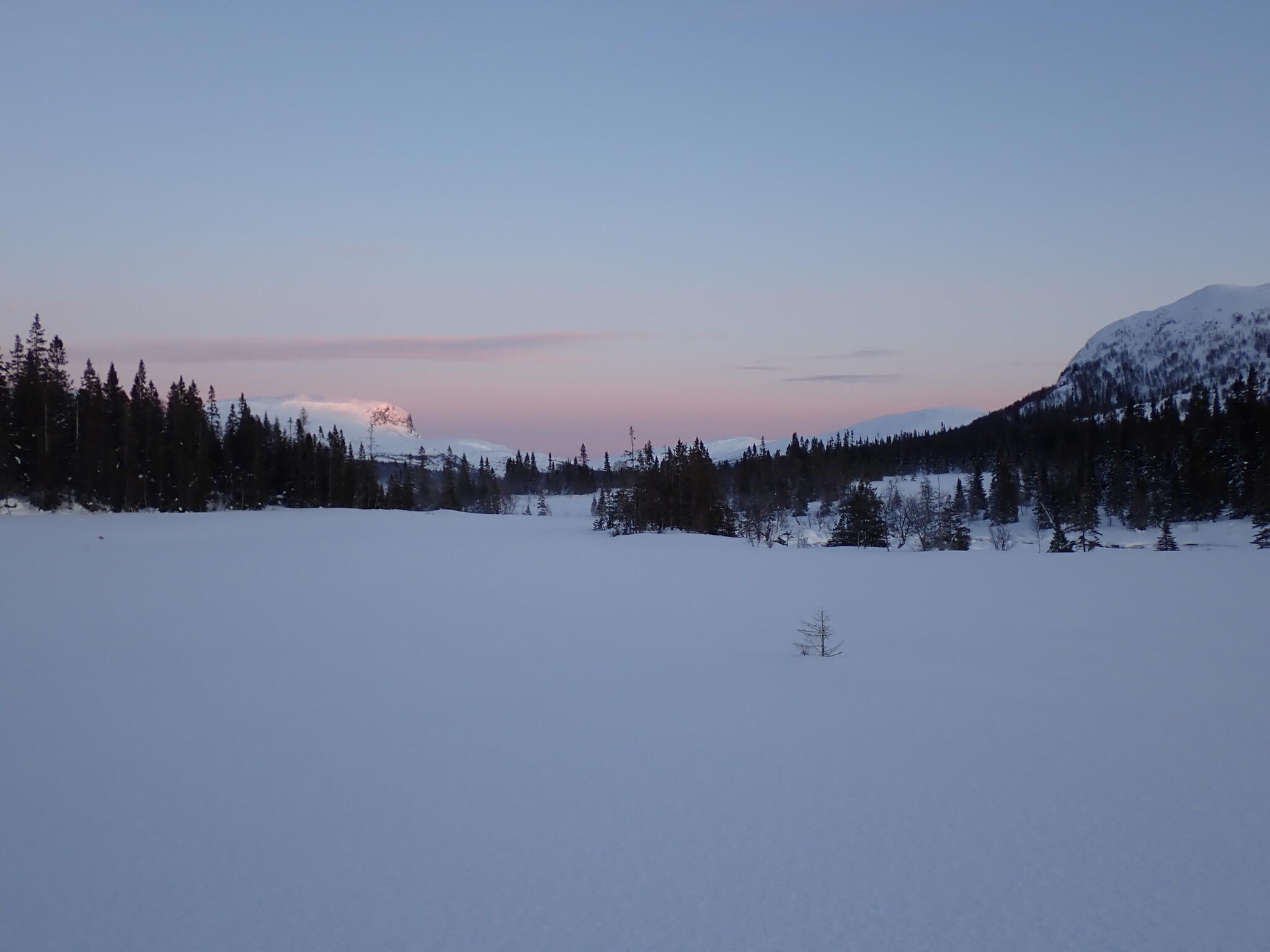 Vi korsade sjön och sedan följde några rätt tunga km där vi skidade uppför delvis på myrar och dels genom skog med djup lössnö. Detta var nog den jobbigaste delen av turen. Till slut kom vi upp på högt liggande myrar där snön var vindpackad. Äntligen!