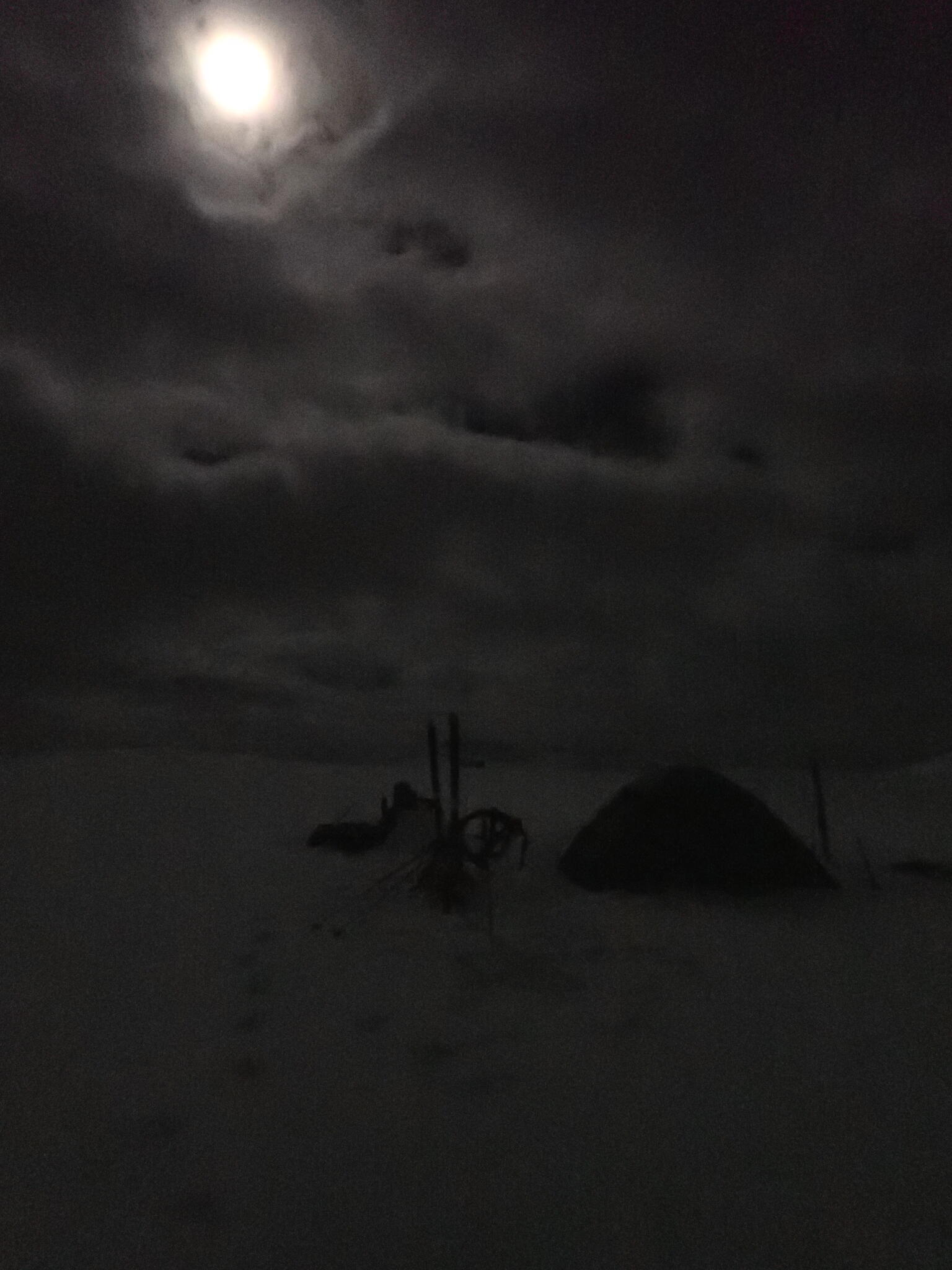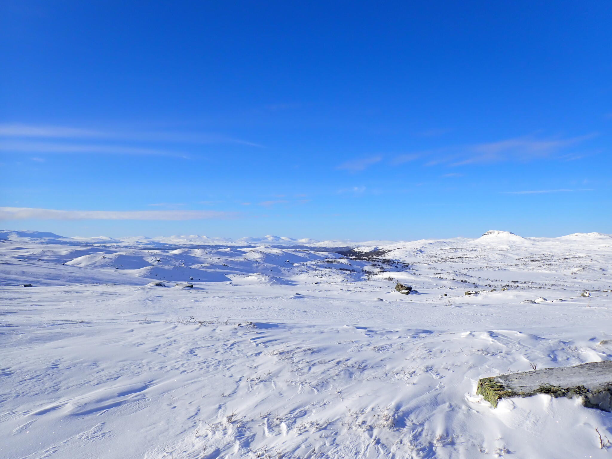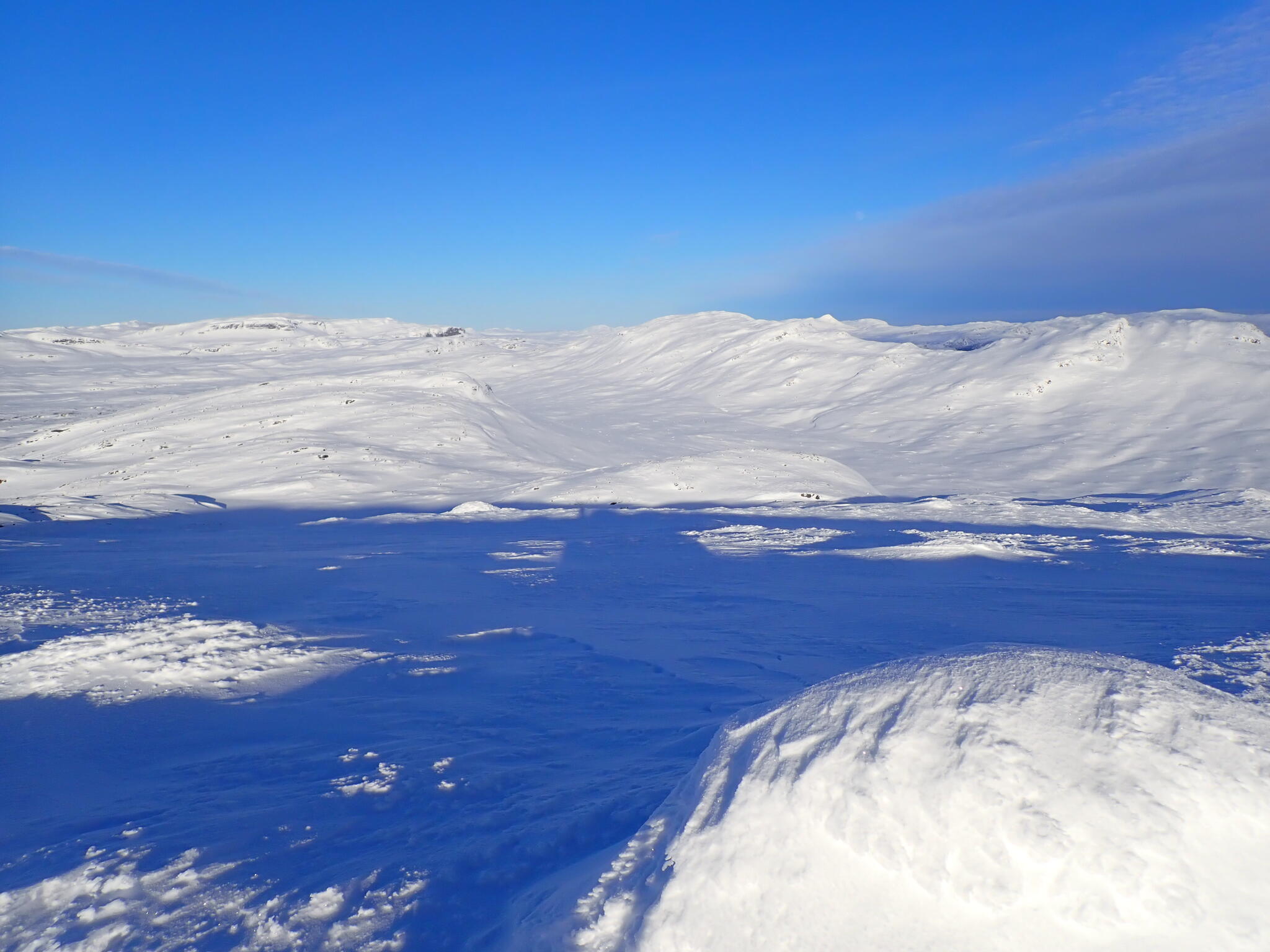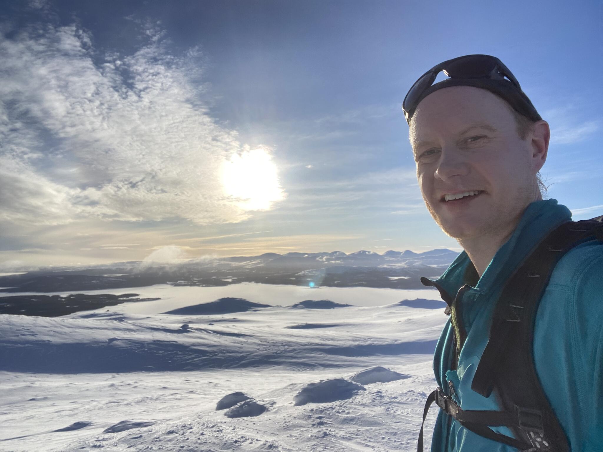 Vi korsade sjön och sedan följde några rätt tunga km där vi skidade uppför delvis på myrar och dels genom skog med djup lössnö. Detta var nog den jobbigaste delen av turen. Till slut kom vi upp på högt liggande myrar där snön var vindpackad. Äntligen!