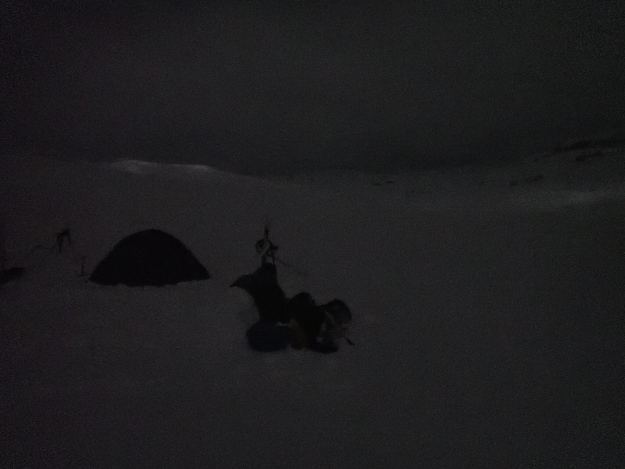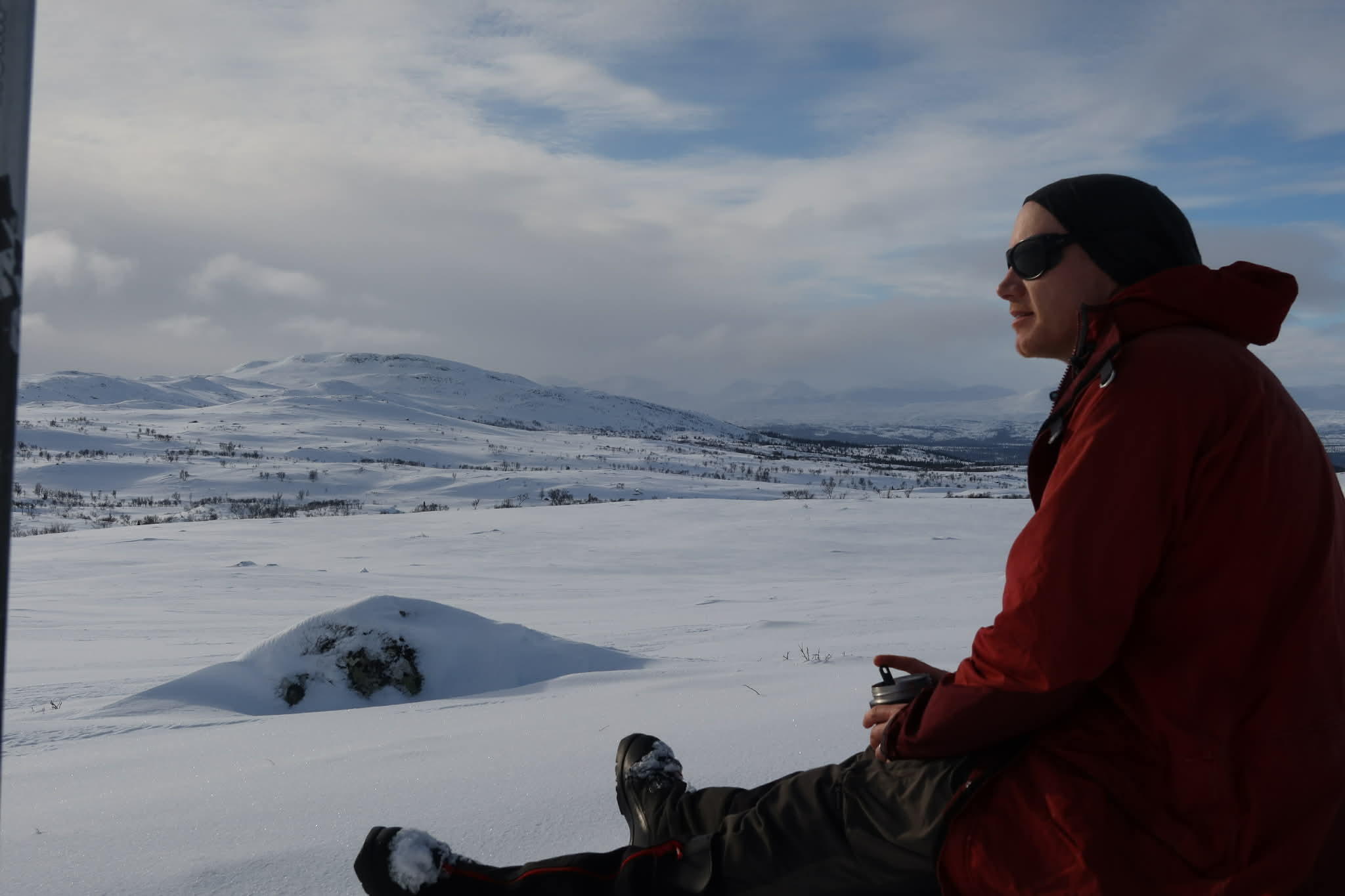 Vi skidade till kanten på en sjö. Sista biten blev det svårt att se konturer i snön, så vi fick skida försiktigt då det fanns mycket drivor och små bäckraviner att se upp för.