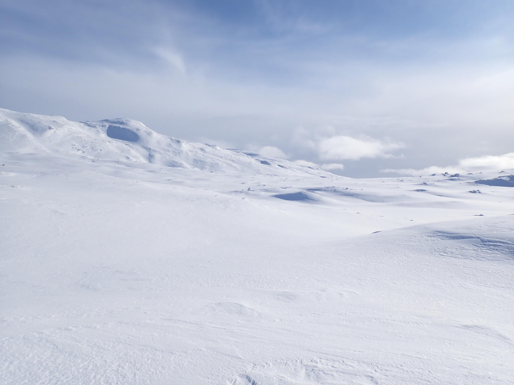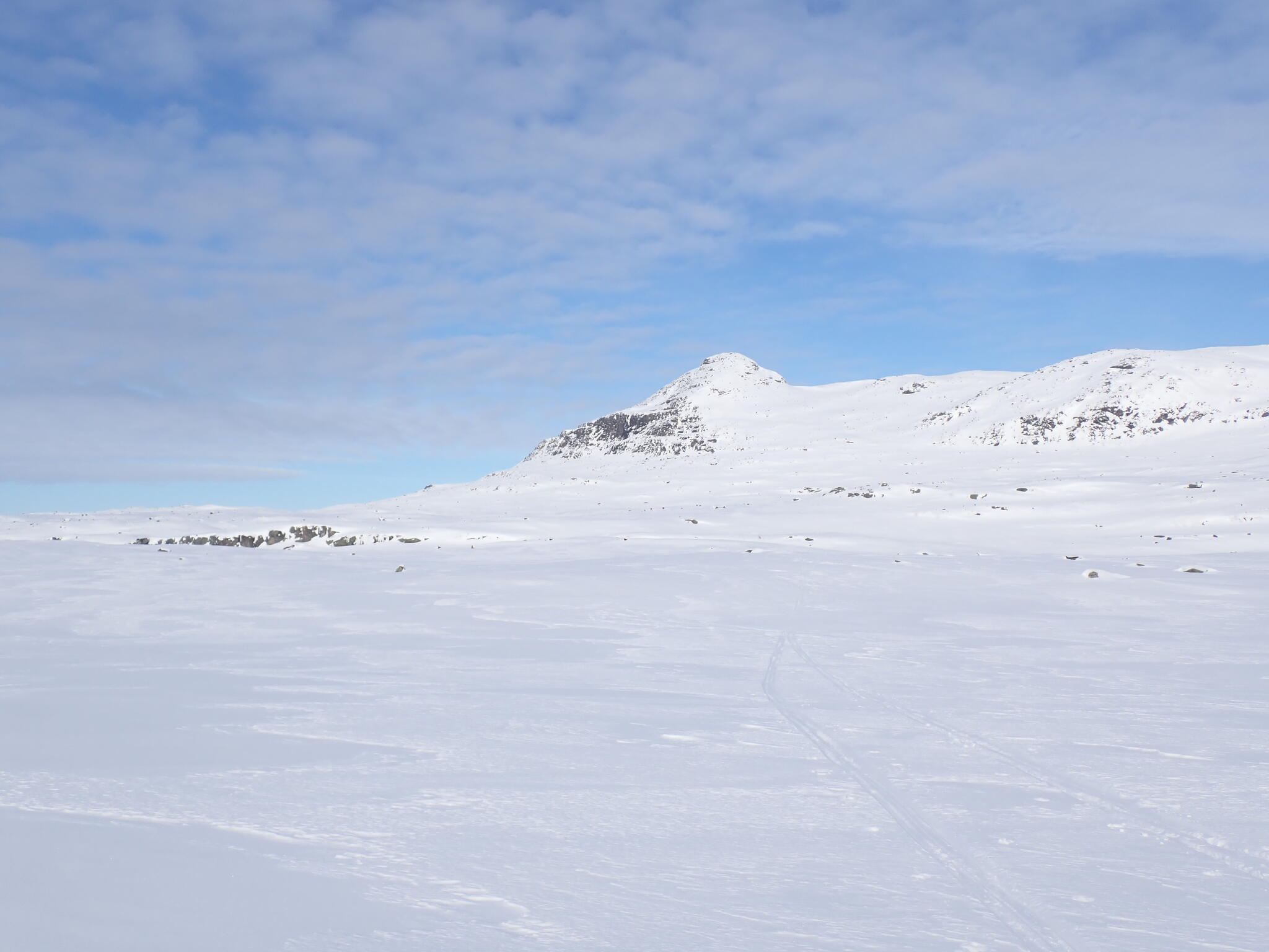 Vi rundade det branta lilla fjället Kyrkan och skidade åt sydöst och höll höjd längs med Flesåns dalgång. En liten förkastningsbrant skidade vi längs.