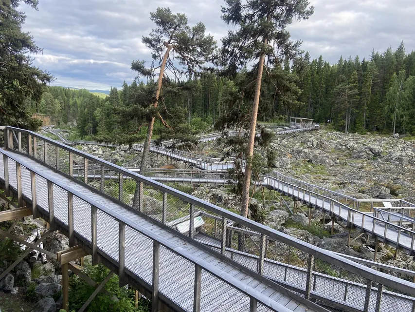 Vi gjorde ett kortare stopp på Döda fallet. Kul och intressant att gå runt där och leta efter jättegrytor. Och så fina skyltar de satt upp där, som får en att tänka sig in hur det var på tiden när döda fallet bildades.