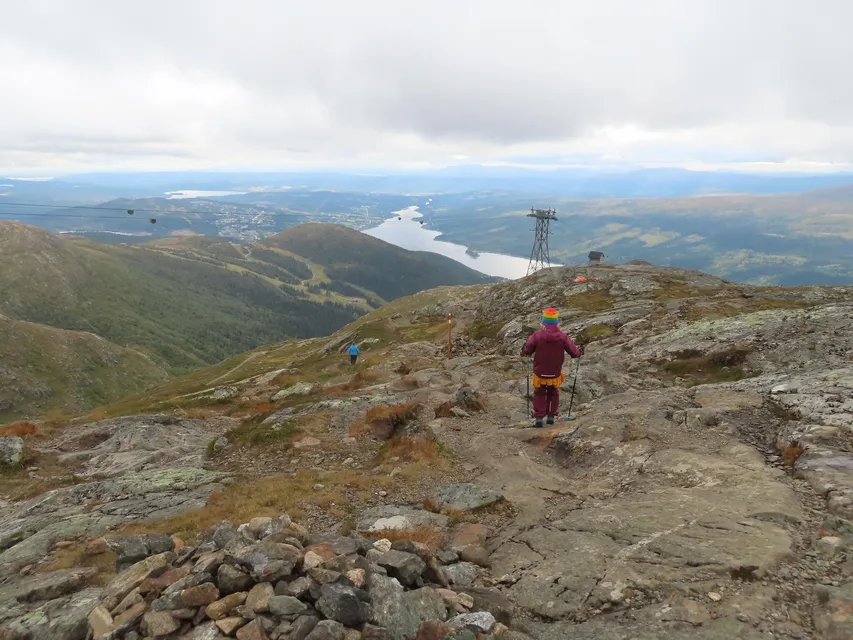 Vi tog kabinbana upp i dimman. Från kabinbanans toppstation gick vi den branta leden upp till toppstugan, som även är Sveriges högst belägna café.