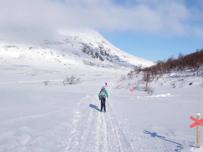 Efter att ha skidat över ån följde vi ett skidspår som zickzackade upp mot fjället Skallen.