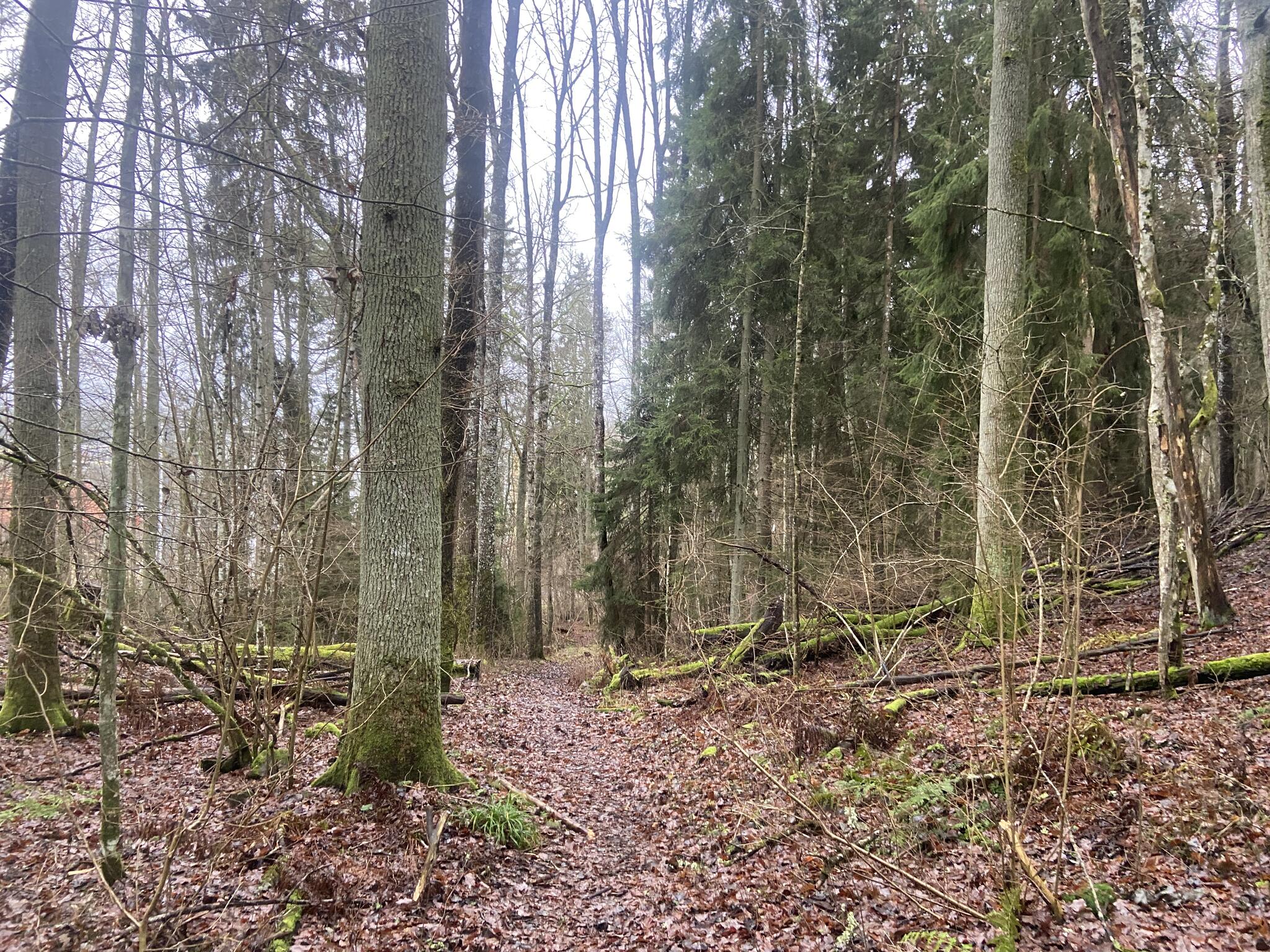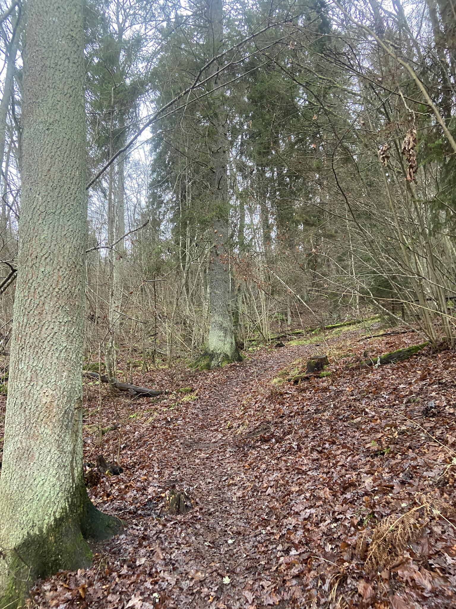 Jag kan tänka mig hur fint det är i denna skog under vår och sommar. Massor med hassel och andra lövträd. Vitsippor finns det mycket av. Och fågelsång.