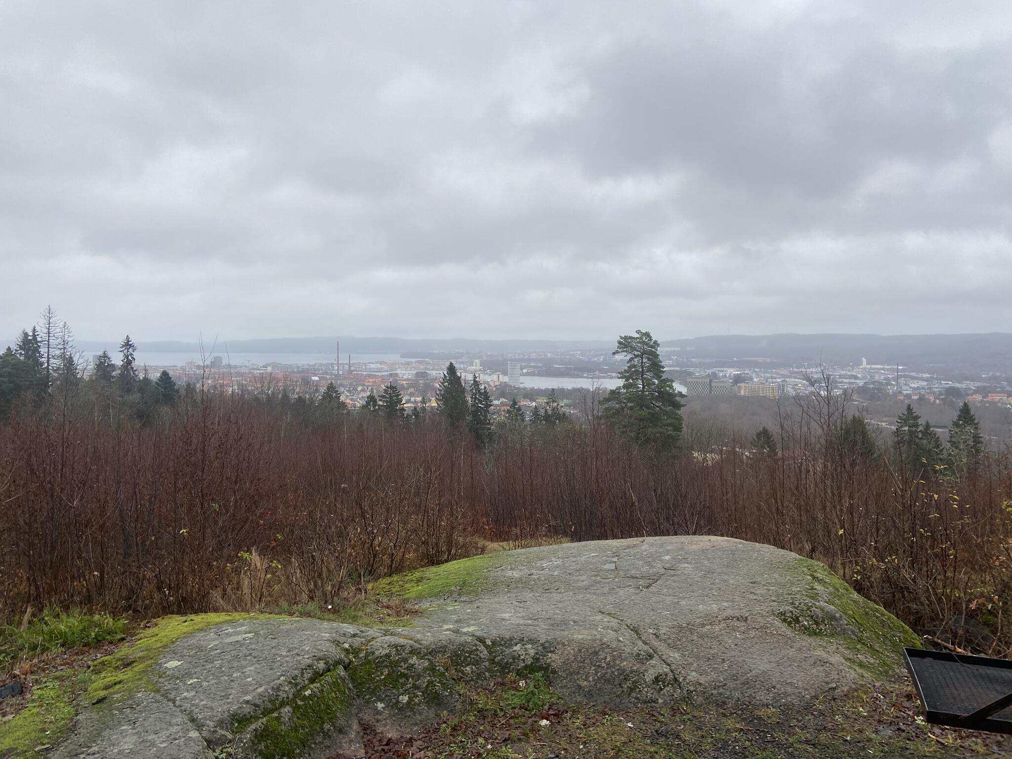 Fin utsikt här på Odensberg. Vi hade tänkt grilla korv här på eldstaden. Och oj vad vi försökte. Det gick åt många tändstickor. Fukt i luften och i veden gjorde det svårt. Till slut fick vi ge upp. Istället för grillade korv blev det stek korv hemma på spisen. Men det funkade det med.