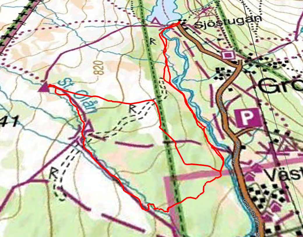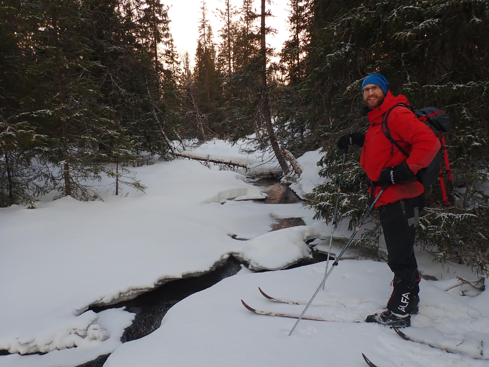 När myrarna längs Grövlan tog slut skidade vi upp i skogen, tills vi mötte Olån. Den följde vi sedan mer eller mindre till vindskyddet.
