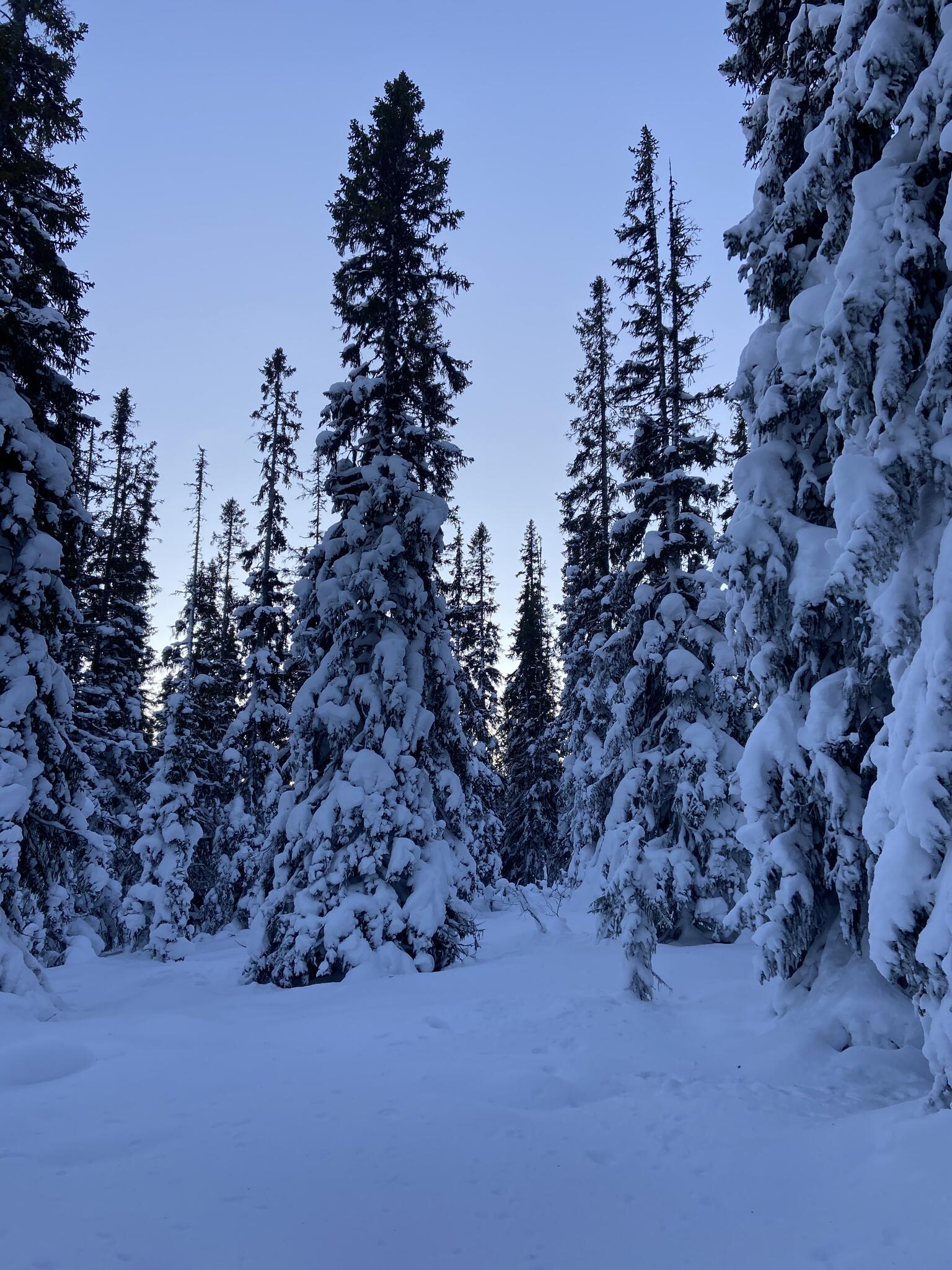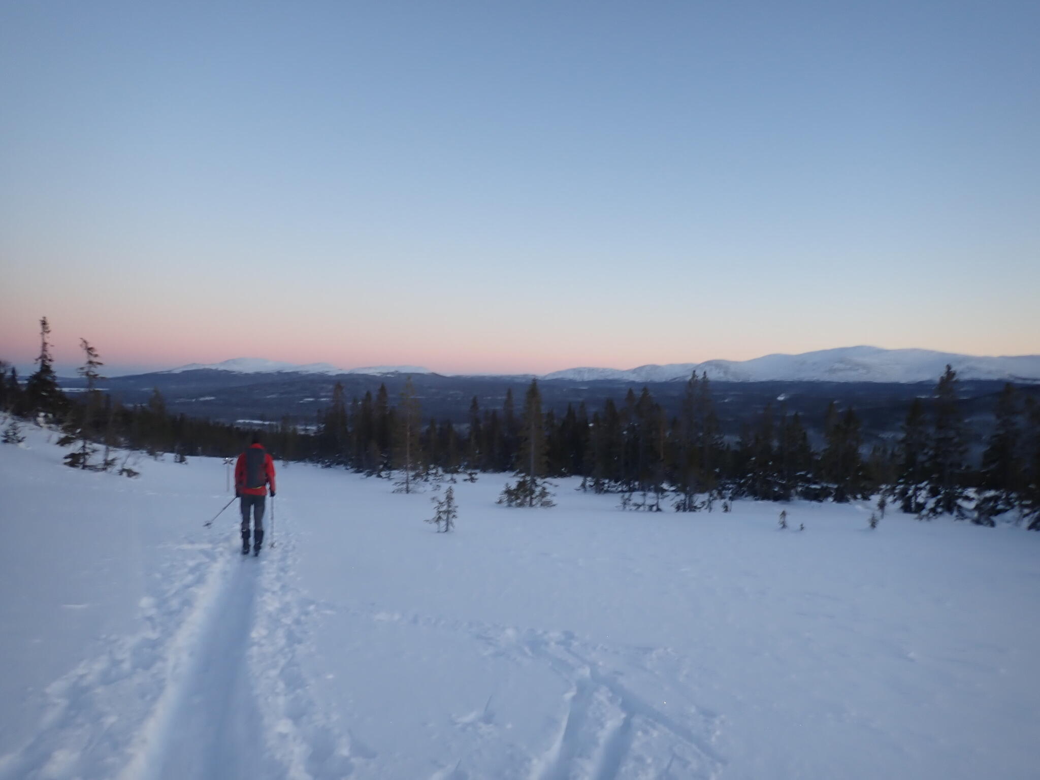 När vi kom ner till våra spår där det fanns mjuk snö blev det en jättefin och avslappnad nerfart. Vi stod och gled neråt i våra spår. Staka behövde man göra ibland. Skymningsljus och pudersnö i en jättefin skog. En skön avslutning på en fin tur.