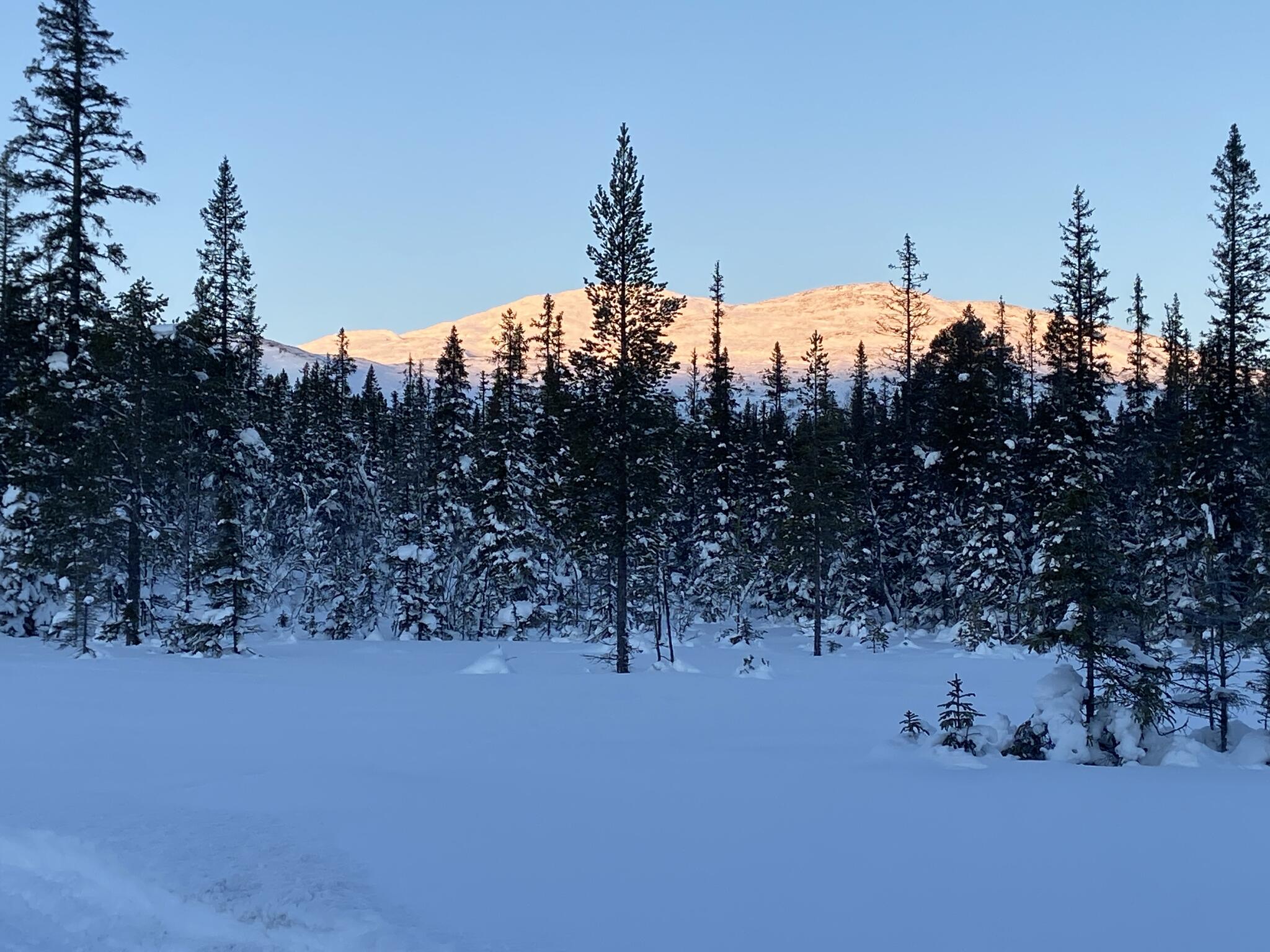Ottjället i gryningsljus skymtar mellan träden.När vi kom upp i solen kändes det inte så kallt längre. Dags för stighudar på skidorna här.