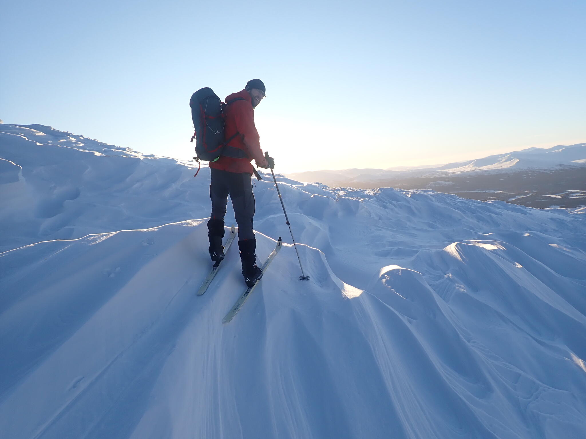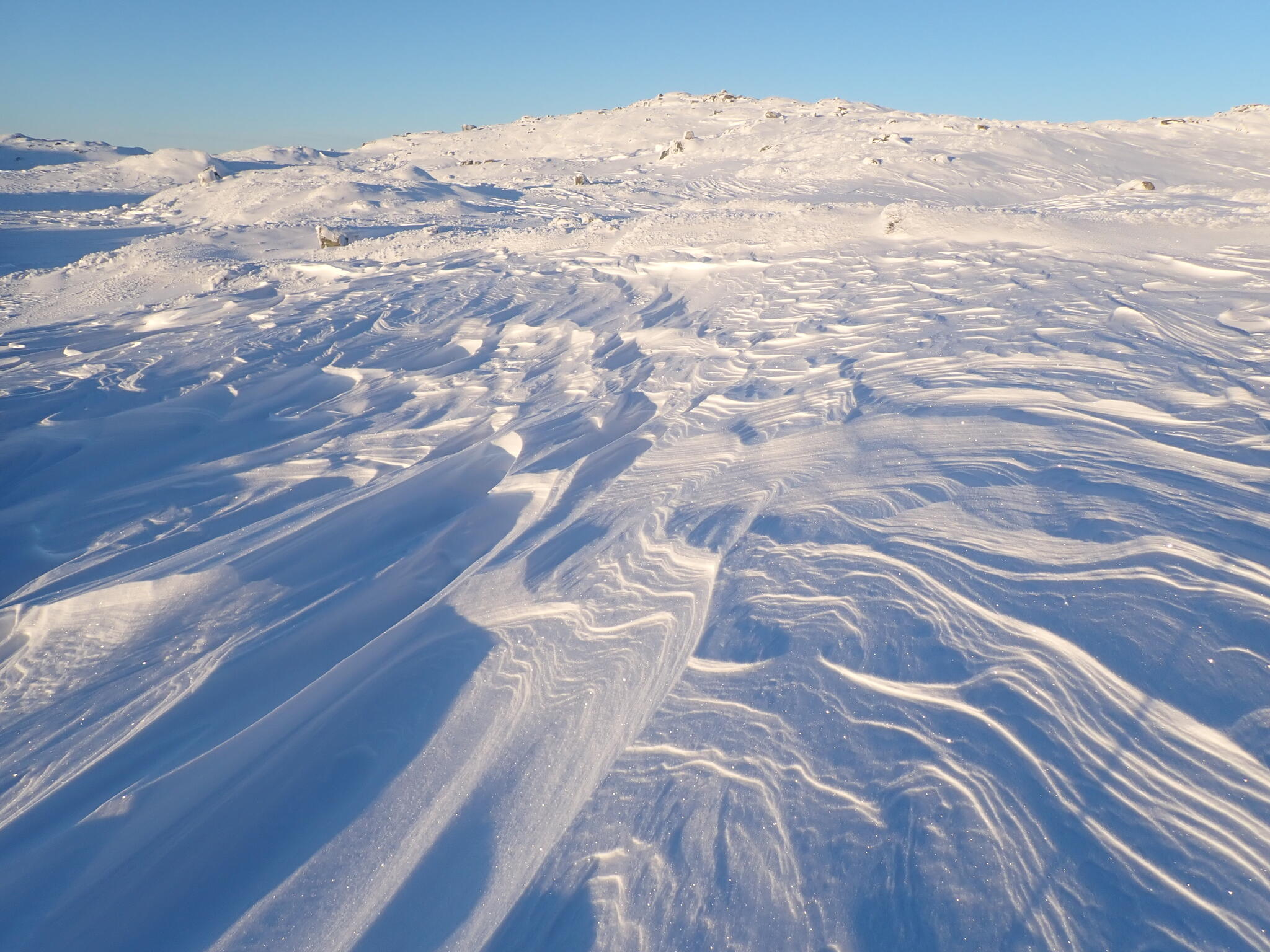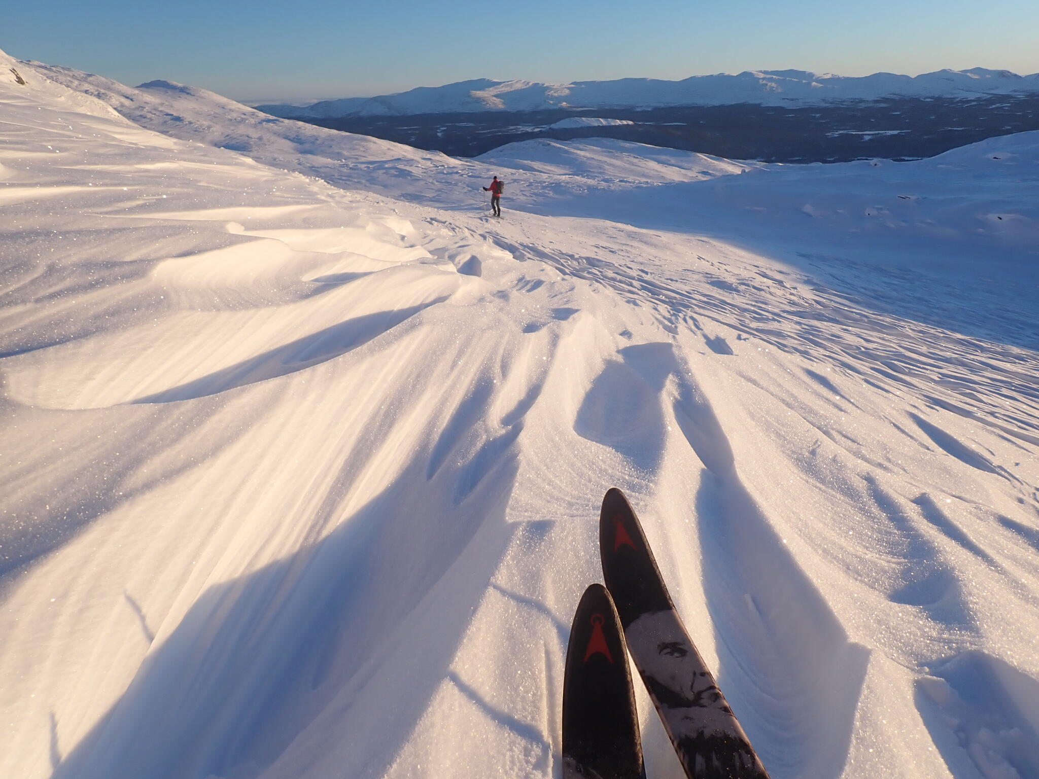 När vi kom upp på de lite mer vindexponerade områdena fanns det nästan ingen pudersnö. Allt vitt var antingen is eller vindpackad snö.