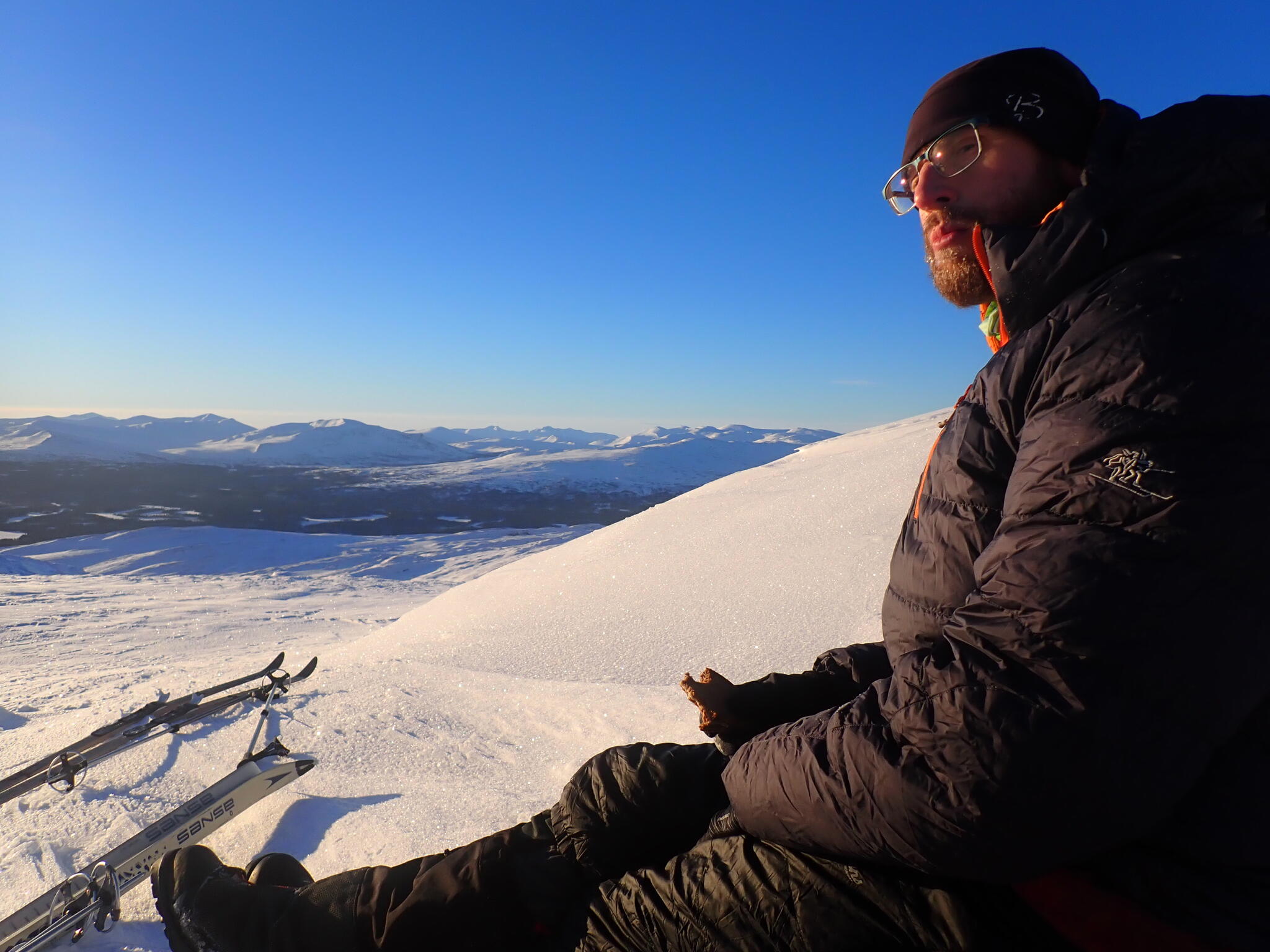 Efter Östtoppen skidade vi lite nerför västerut på den hårt packade snön till ett lämpligt lunchställe. Sol och inte mycket vind ville vi ha.