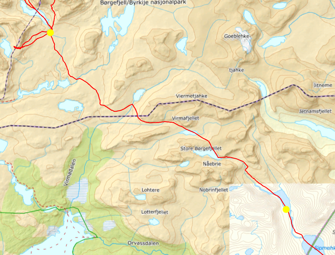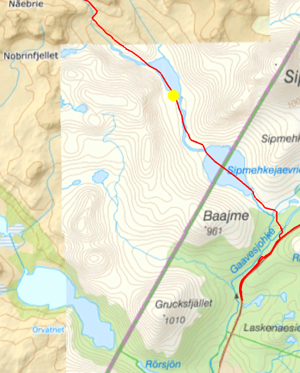 Lunchdags på en damm, ev från gruvbrytning. Fjället Sipmehke i bakgrunden. Foto: Kristofer BjörkmanSnart framme vid Sipmehke. Foto: Kristofer BjörkmanJetnamnsklumpen vill jag besöka någon dag.Vi funderade på vägval och tältplats.