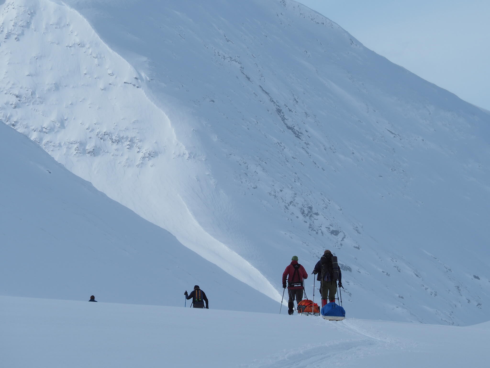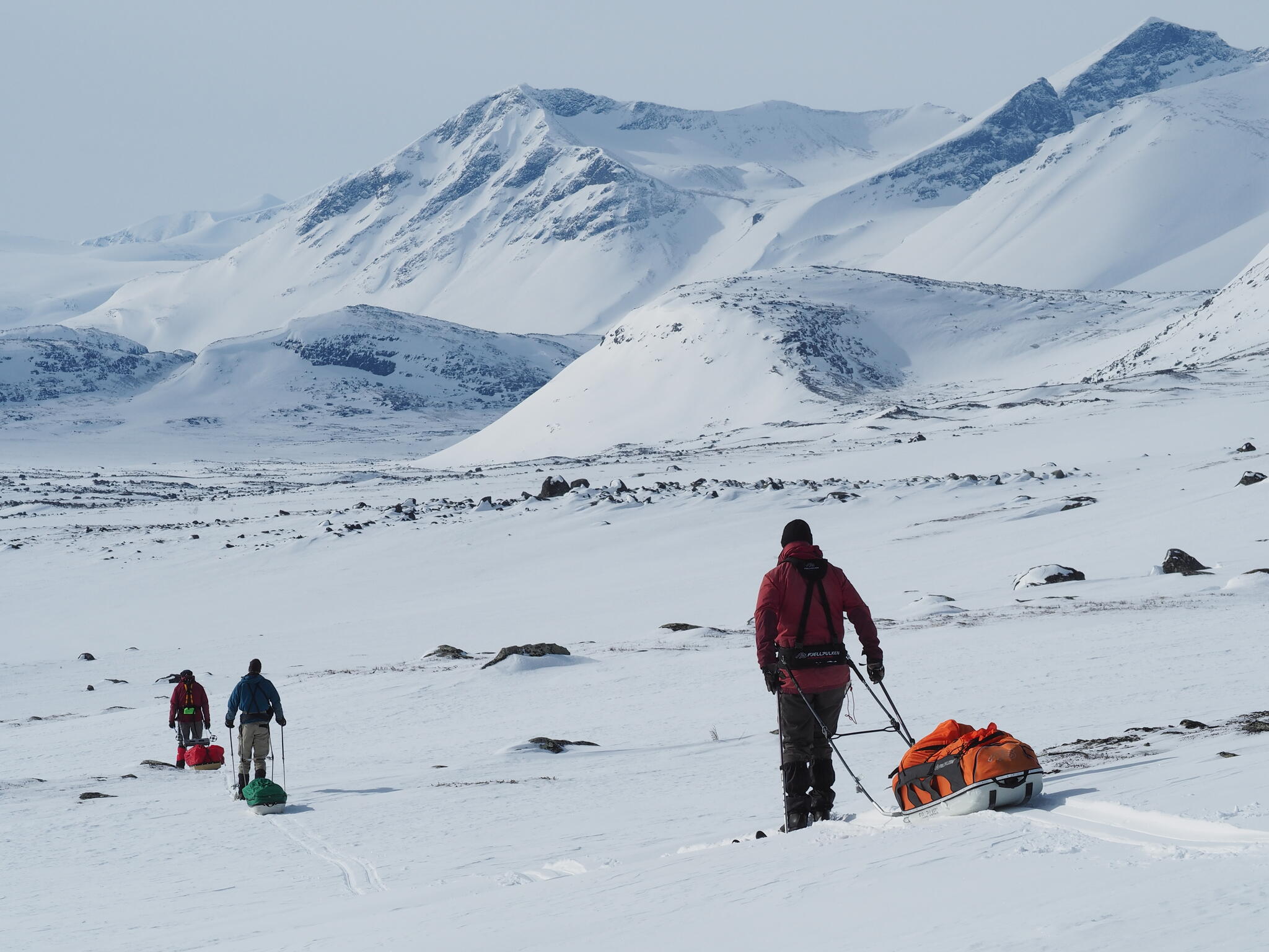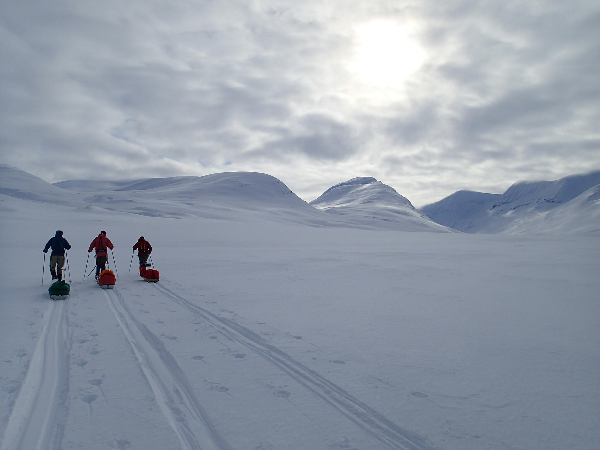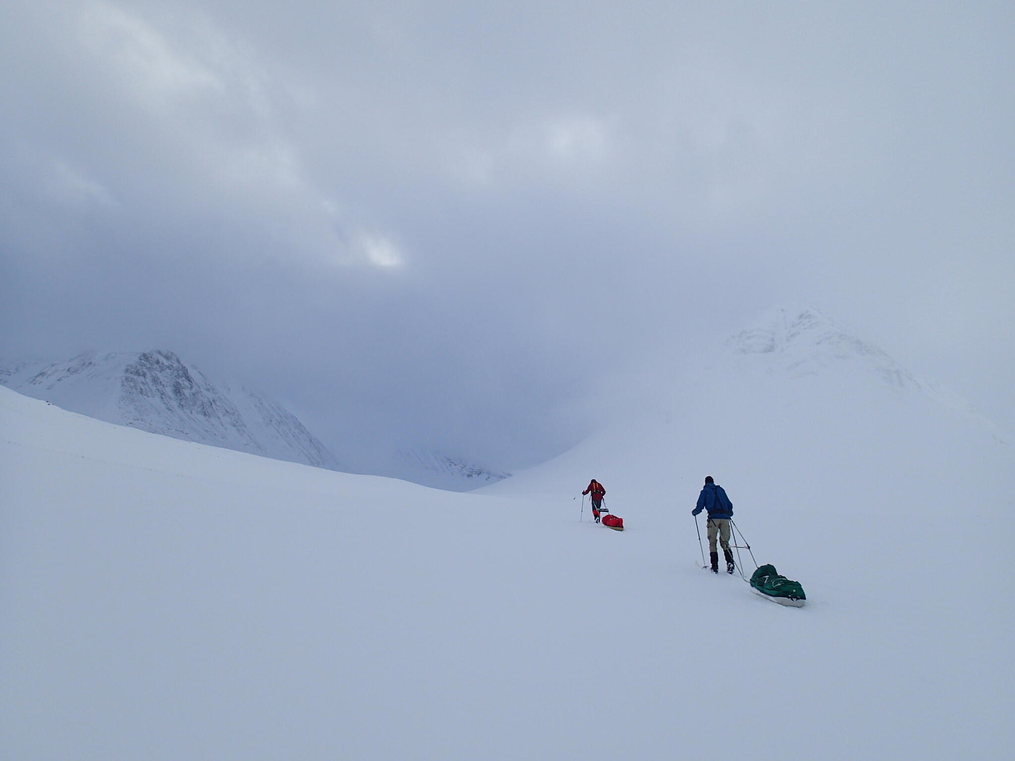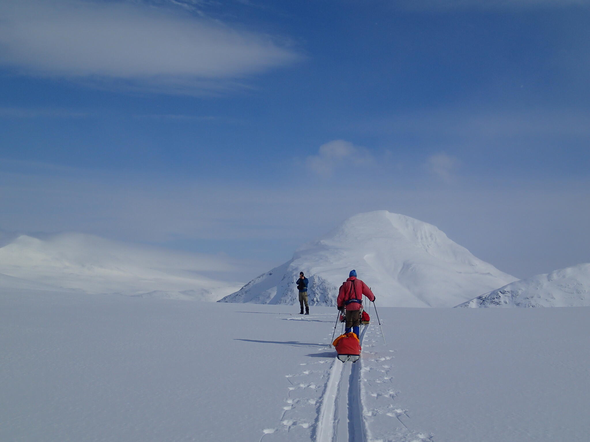 Mot slutet av dagen mötte vi två svenskar med full-lastade pulkor. De hade bl a två snökiter var och topptursskidor. Det såg tungt ut.