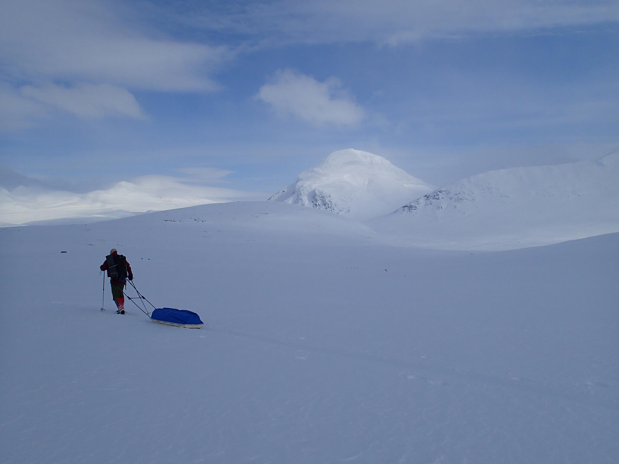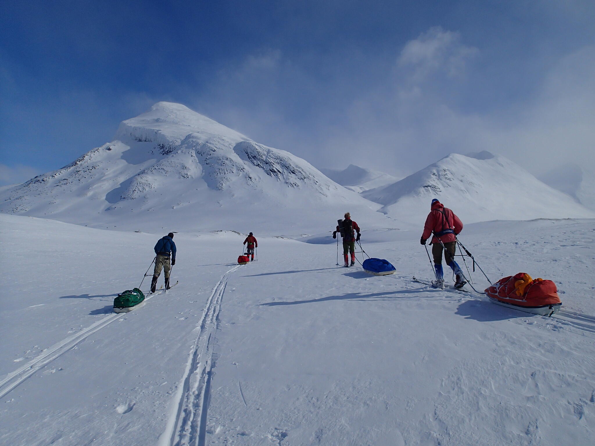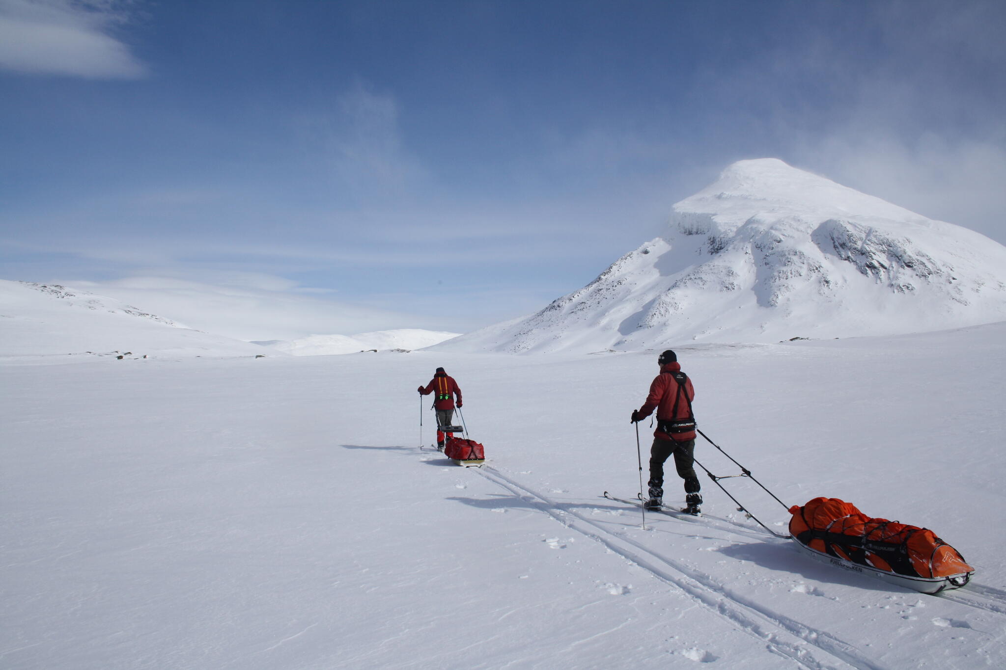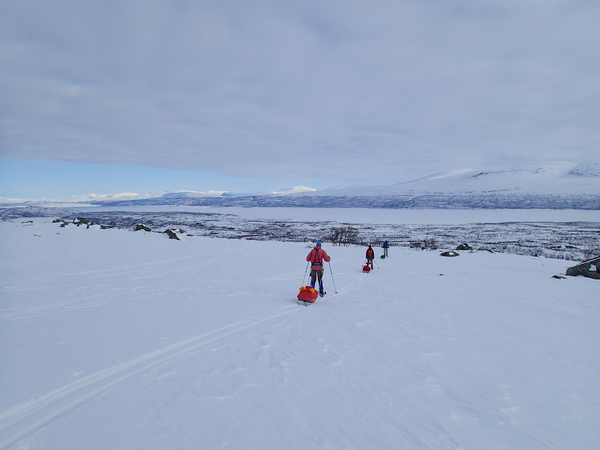Mot slutet av dagen mötte vi två svenskar med full-lastade pulkor. De hade bl a två snökiter var och topptursskidor. Det såg tungt ut.