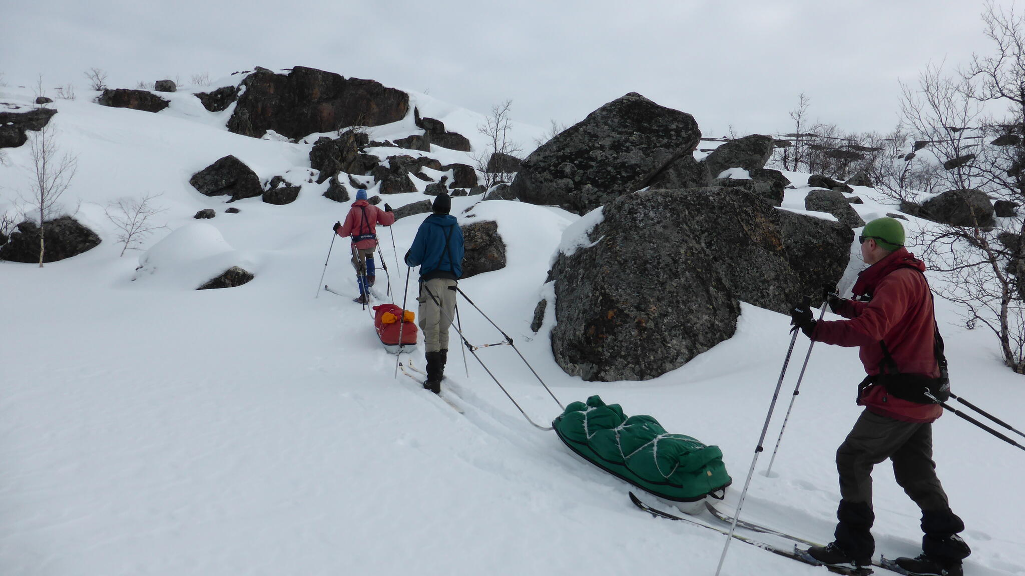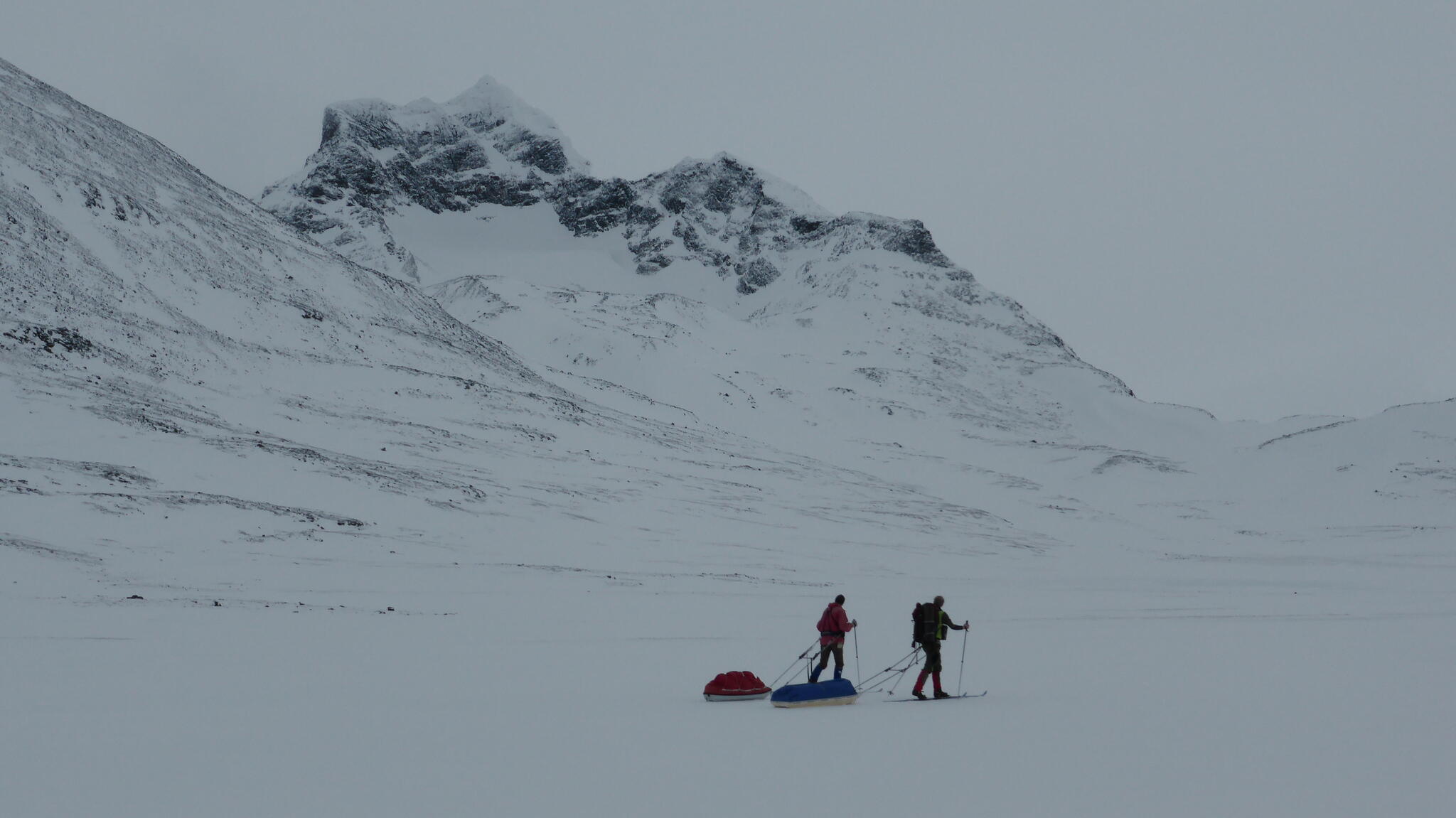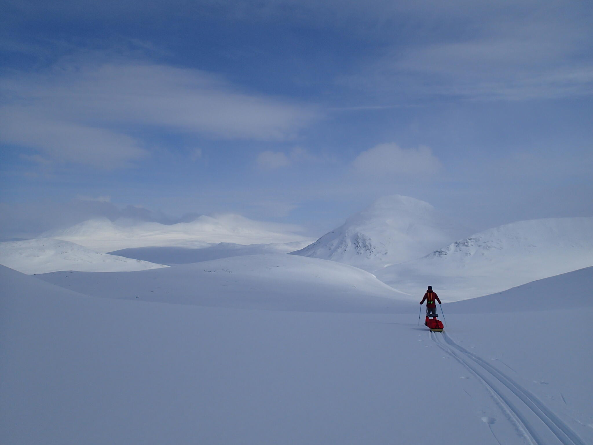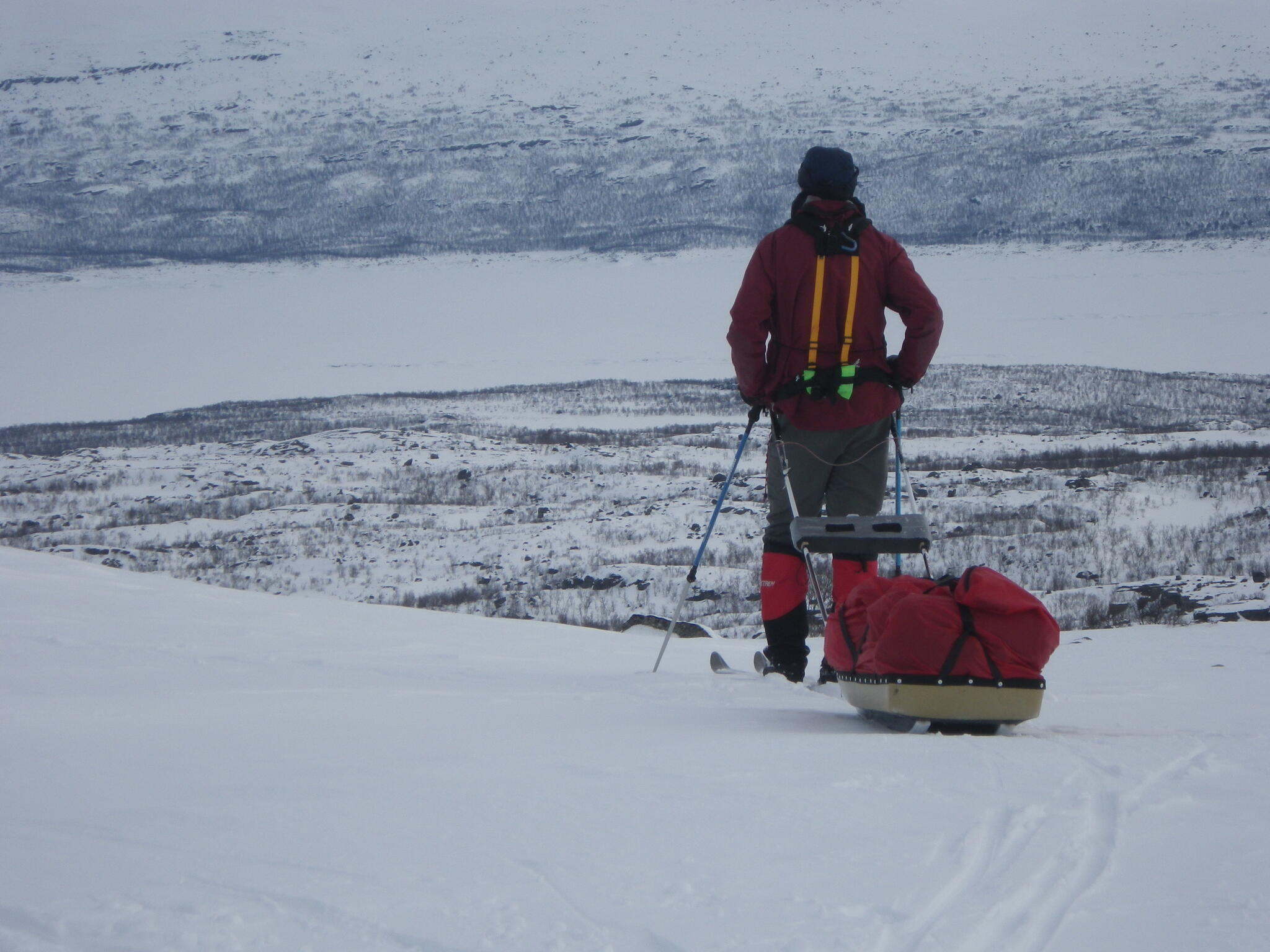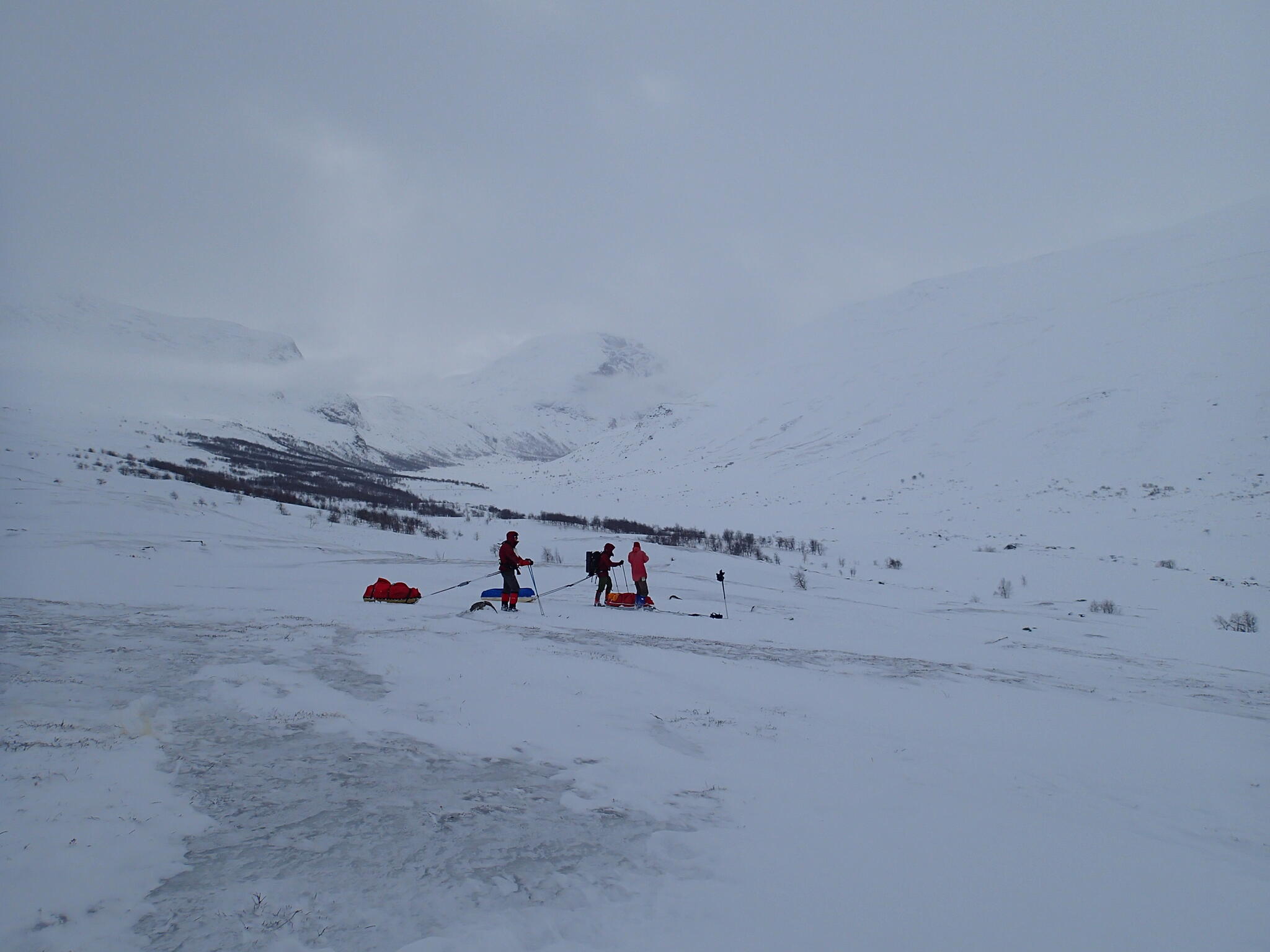 Mot slutet av dagen mötte vi två svenskar med full-lastade pulkor. De hade bl a två snökiter var och topptursskidor. Det såg tungt ut.