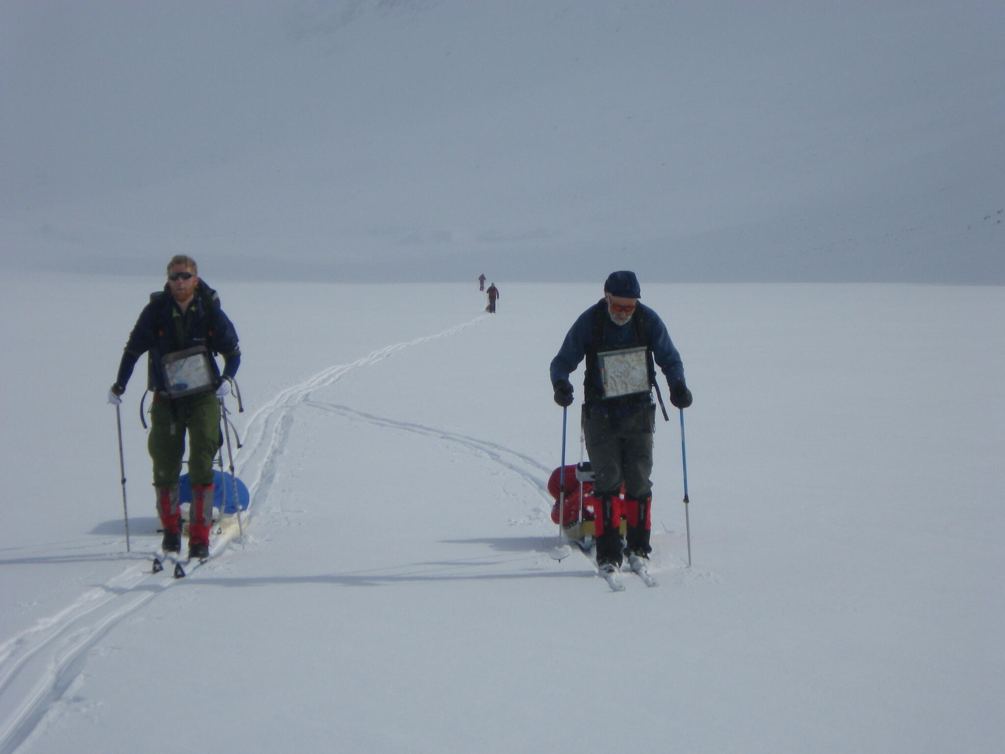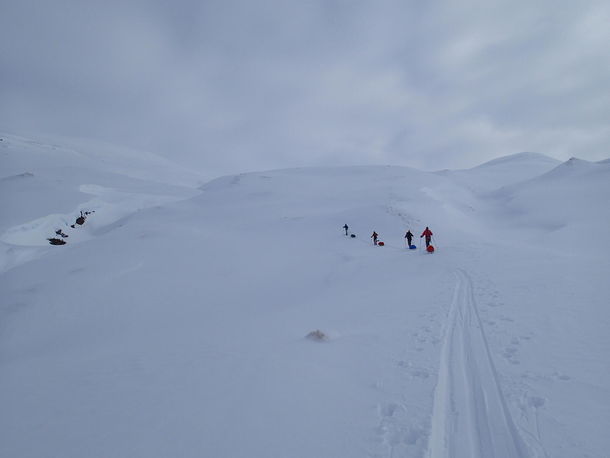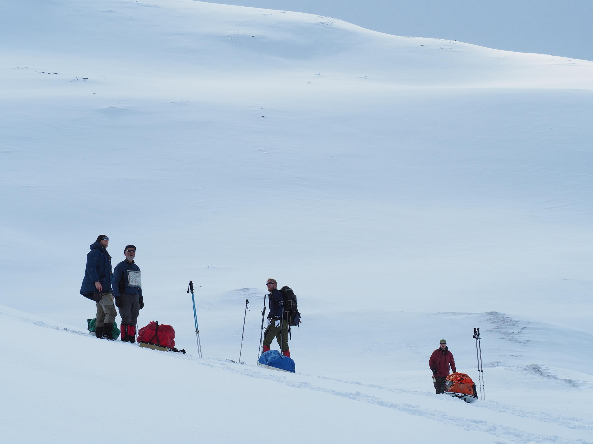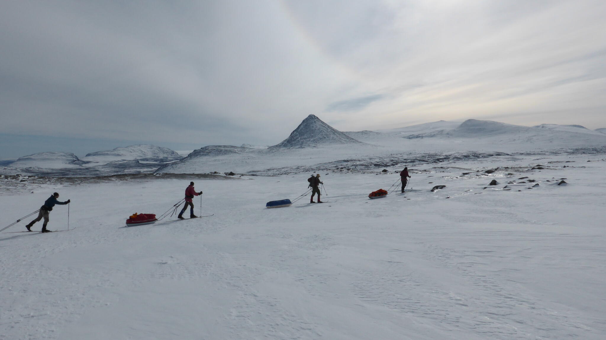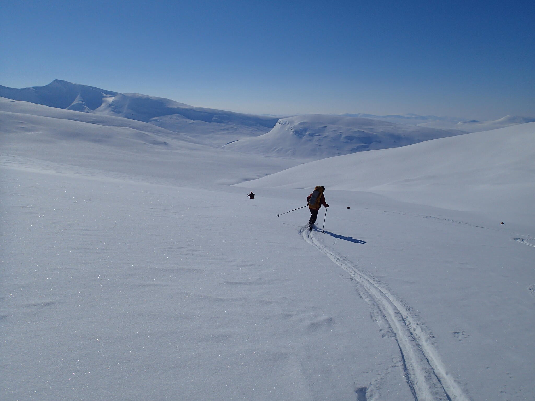 Mot slutet av dagen mötte vi två svenskar med full-lastade pulkor. De hade bl a två snökiter var och topptursskidor. Det såg tungt ut.
