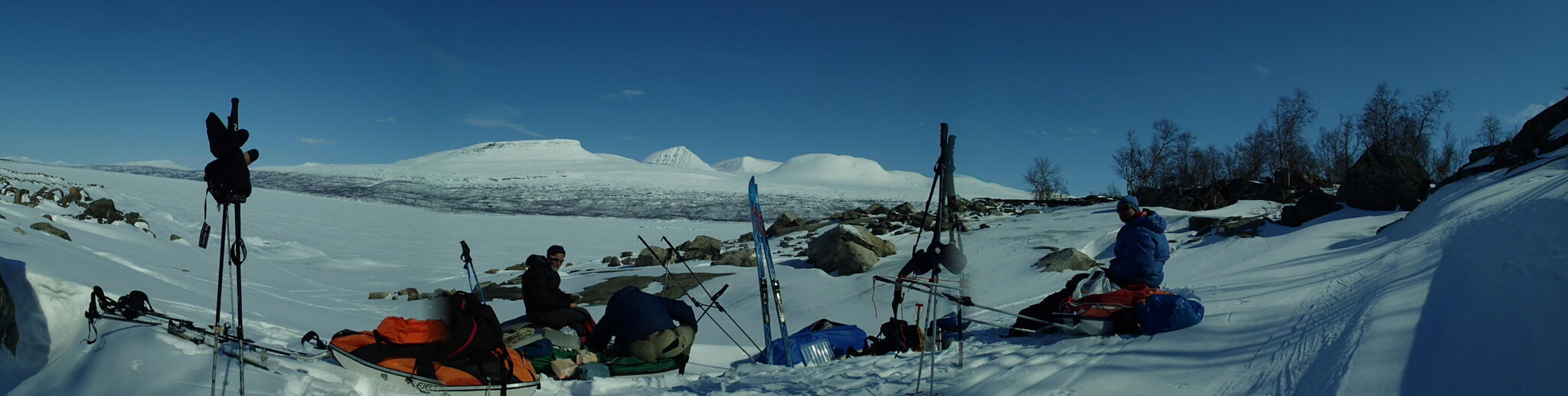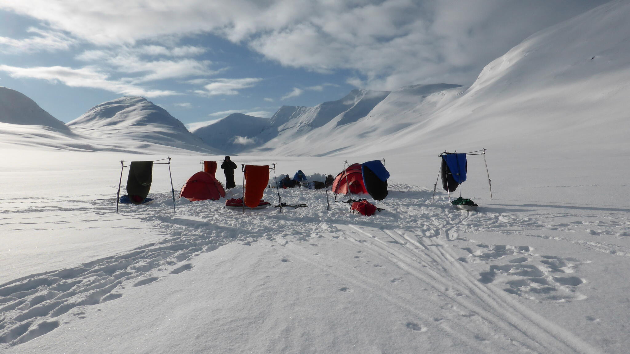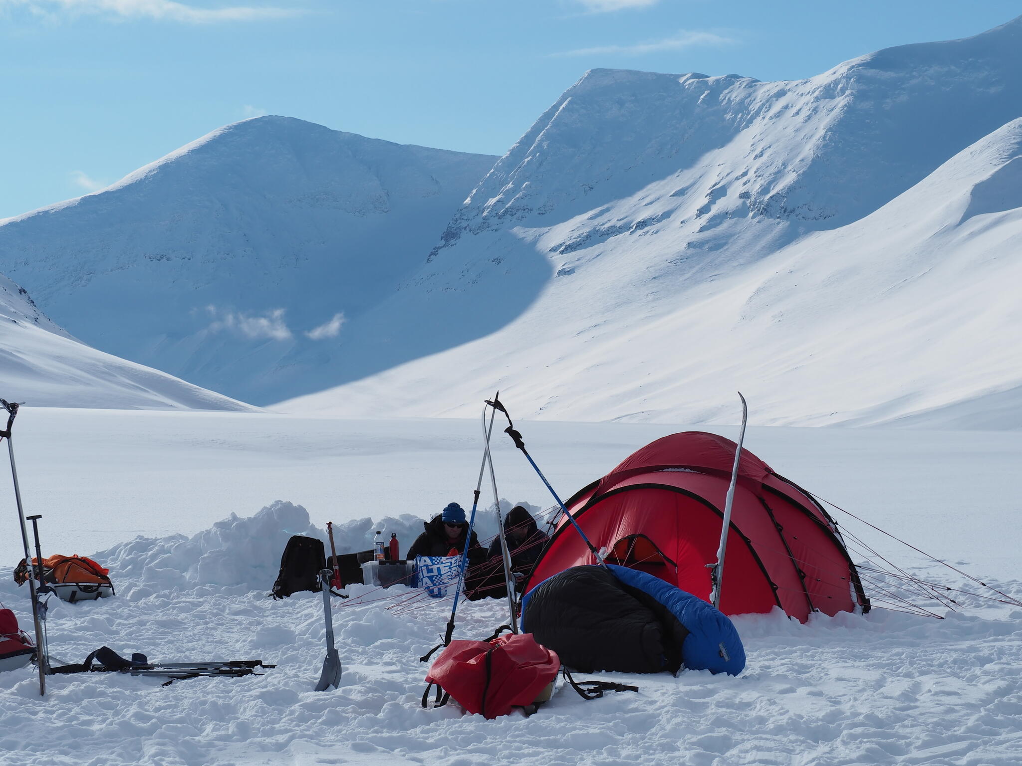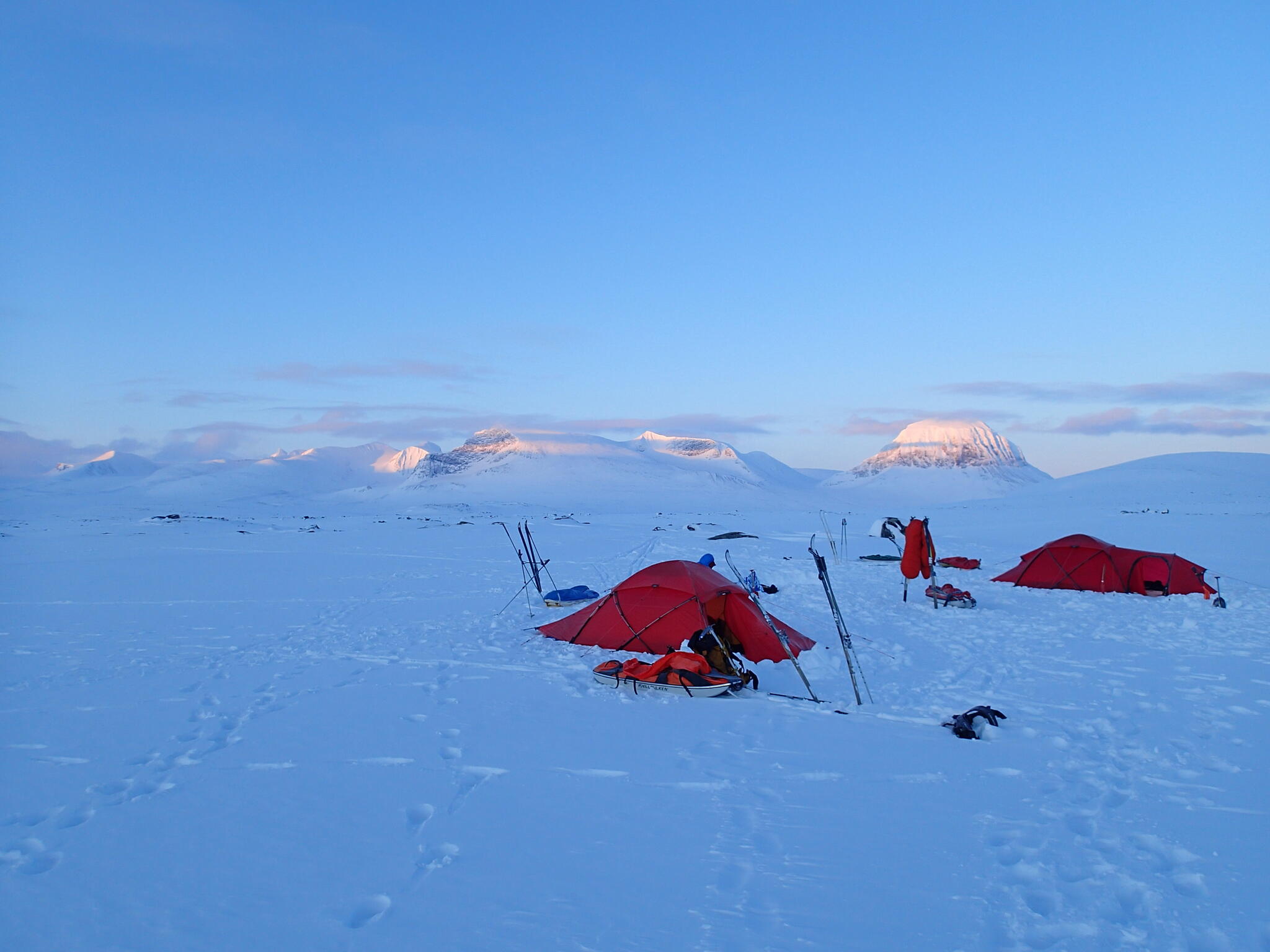 När det började bli dags för att sätta upp tälten hade vi skidat en bit in i dalen Guopervagge. Vi var när där vi dagen efter vill skida upp mot platån i Ruotes-massivet.