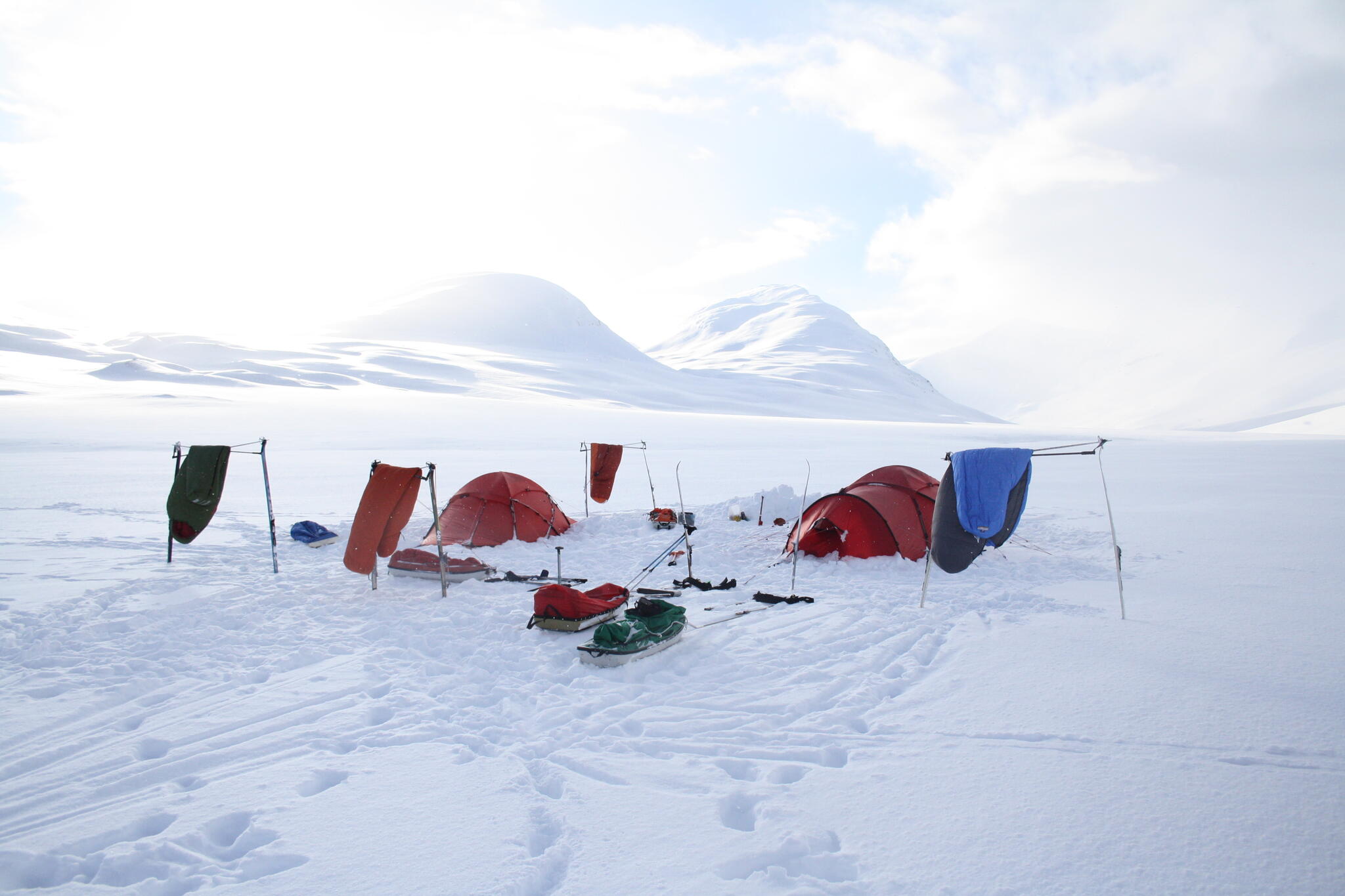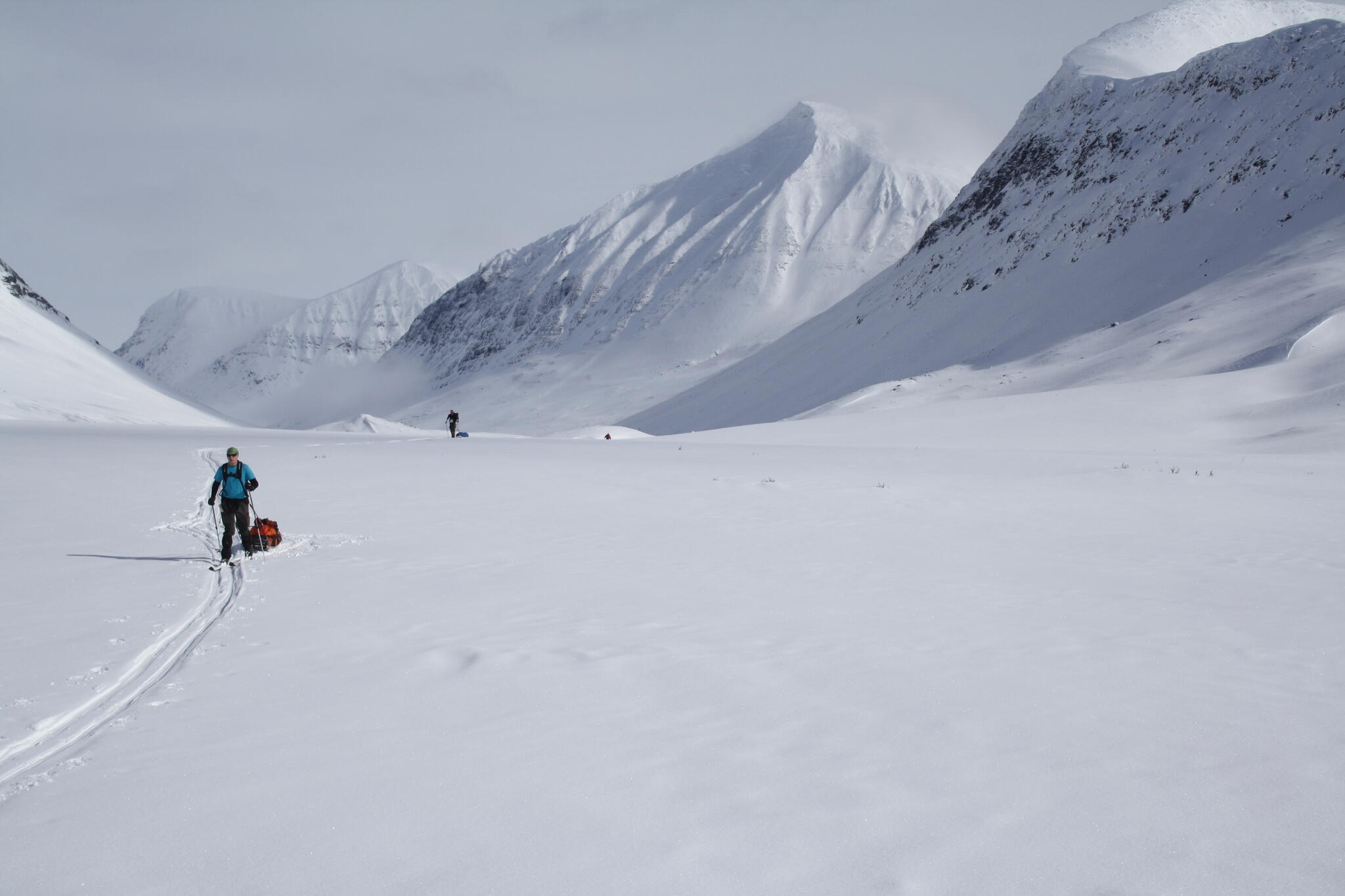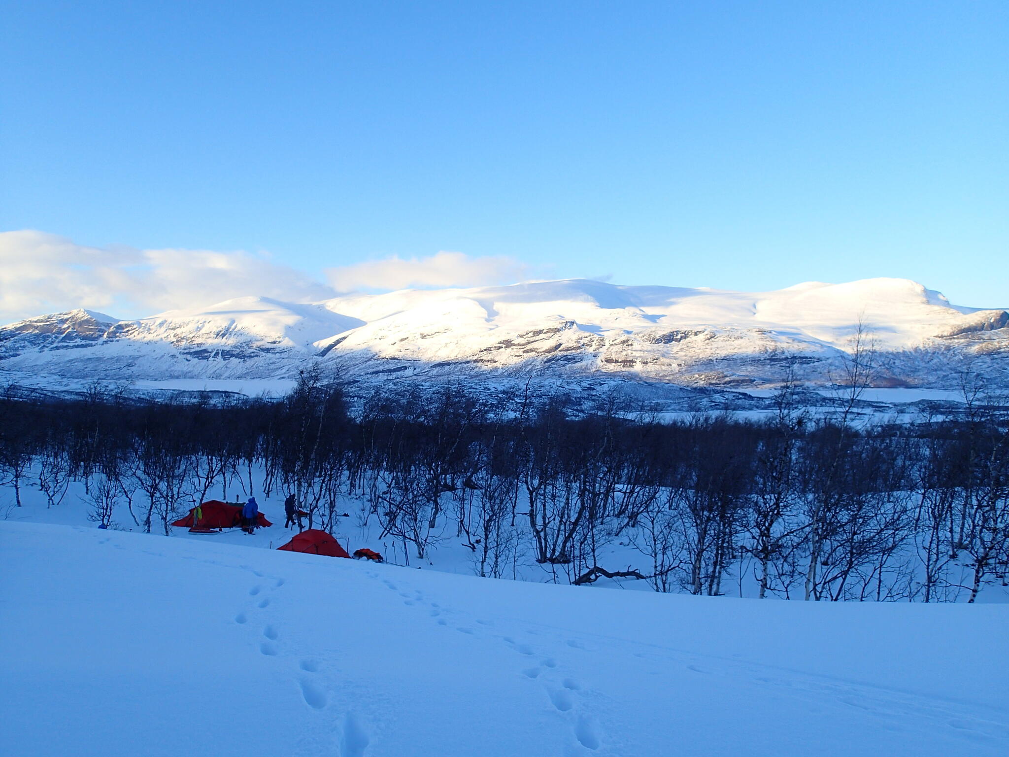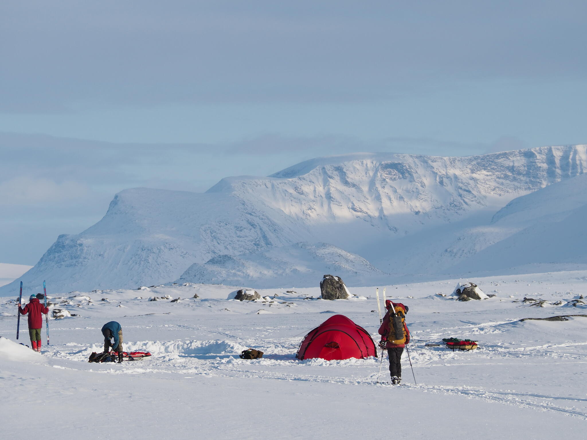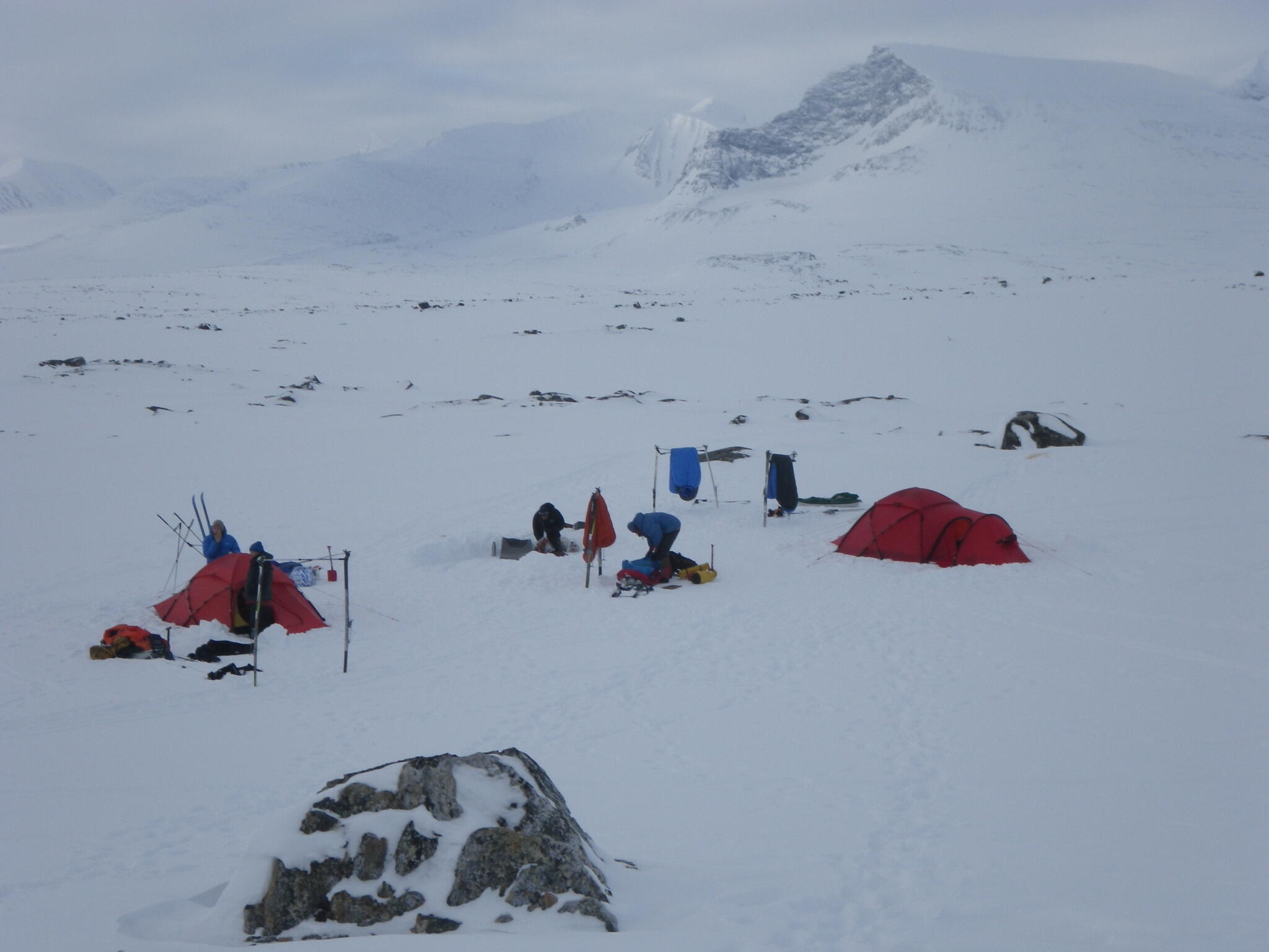 När det började bli dags för att sätta upp tälten hade vi skidat en bit in i dalen Guopervagge. Vi var när där vi dagen efter vill skida upp mot platån i Ruotes-massivet.