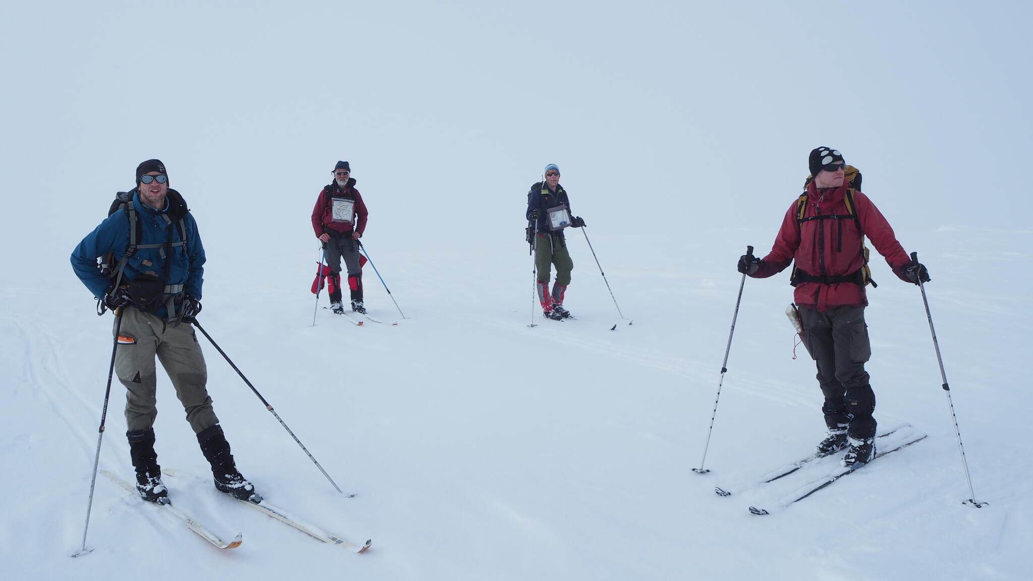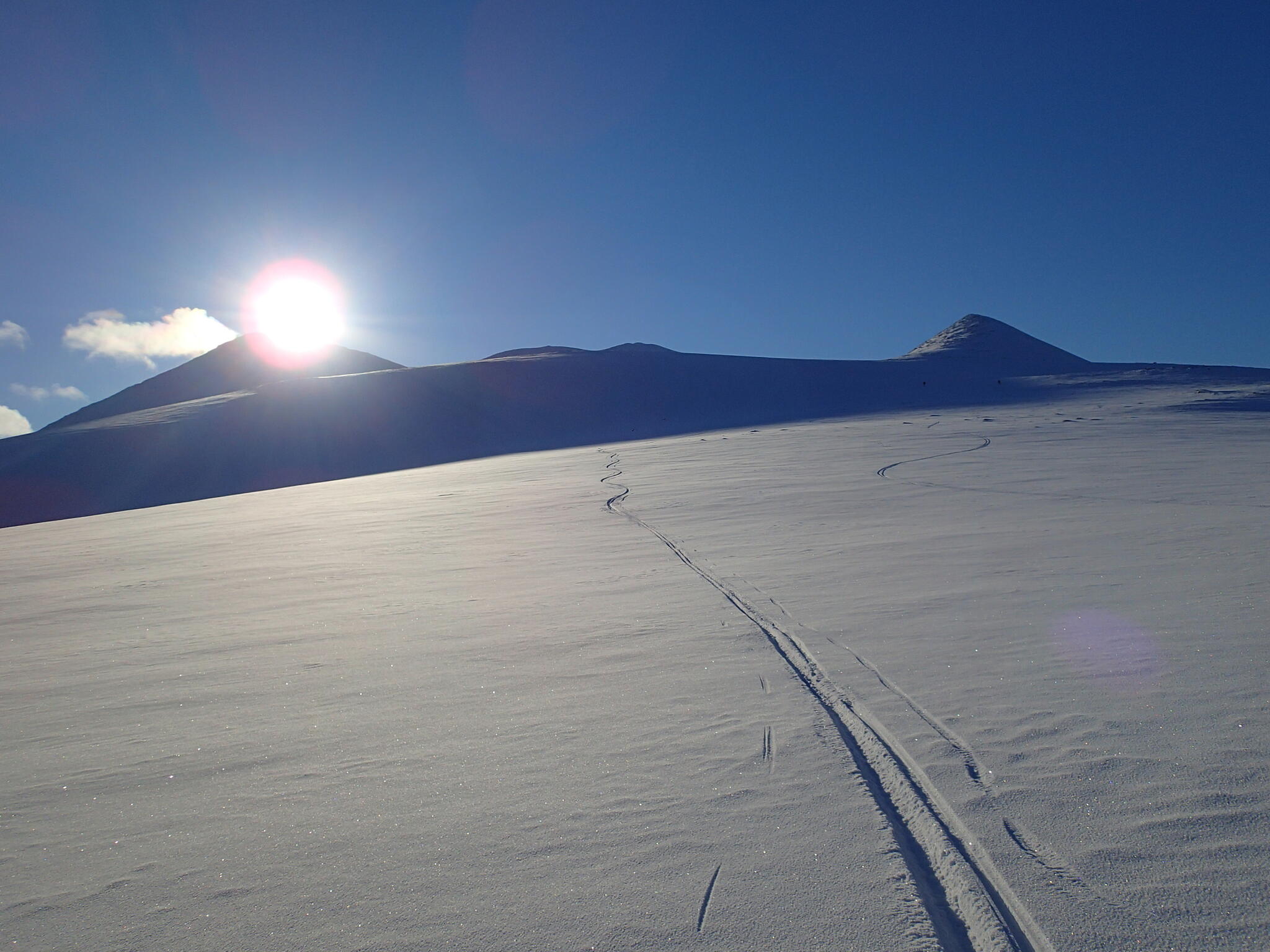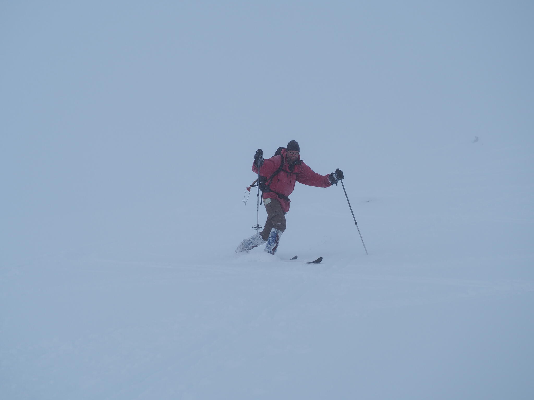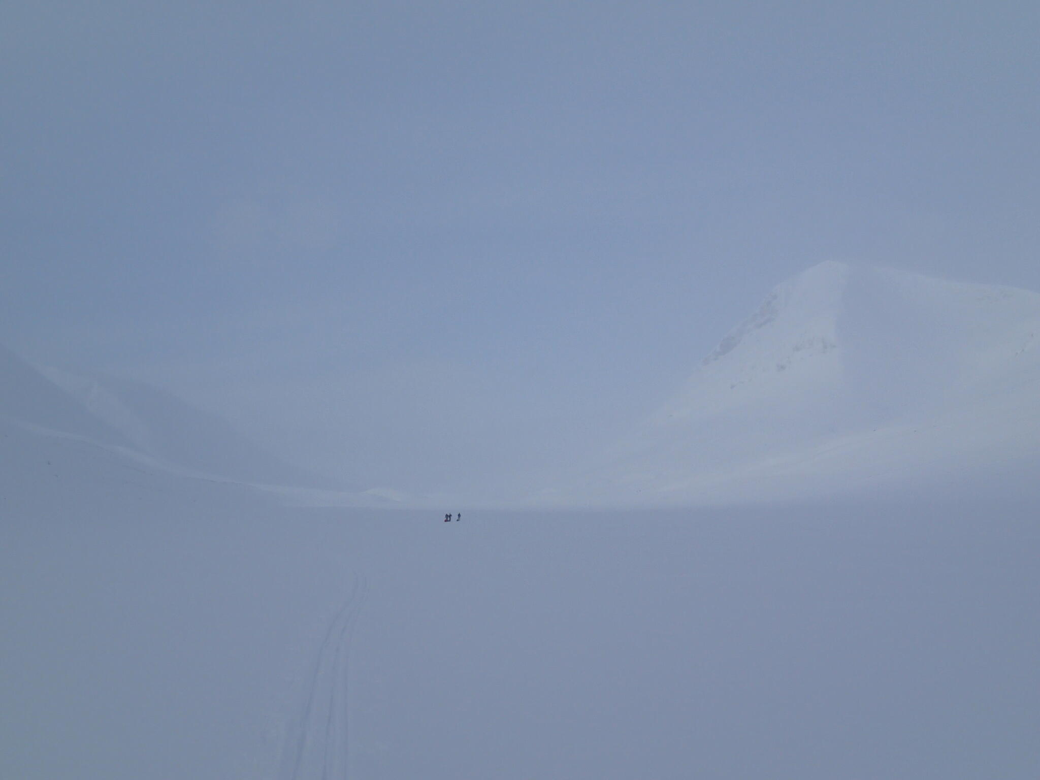 Skidåkningen började med att vi skidade nerför en fin nersbacke norrut i pudersnö. Ett par år tidigare lät vi bli att göra samma nerfart, pga dålig sikt.