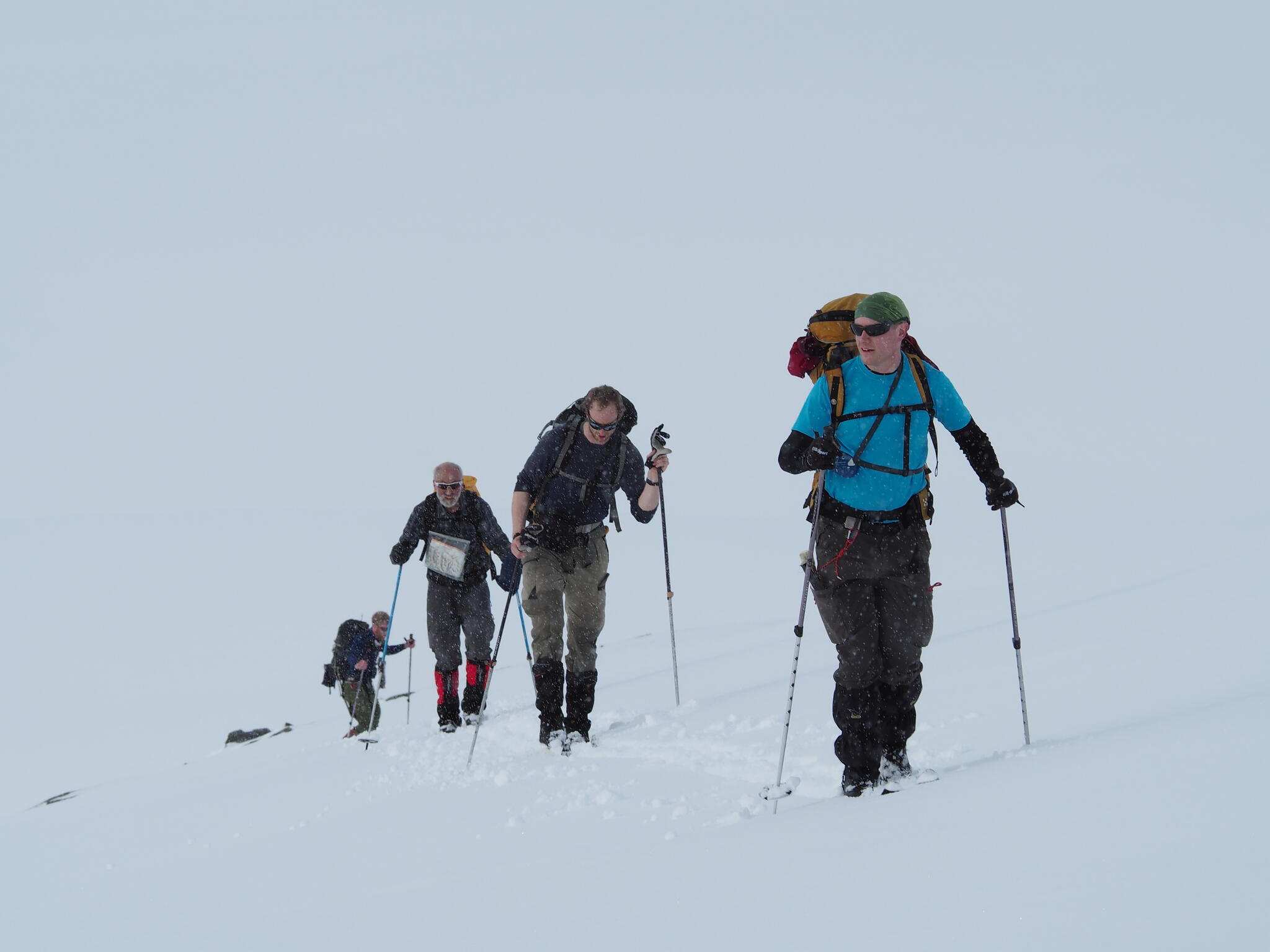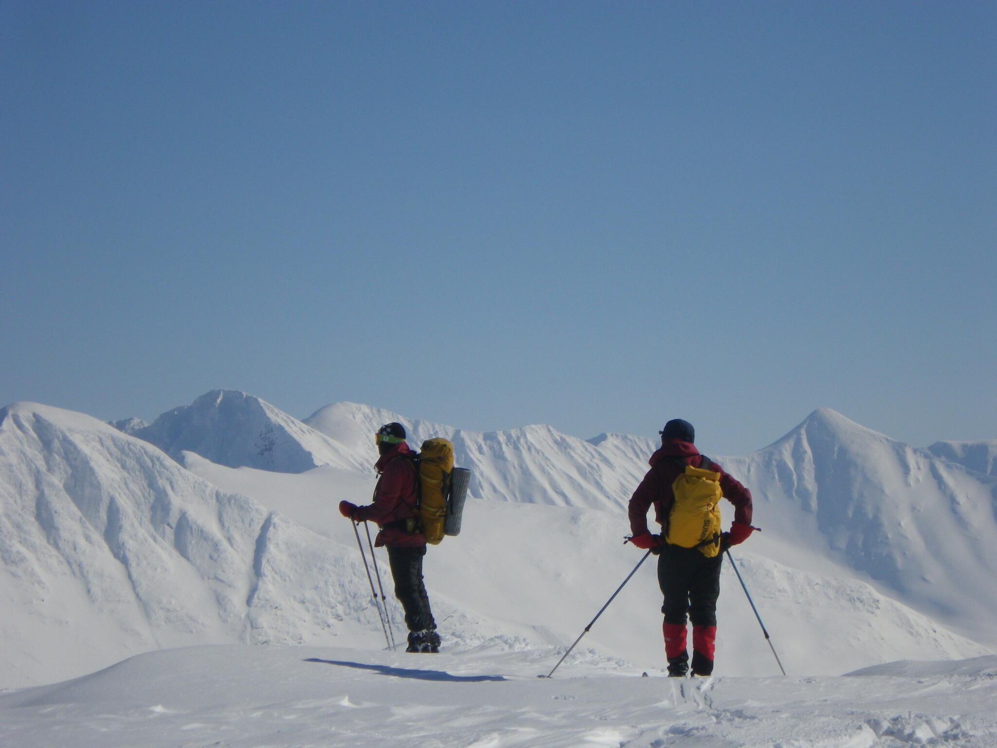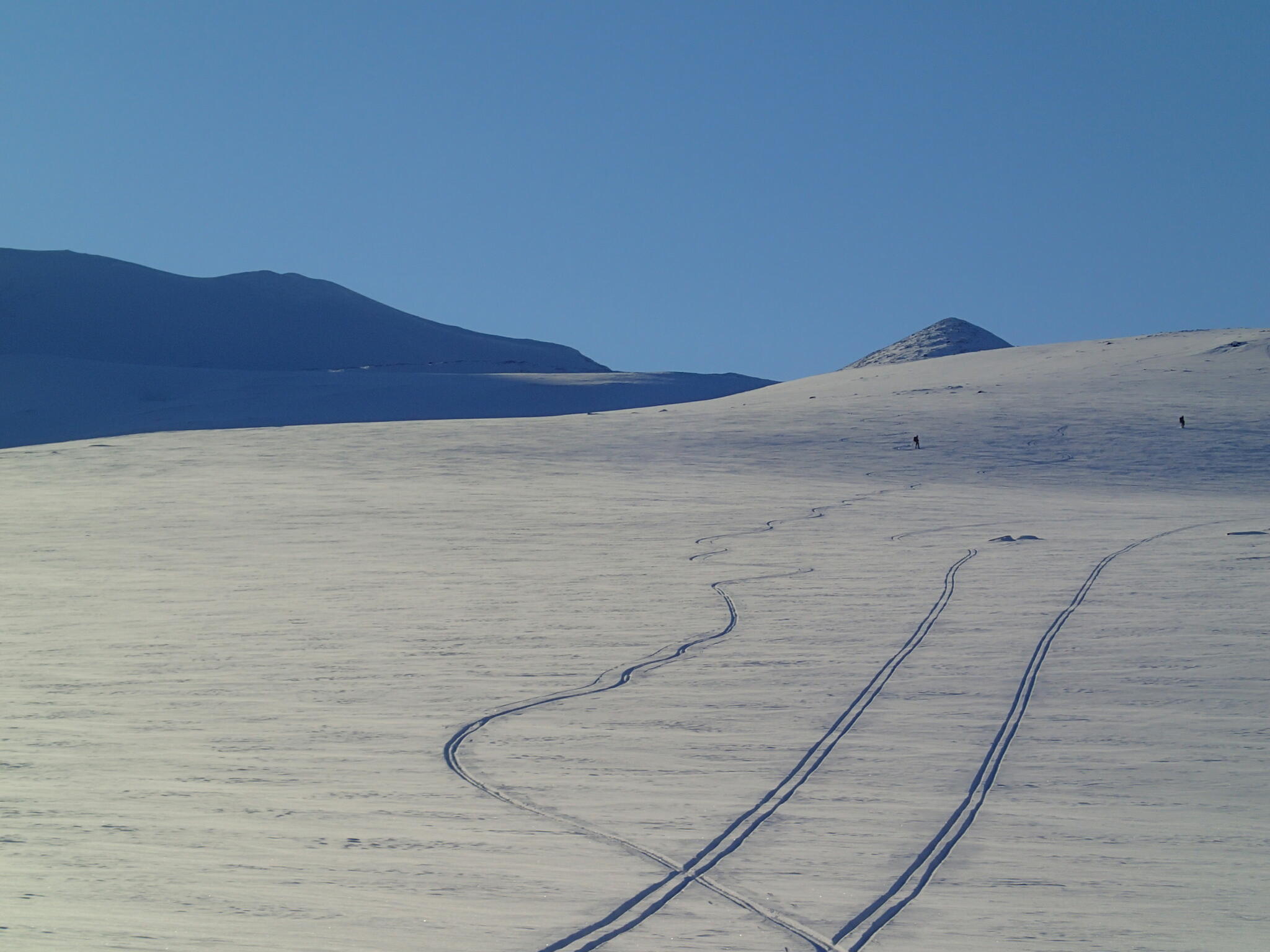 Skidåkningen började med att vi skidade nerför en fin nersbacke norrut i pudersnö. Ett par år tidigare lät vi bli att göra samma nerfart, pga dålig sikt.