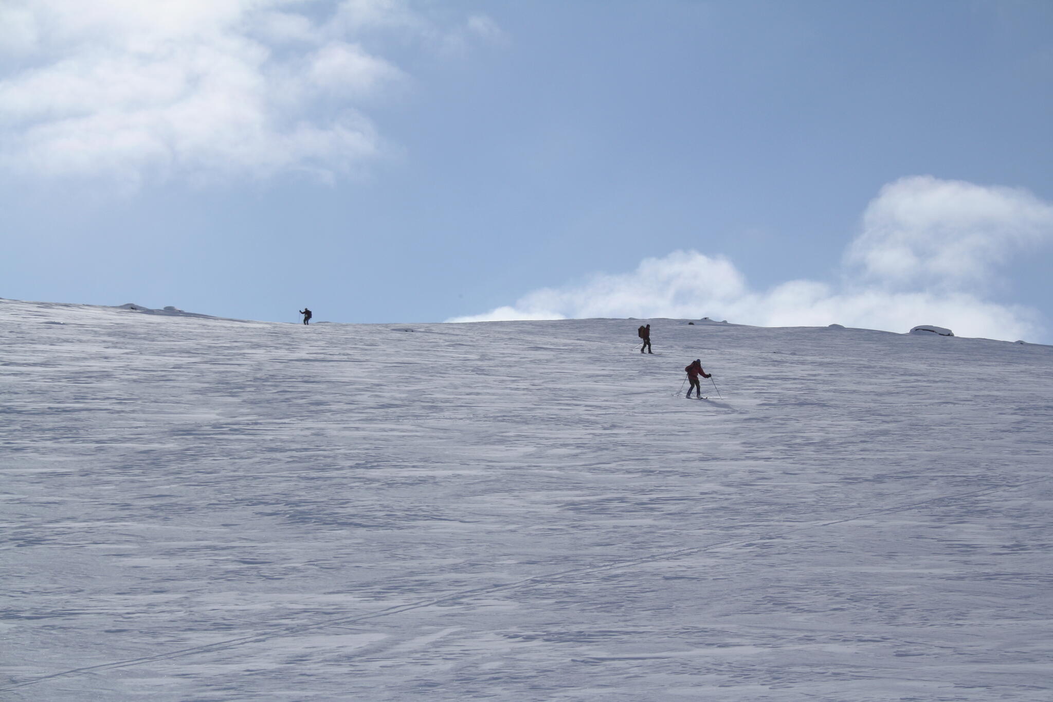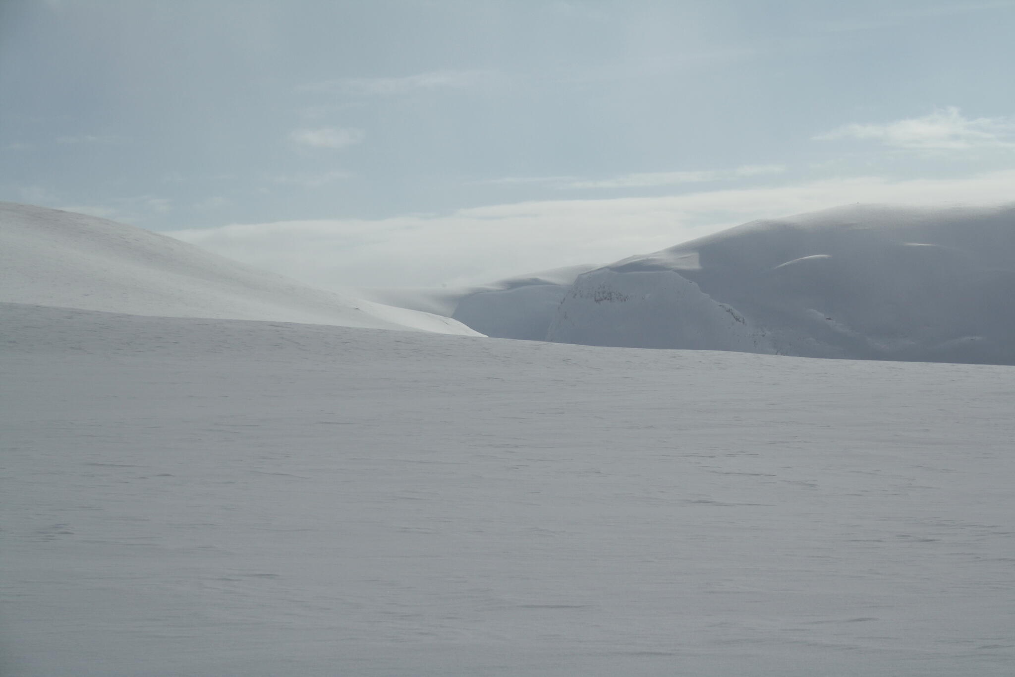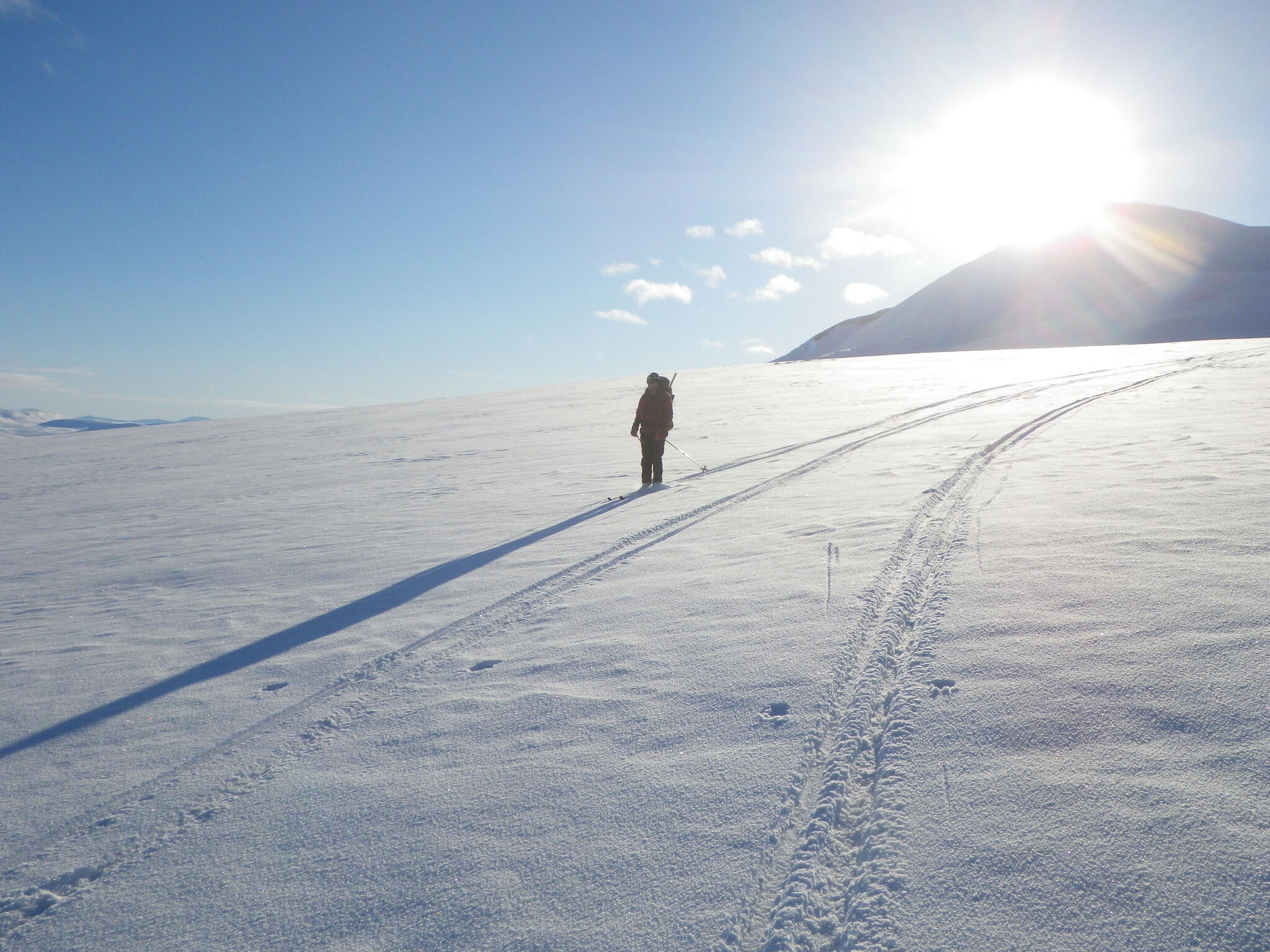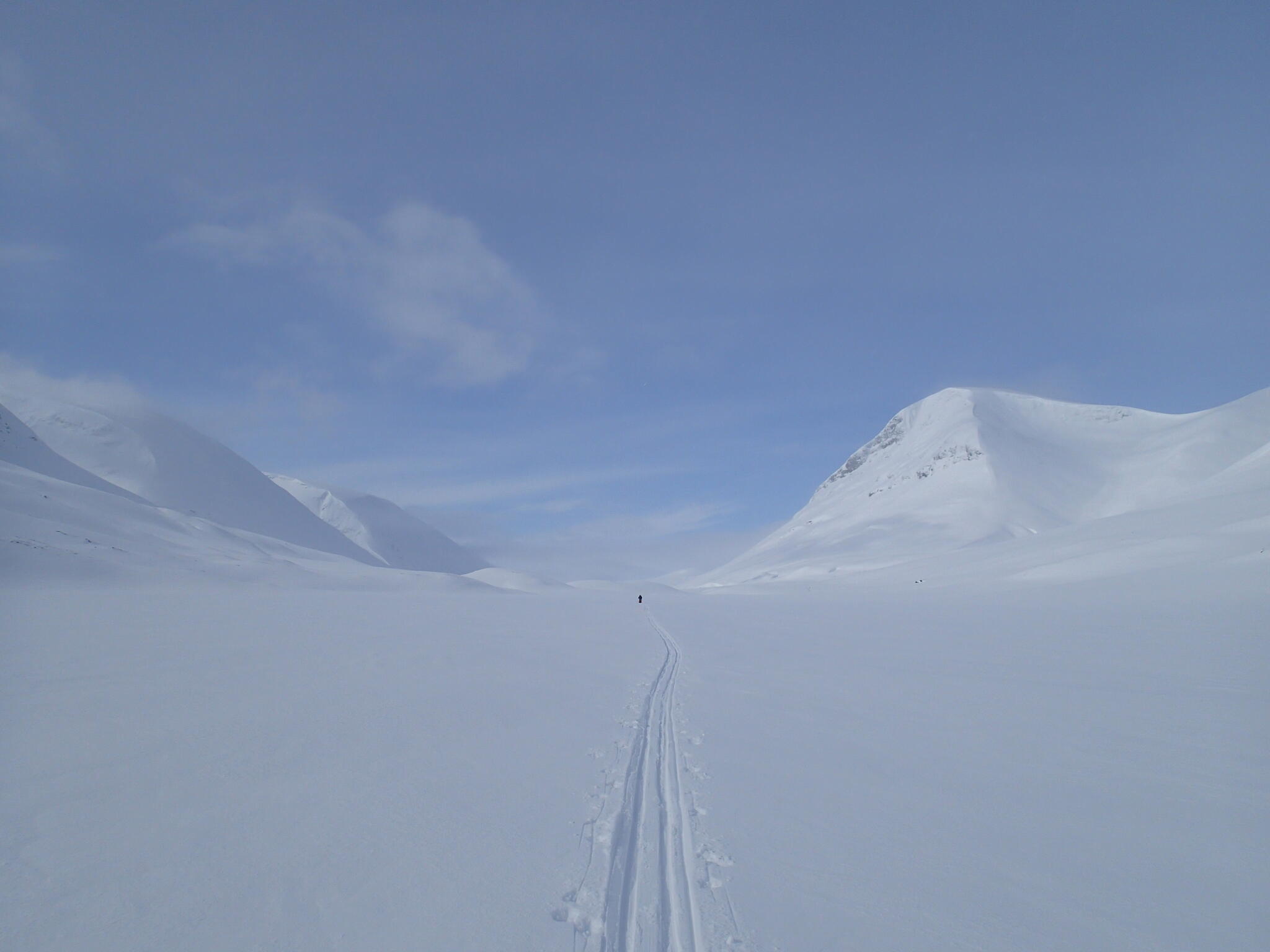 När vi skidade upp mot platån var det varmt och vindstilla, och lite molnigt.