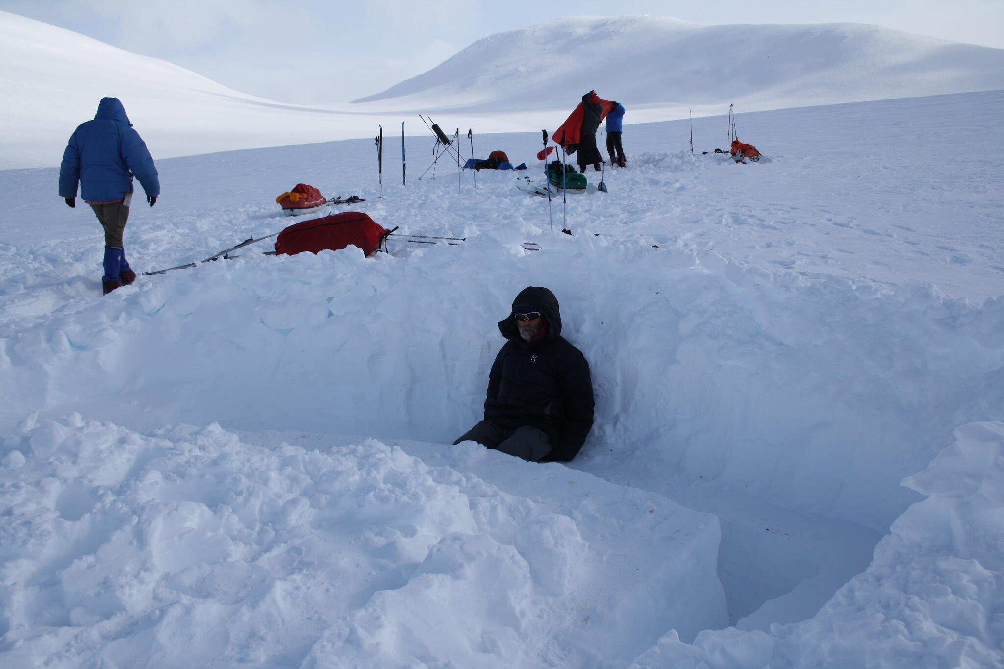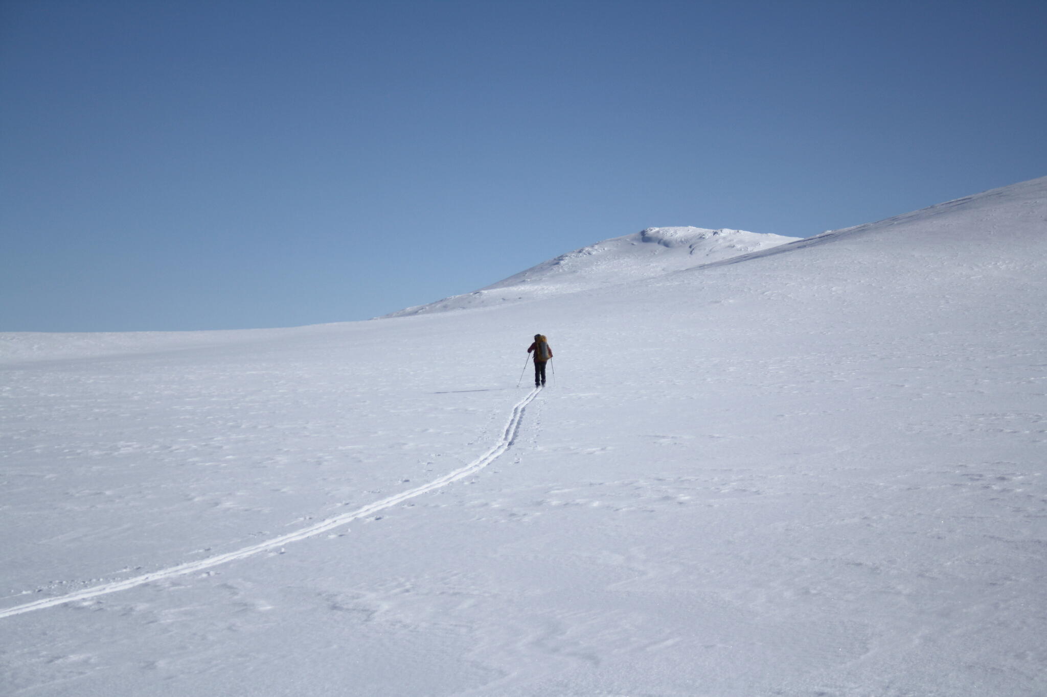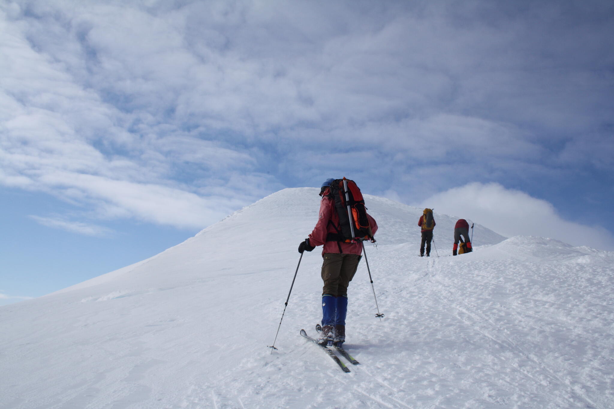 När vi skidade upp mot platån var det varmt och vindstilla, och lite molnigt.