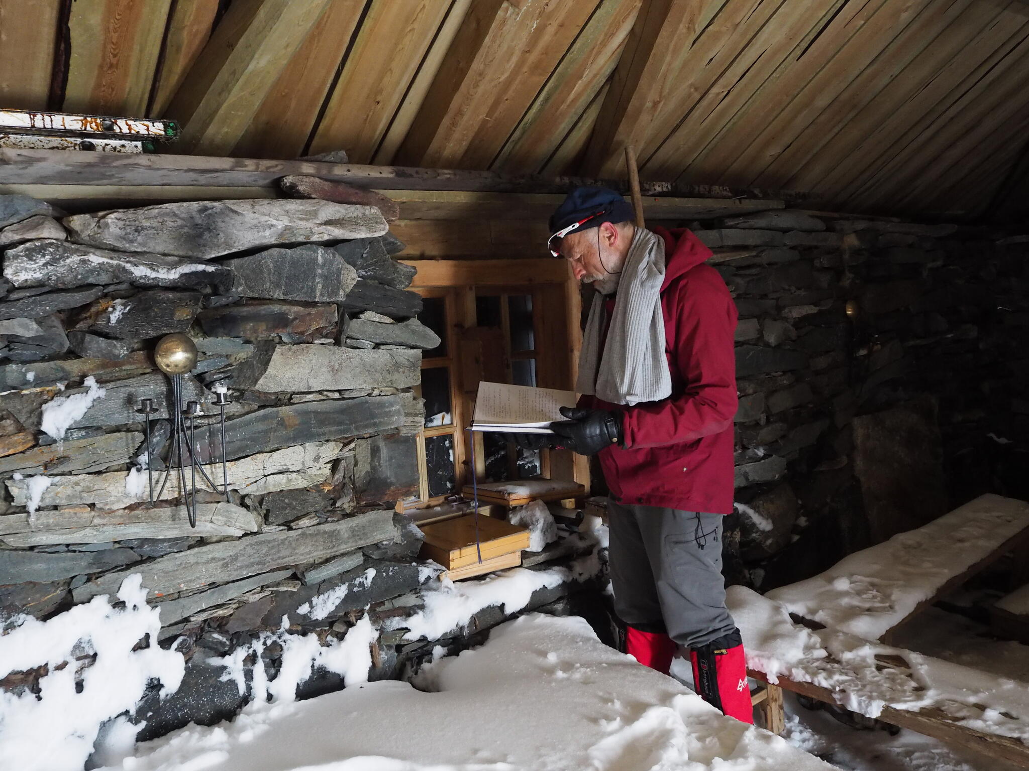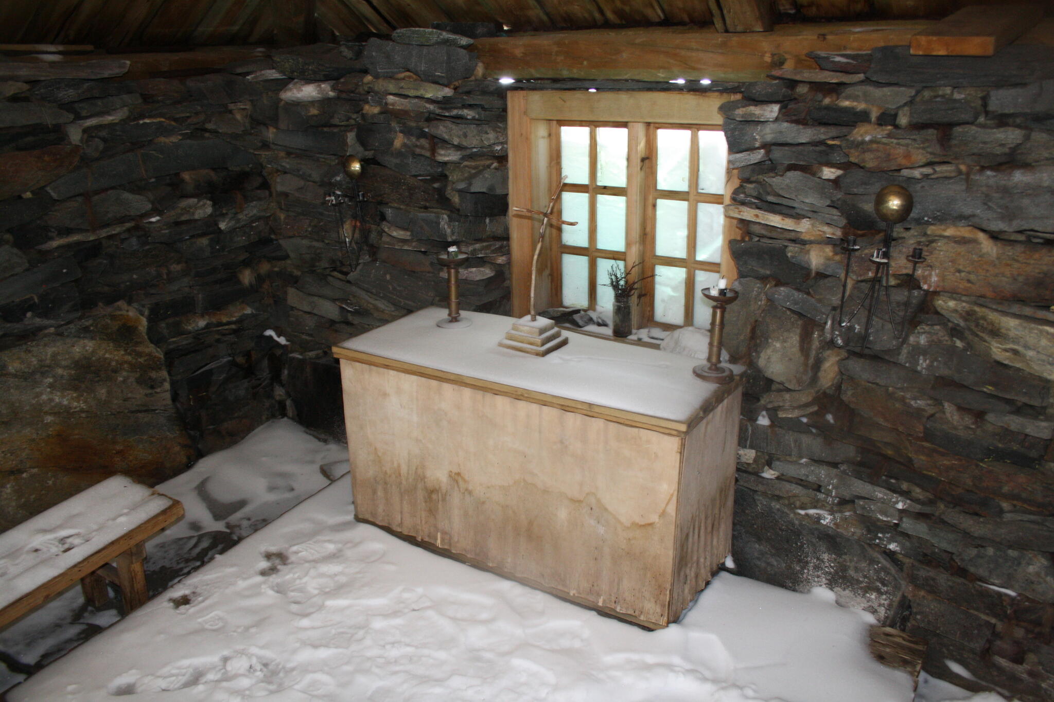 Vi började skidåkningen med ett besök i Alkavare kapell, som hade mycket snö på insidan.