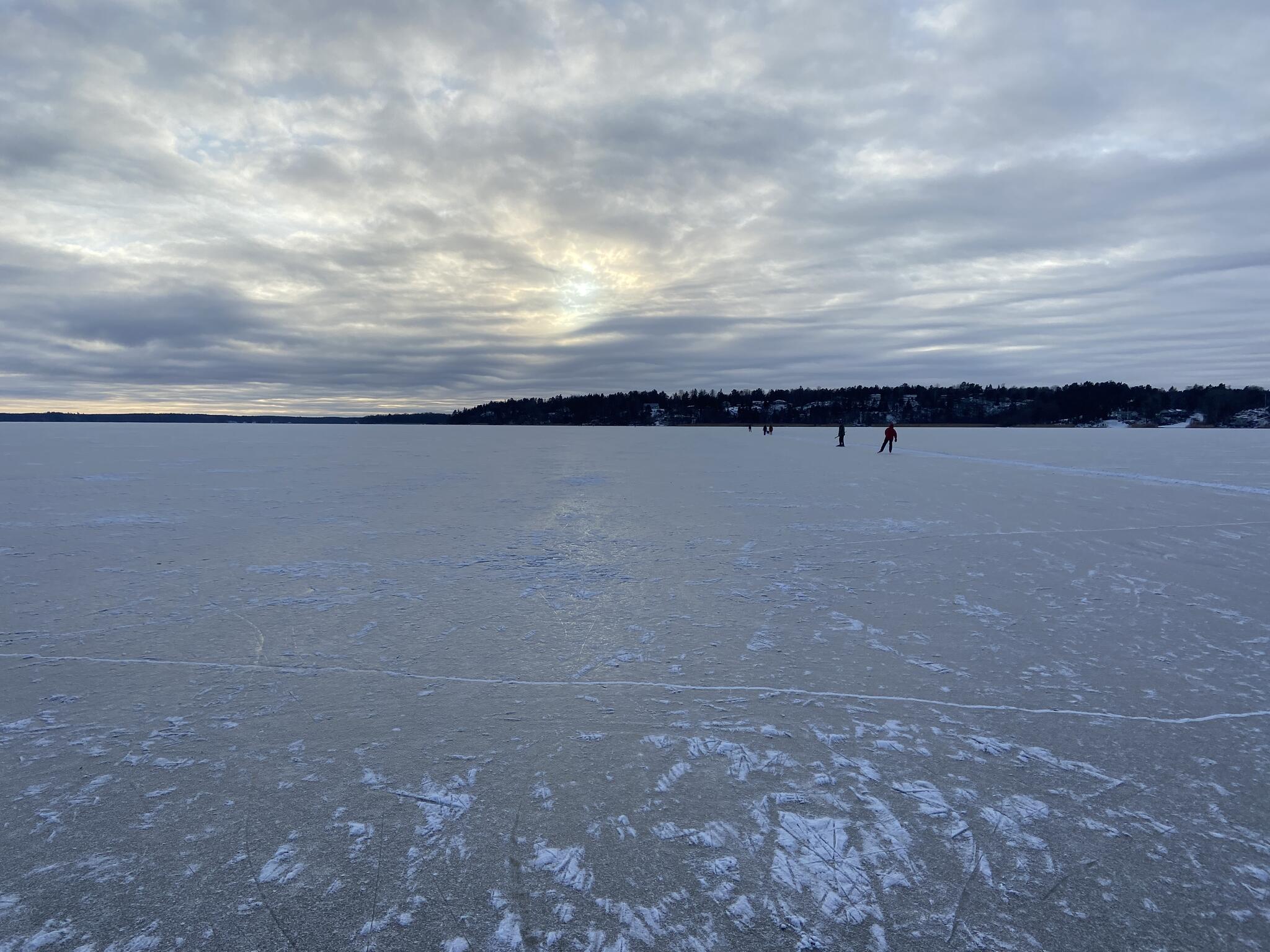 Jag kunde inte låta bli att återkommande på att skridskois är en färskvara. Nu var där ett tunt tunt snötäcke på isen, som oftast återfanns som små tussar eller drivor. Ingen större fara men ändå. Njutbarheten blir oftast sämre ju längre tid som går. Sprickor bildas av kylan och på välåkta sträckor blir det slitet.