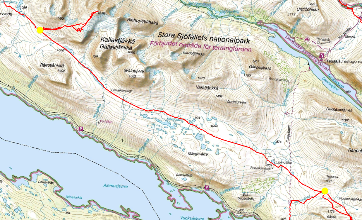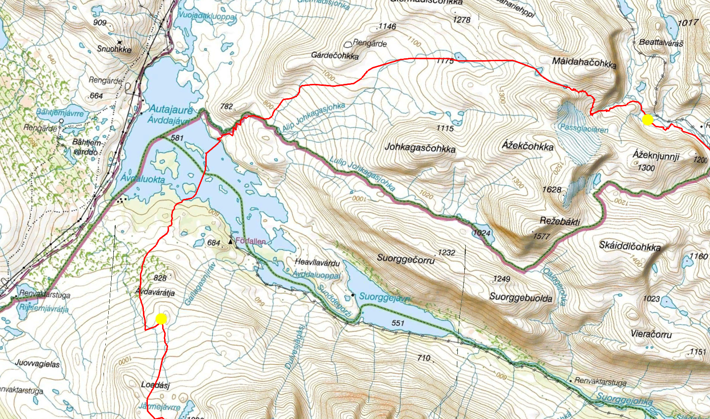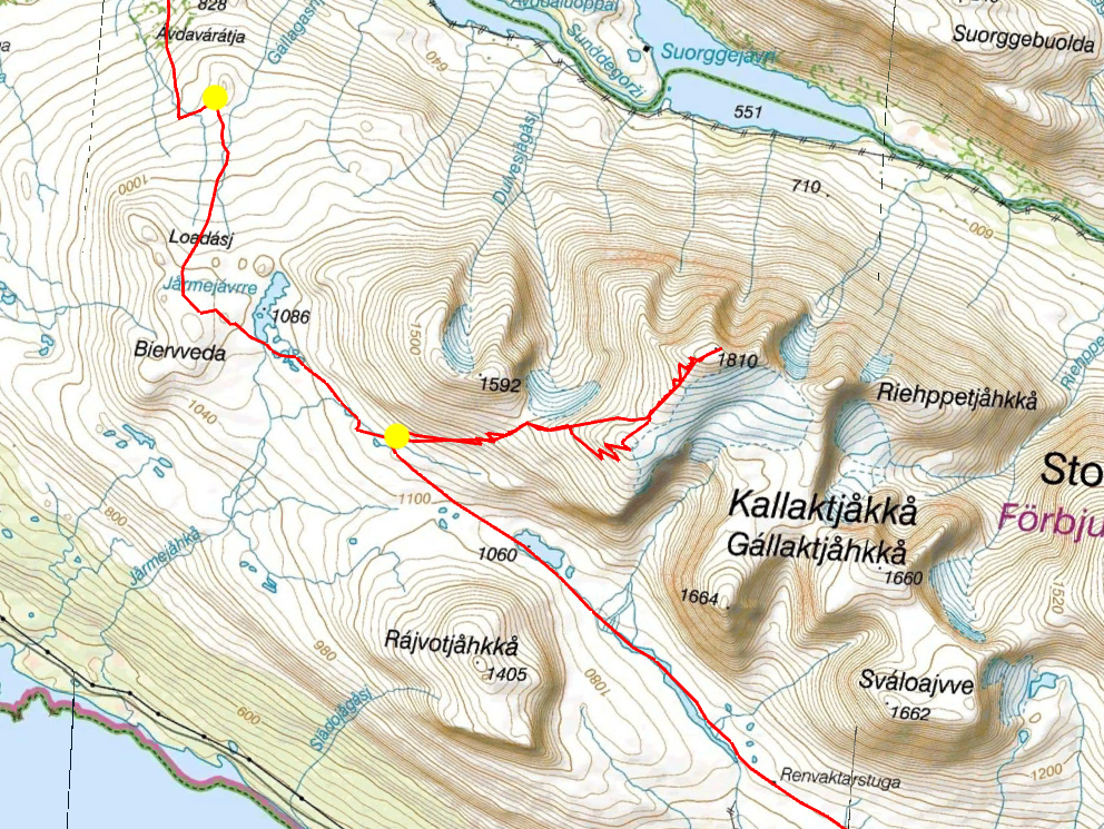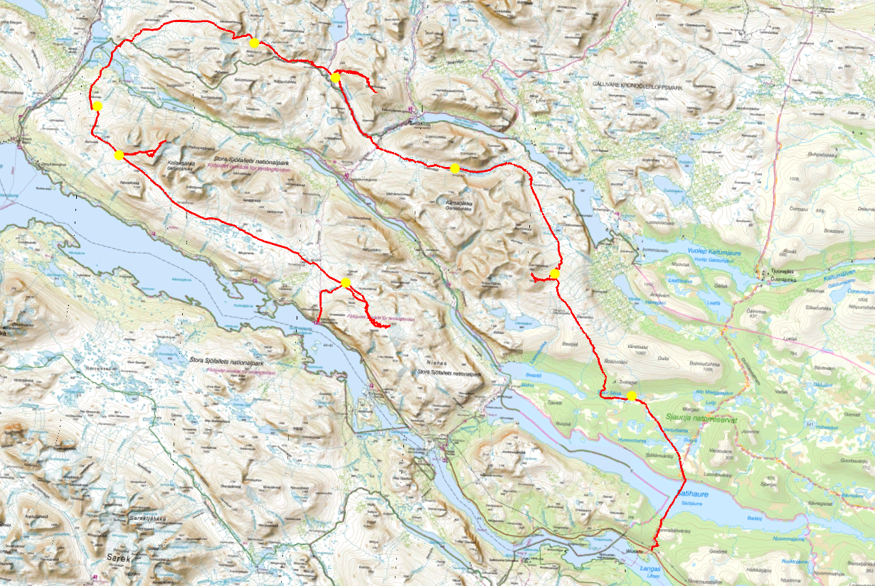 Vår nerförsbacke gick till största delen på östra sidan av en bergsrygg och längs med jokken Alip Johkagasjohka. Sista kilometerna ner mot sjön Autajaure blev fantastisk nerförsbacke för pulka. Vi hade fin utsikt mot det vackra Ahkka-massivet och Kallaktjåkkå-massivet. - det var molnigt där på topparna. Från 800 meters höjd höll vi ännu mer åt väster och sista biten ner till sjön var brant men det gick.