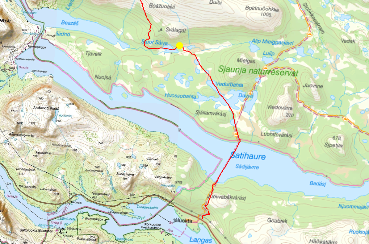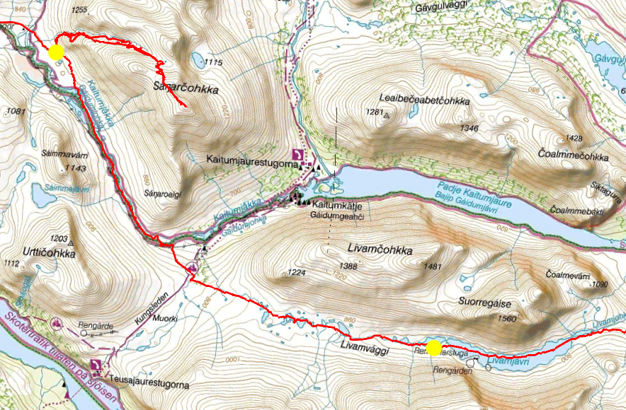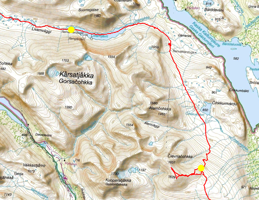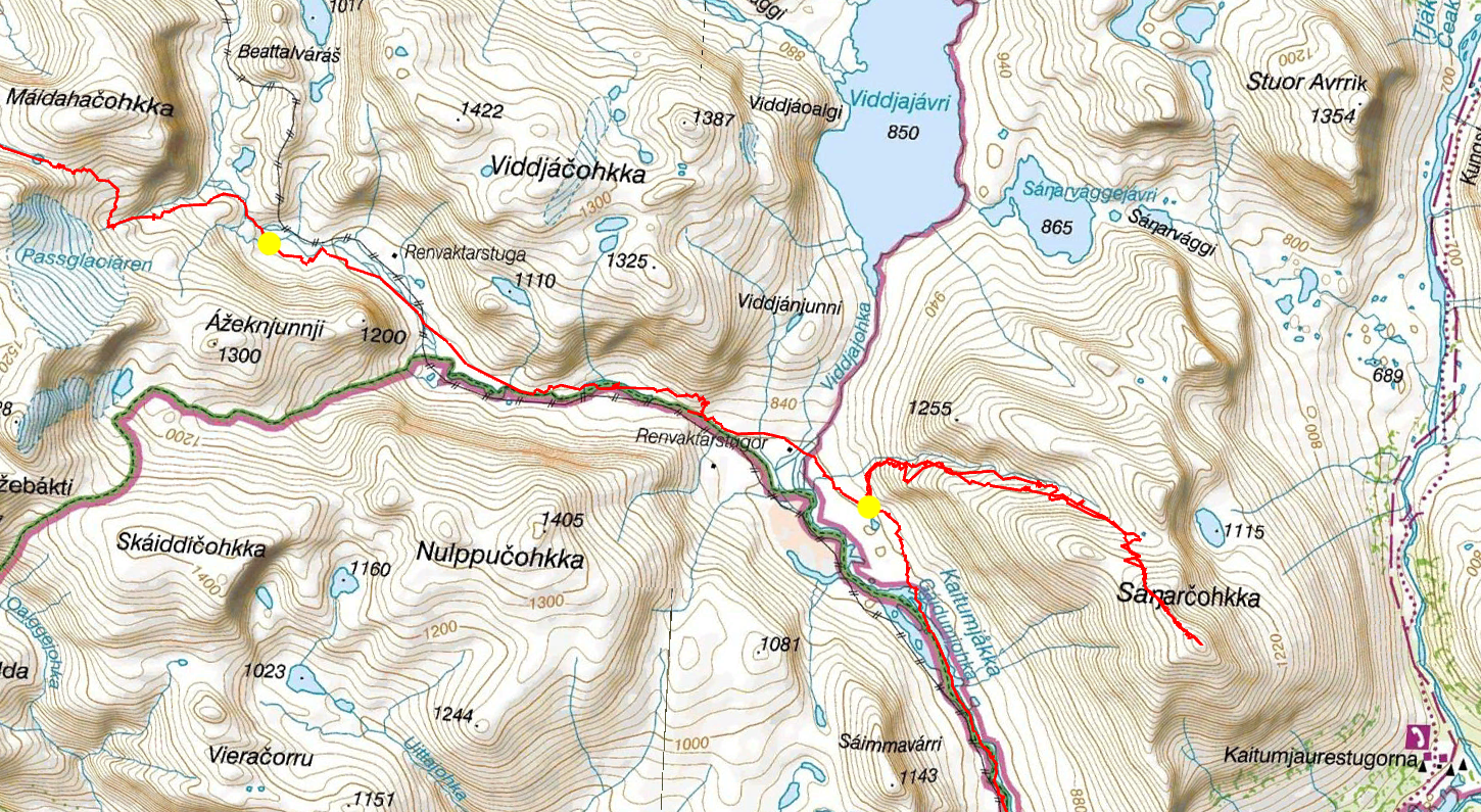 Lunch tog vi vid några stora stenblock. Under lunchen diskuterade vi möjligheten att skida hela vägen till Vietas via sjön Gágirjávri: det skulle bli 50 km på två dagar. Vi beslöt att inte göra det då det hade inneburit mycket stress, missad topptursmöjlighet och förmodligen lång sjöåkning i motvind. Vi skidade vidare och fikade vid en renvaktarstuga vid Kungsleden. Vi såg ett sällskap på leden med två pulkor på väg söderut. Via sms till min fru försökte vi meddela Länstrafiken att det nog skulle bli oväntat många pulkor på minibussen från Vakkotavare dagen efter.