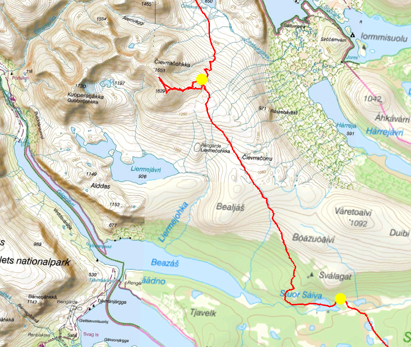 Efter att vi korsat leden tältade vi ett par km längre österut söder om fjället Tjoarvek. Det blev en fin och kall kväll med vackert ljus. Hörde fjällripor vid lägerplatsen.