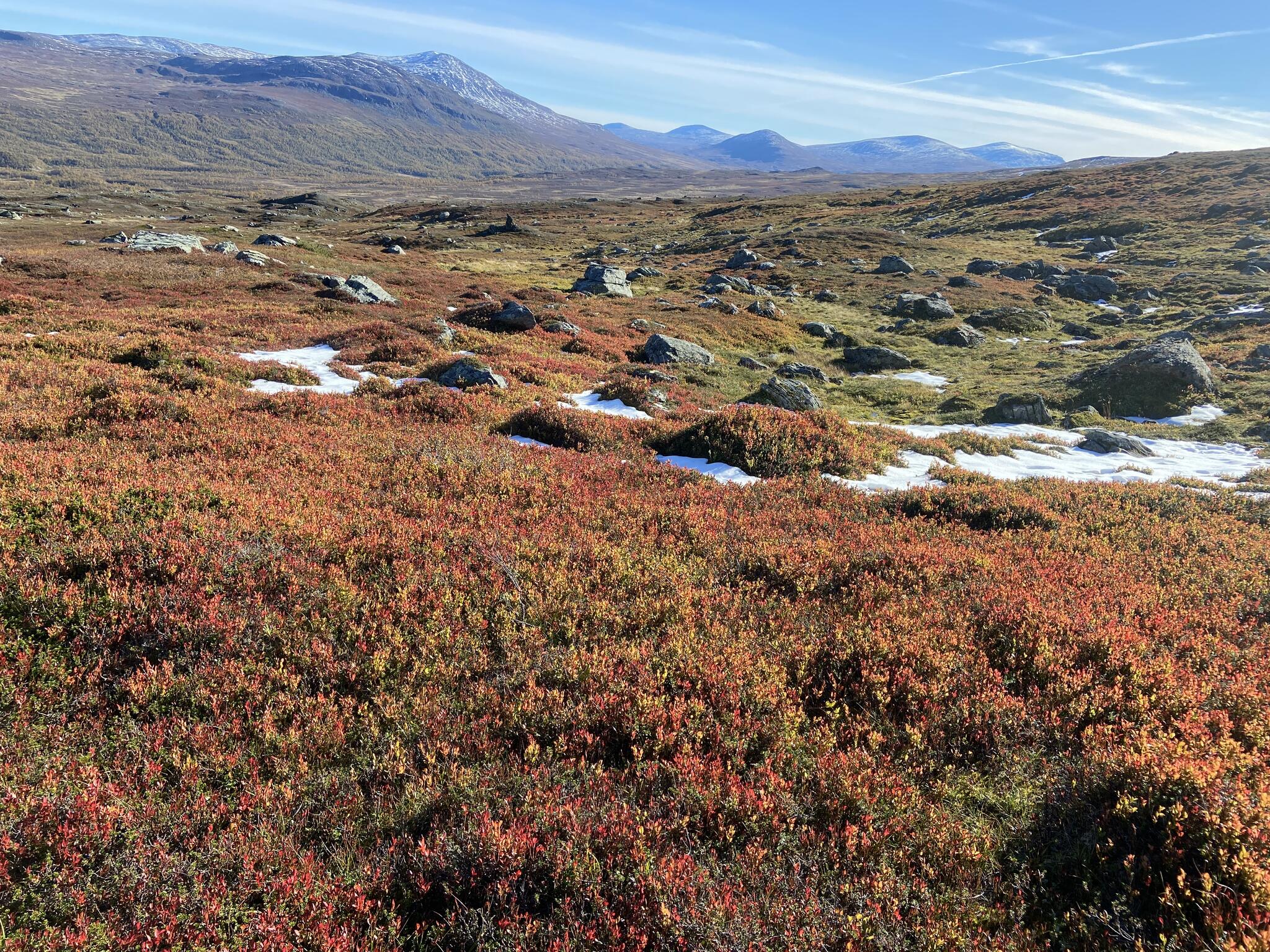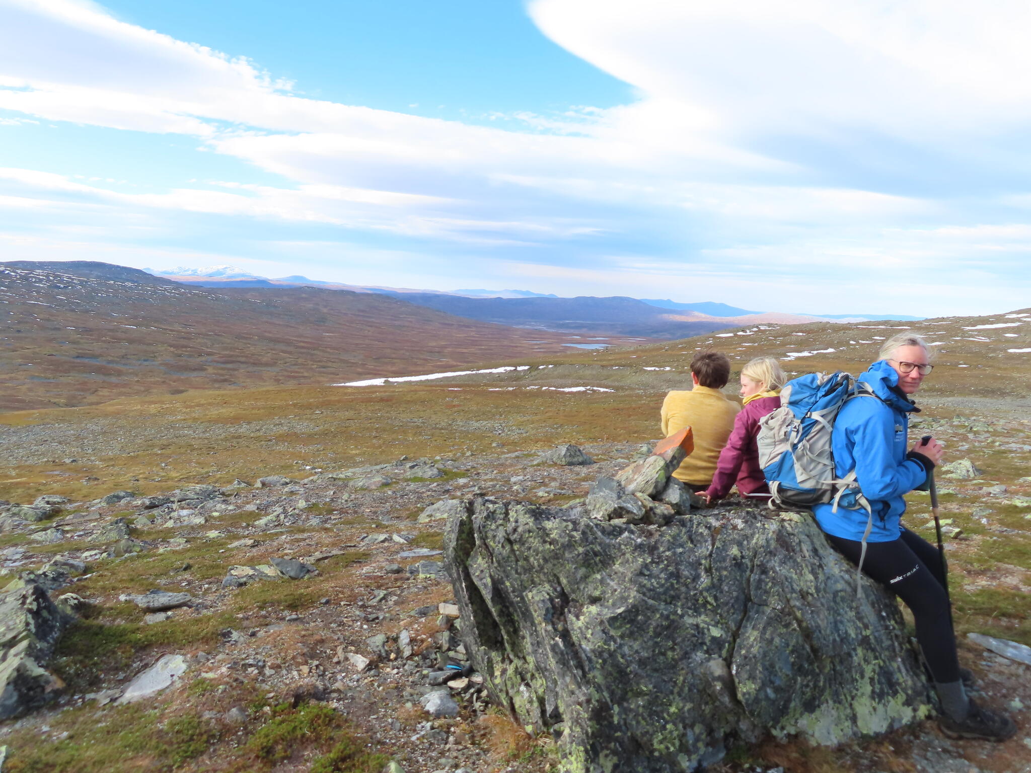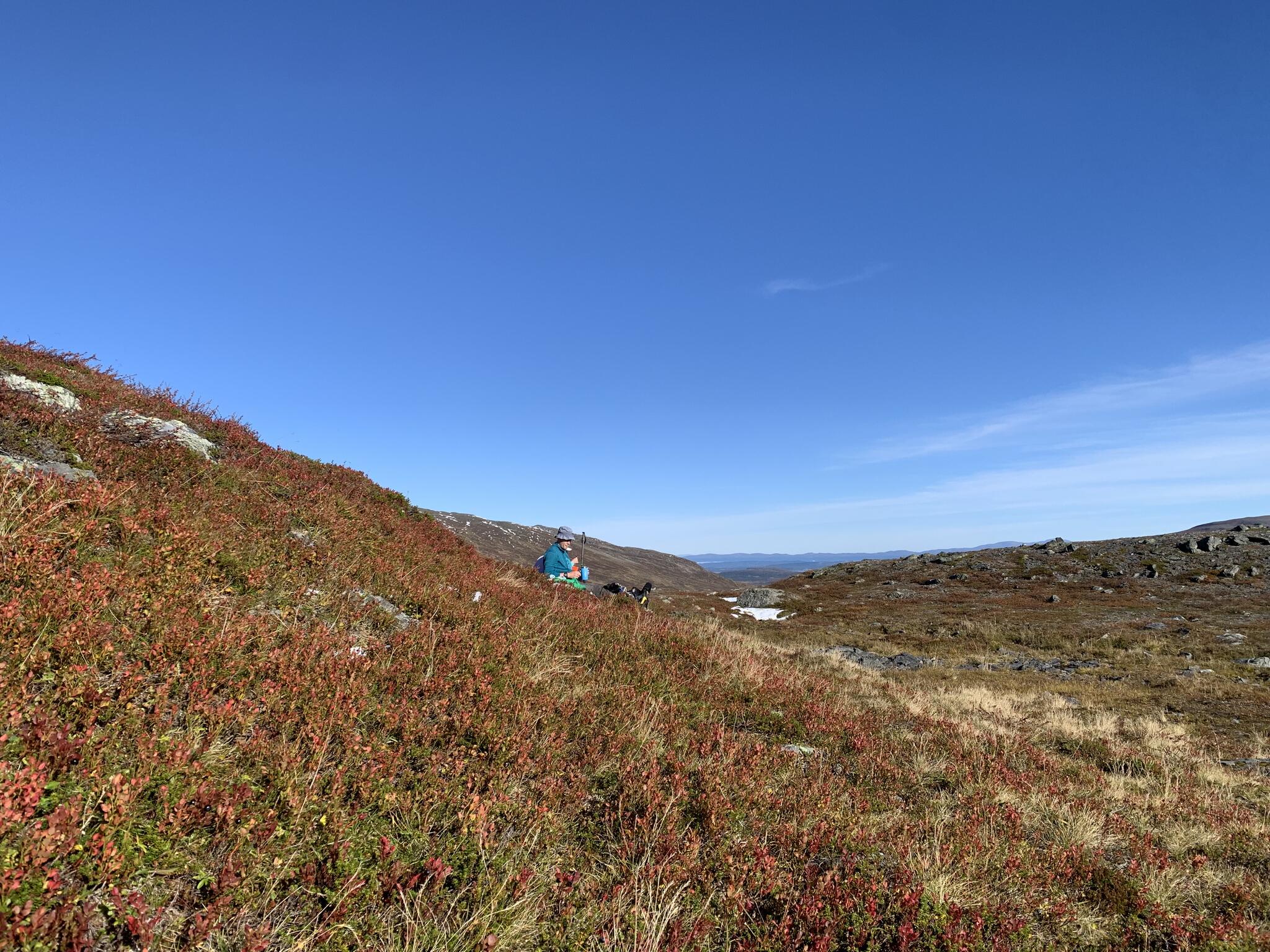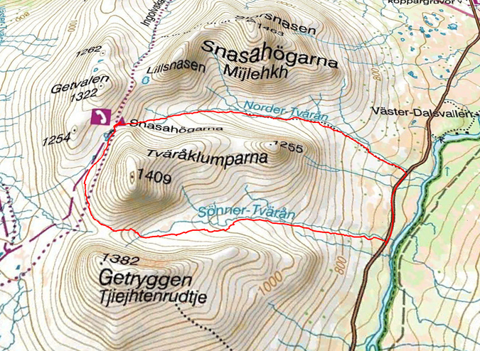 Efter frukost packade vi ihop och körde mot Snasahögarna. Vår vandring började vid parkering vid Norder-Tvärån. Vi gick upp i dalen till Snasahögarnas vindskydd. Sedan söderut längs led. Och sedan ner i dalen längs Sönner-Tvärån. Då hade vi rundat Tväråklumparna. 14 km blev den rundturen.