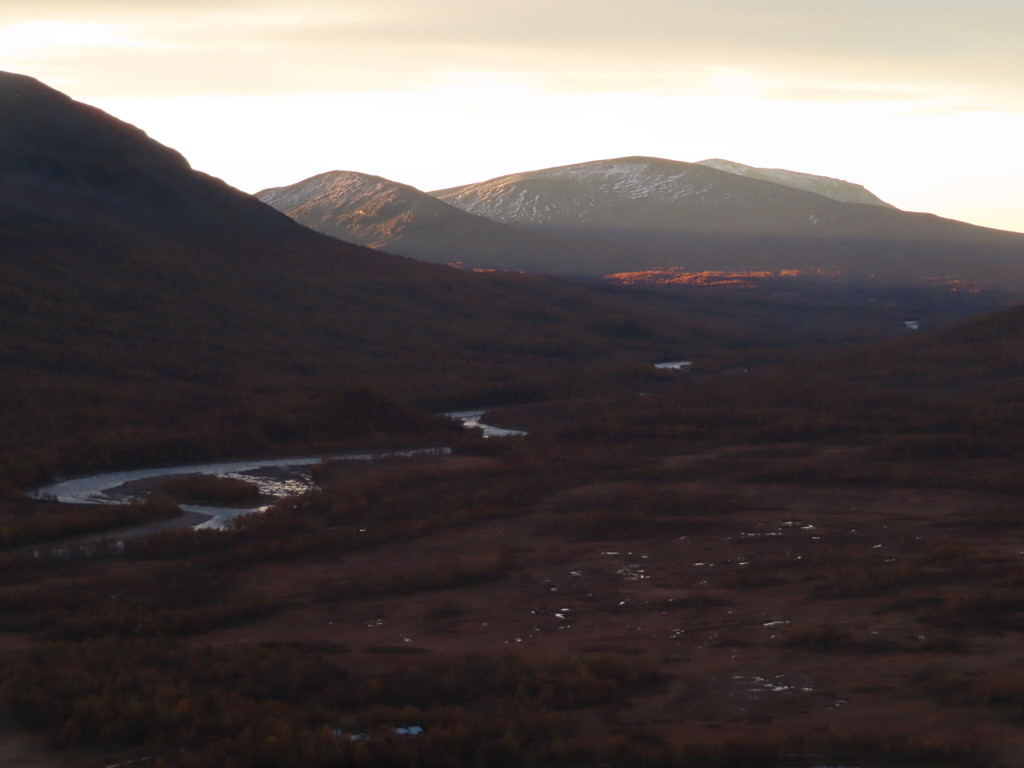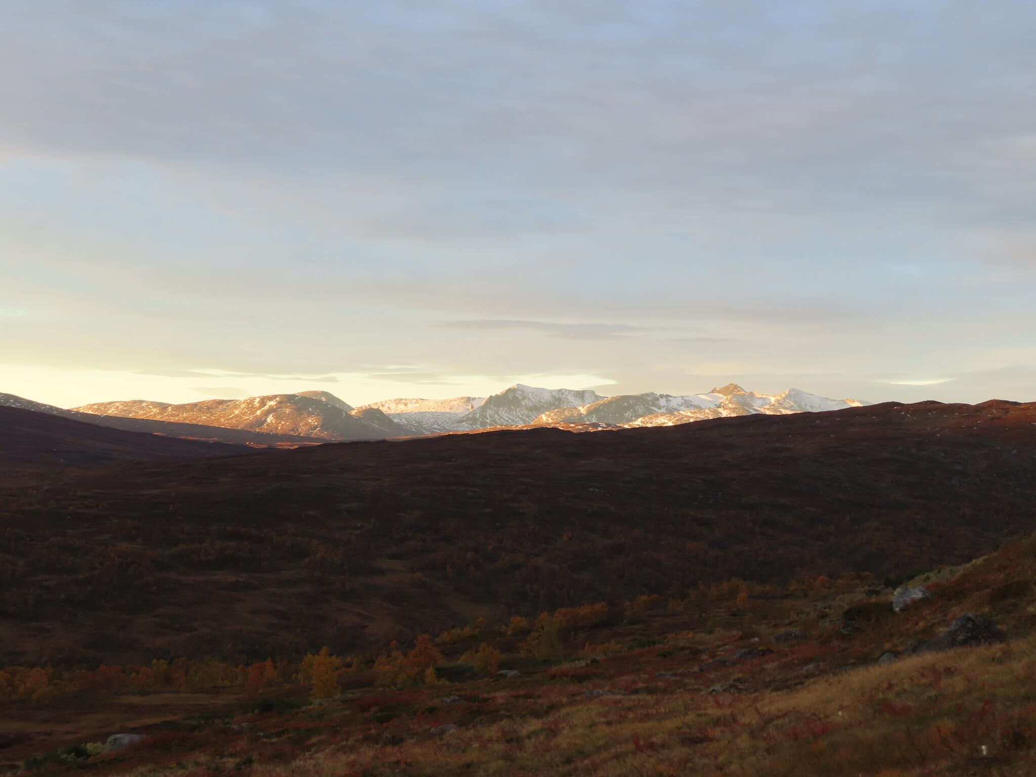 Vindstilla och sol som kom alltmer över topparna i gryningsljuset. Väldigt fint.