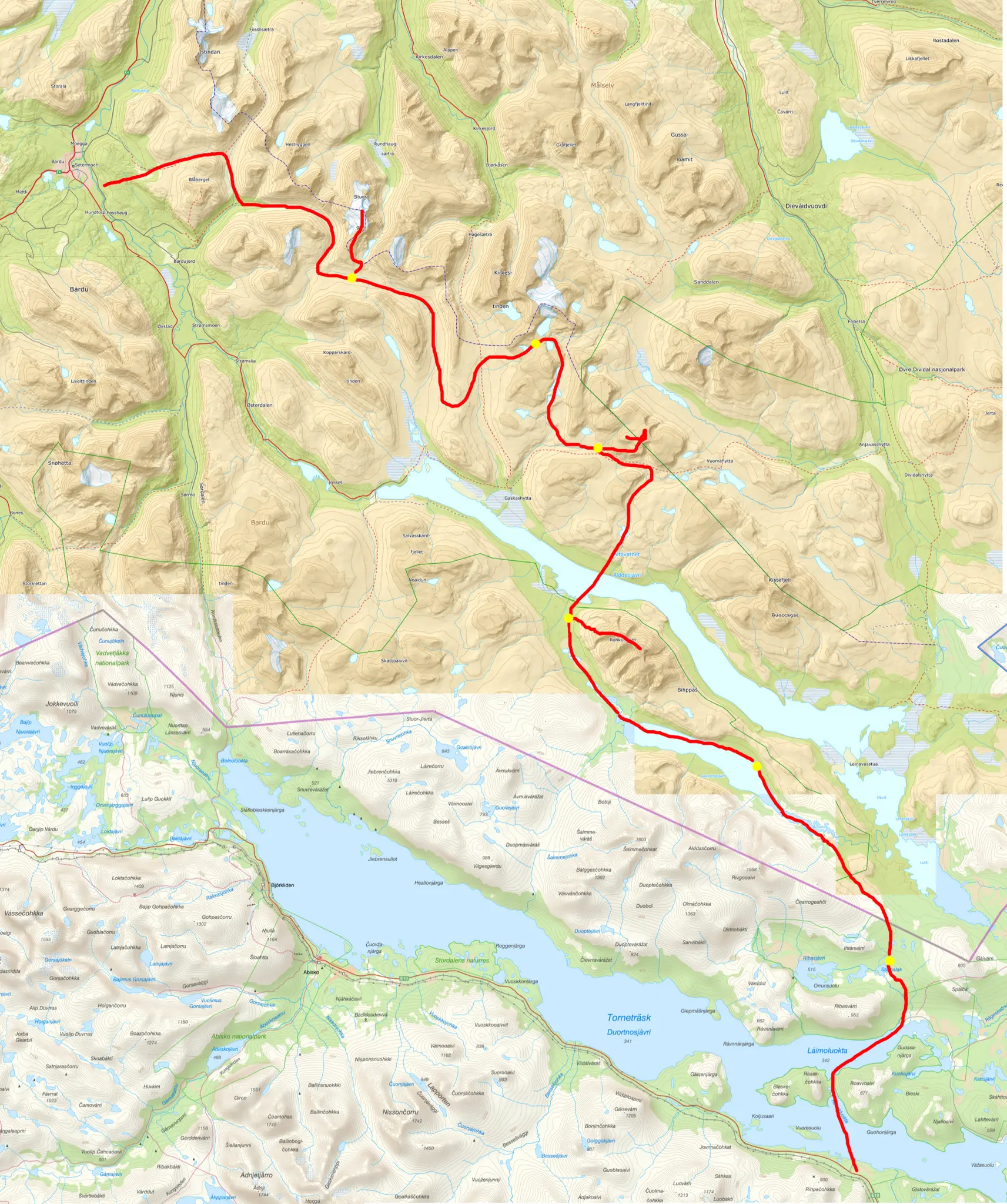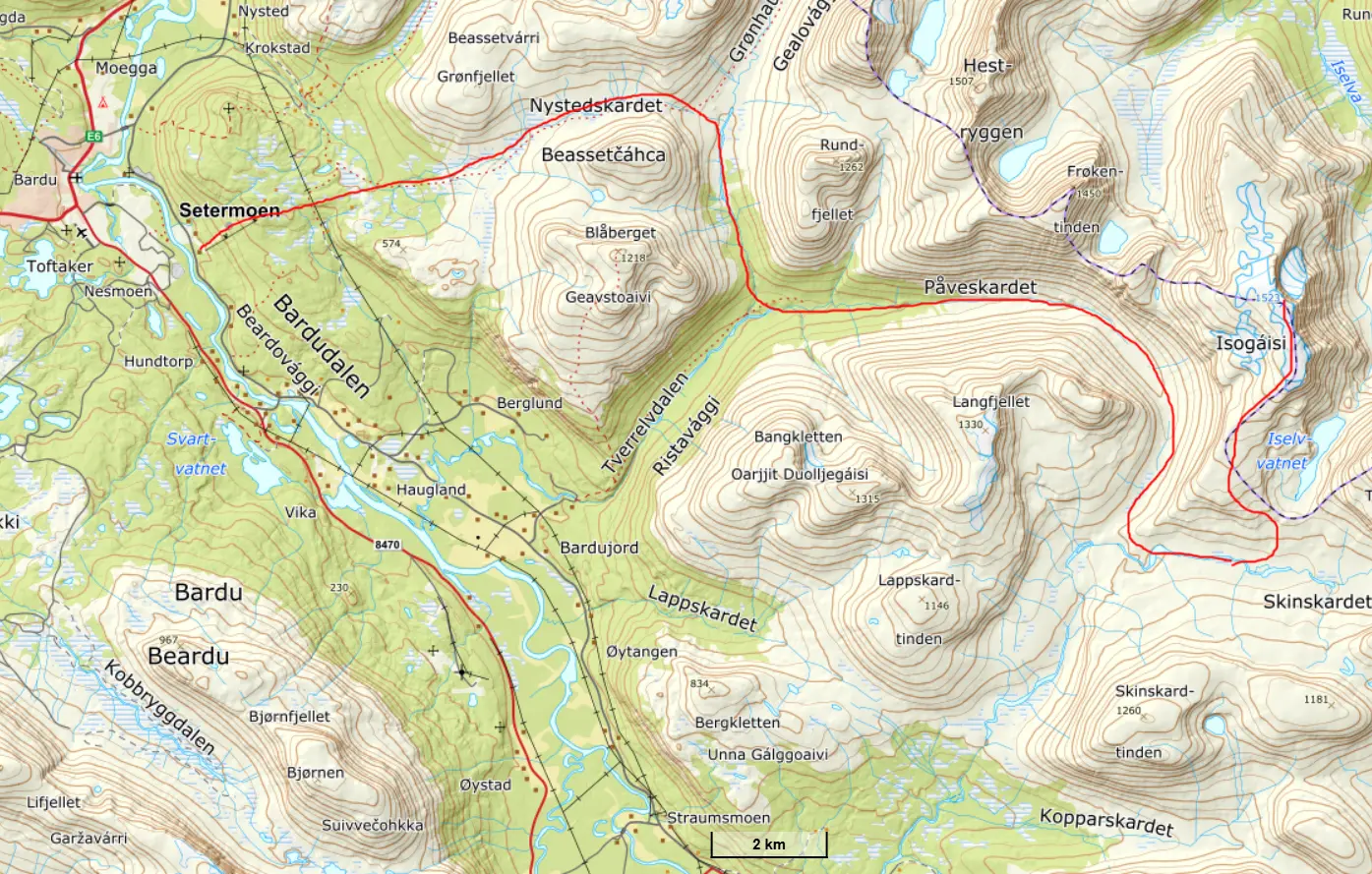 På början av vår tur färdades vi längs med eller tvärsöver breda dalgångar med långsmala sjöar. Runt omkring oss reste sig imponerande berg och vi valde att bestiga några av dem. Ju längre västerut vi kom på vår färd i landskapet desto brantare blev dalgångarna. Turen avslutades med att vi åkte ner för skidbacken i Setermoen med utsikt över skogslandskapet och Barduelva.