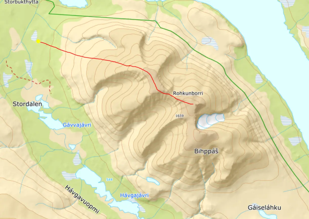 Vi skidade iväg västerut och rundade Gaibagáisis sydvästra hörn och fortsatte norrut.