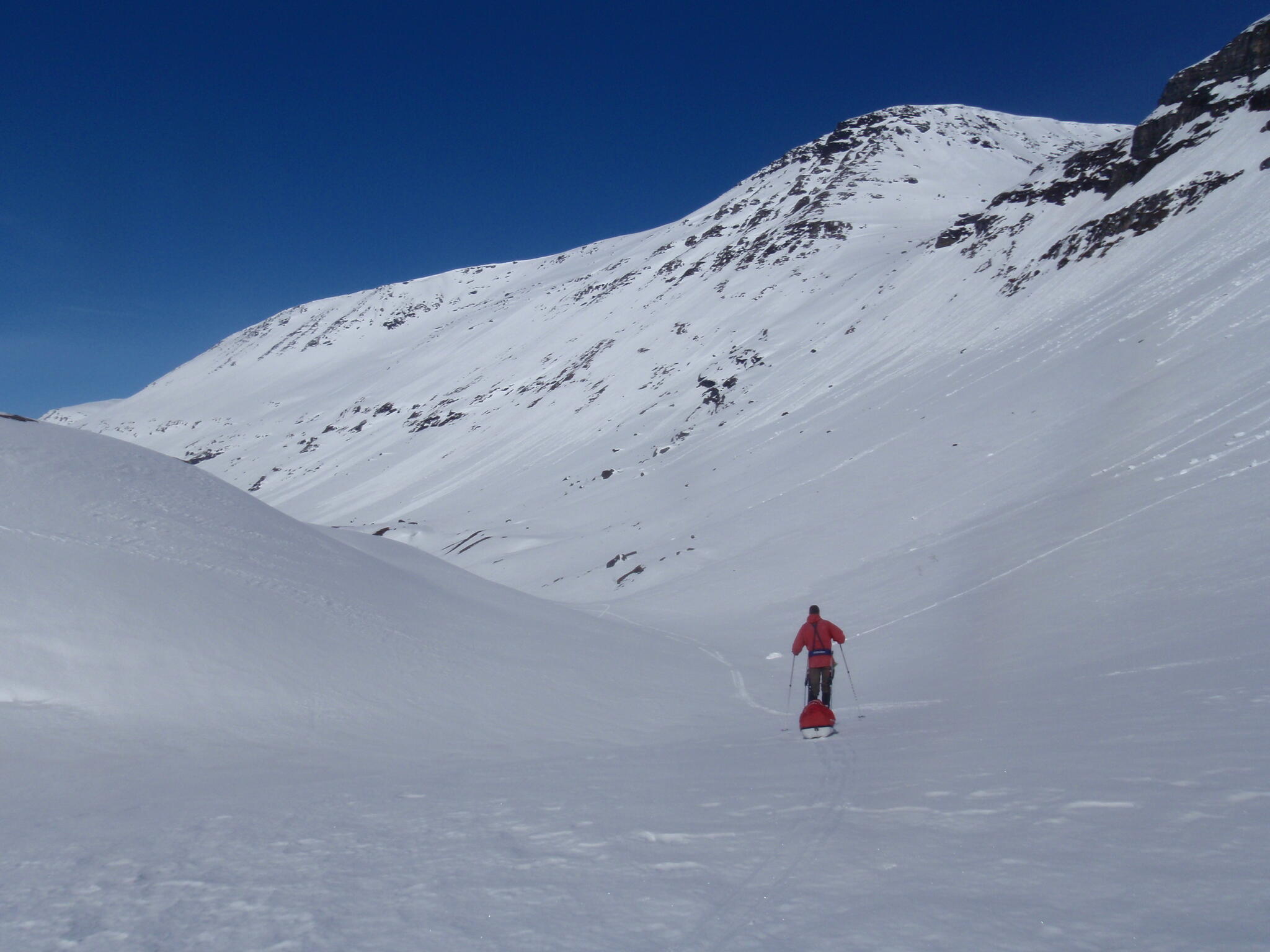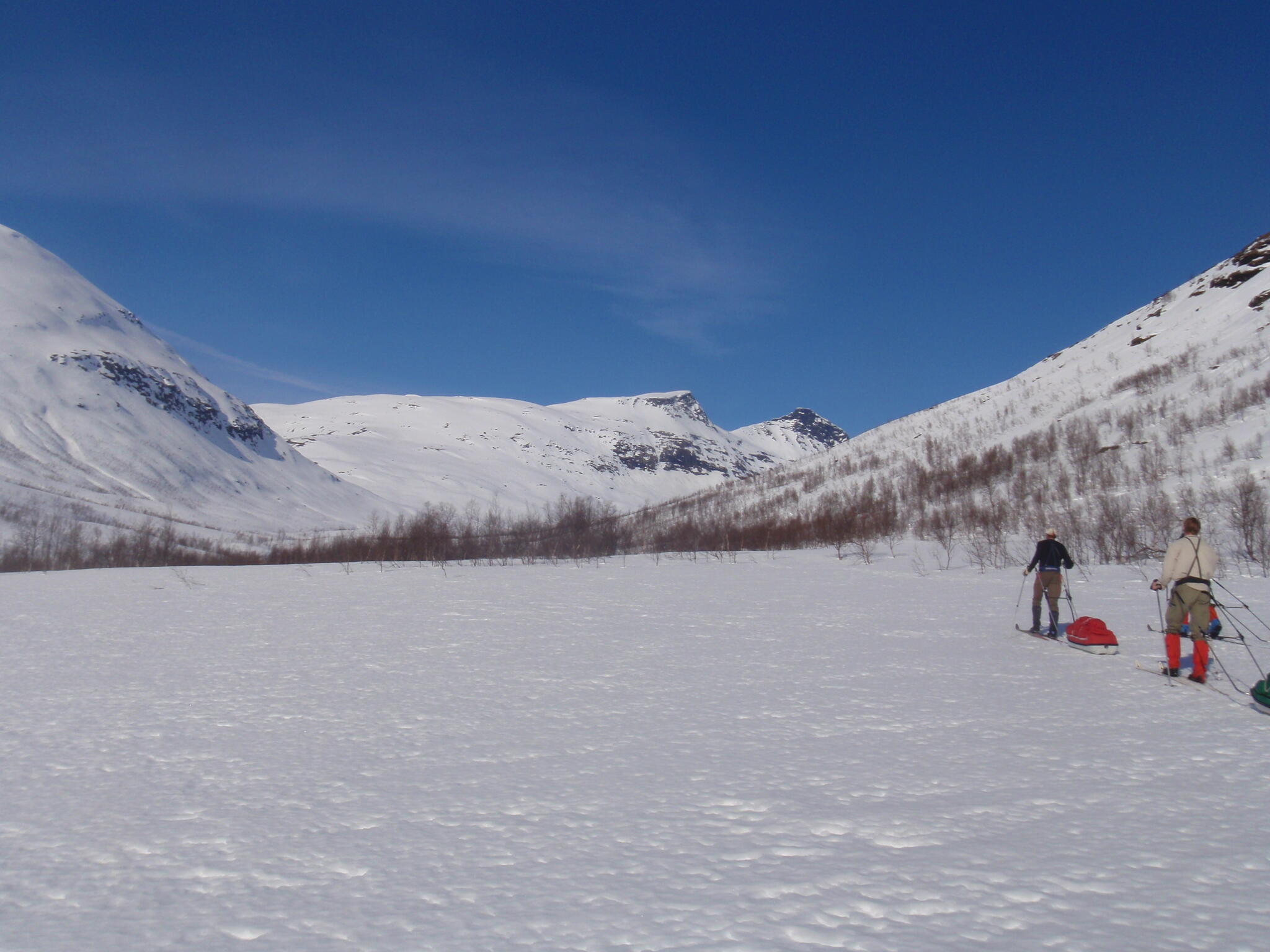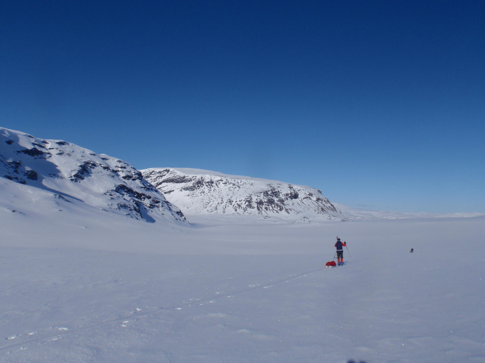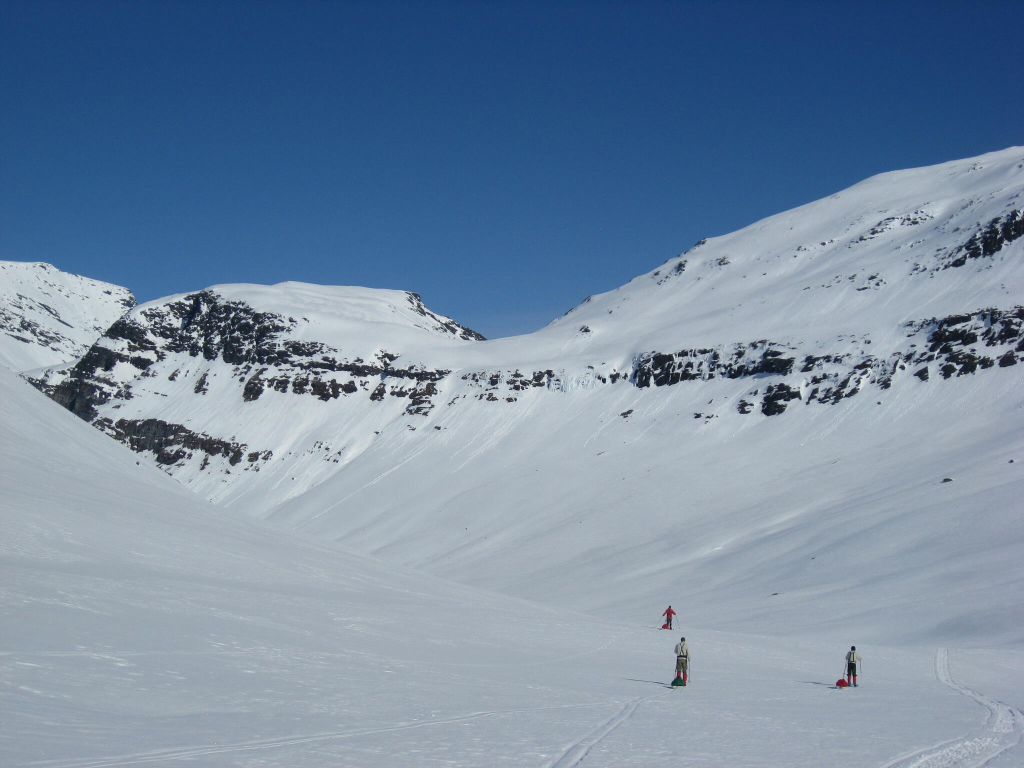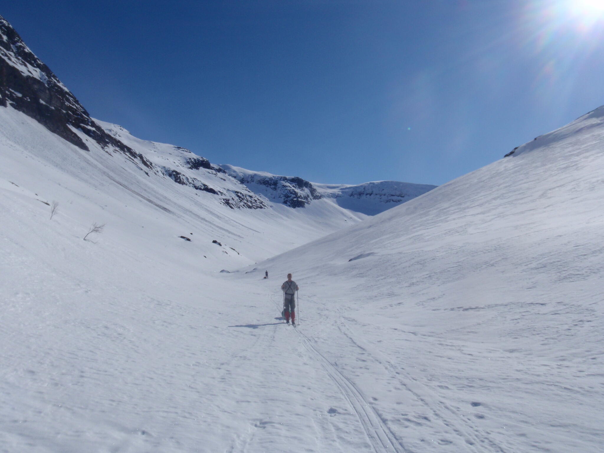 Gasasvaggi svänger högre upp åt nordväst och efter ett litet pass över går den i dalen Skinskardet / Duolljevággi. Vi skidade dit. Lämnade pulkorna där och gjorde en liten tur till den smala dalen mellan fjället Isogaisi och Tverrfjellet. Branta bergväggar men också massor av skoterspår. Lite oväntat och det blev inte den fina upplevelse vi hoppats på.
