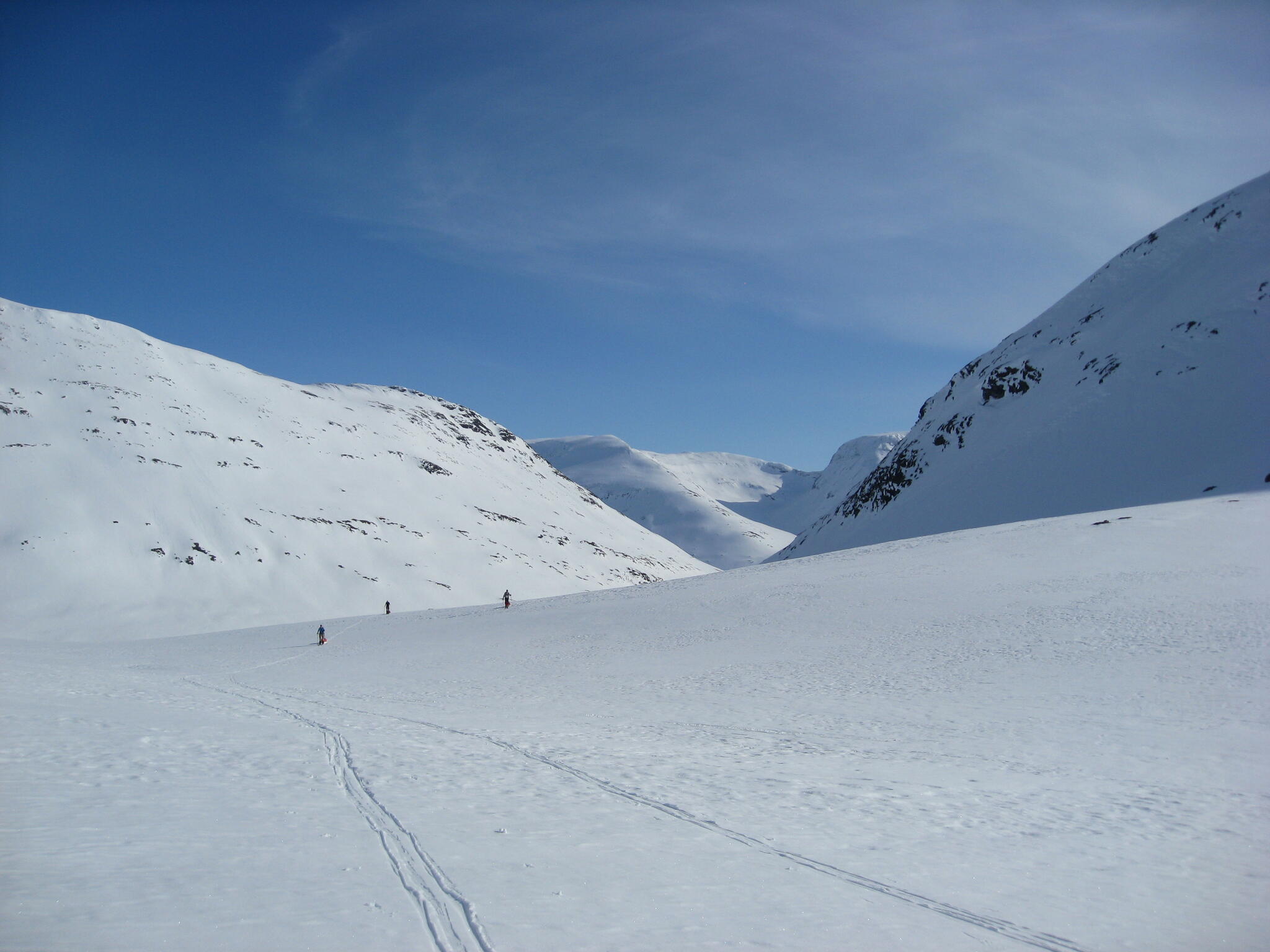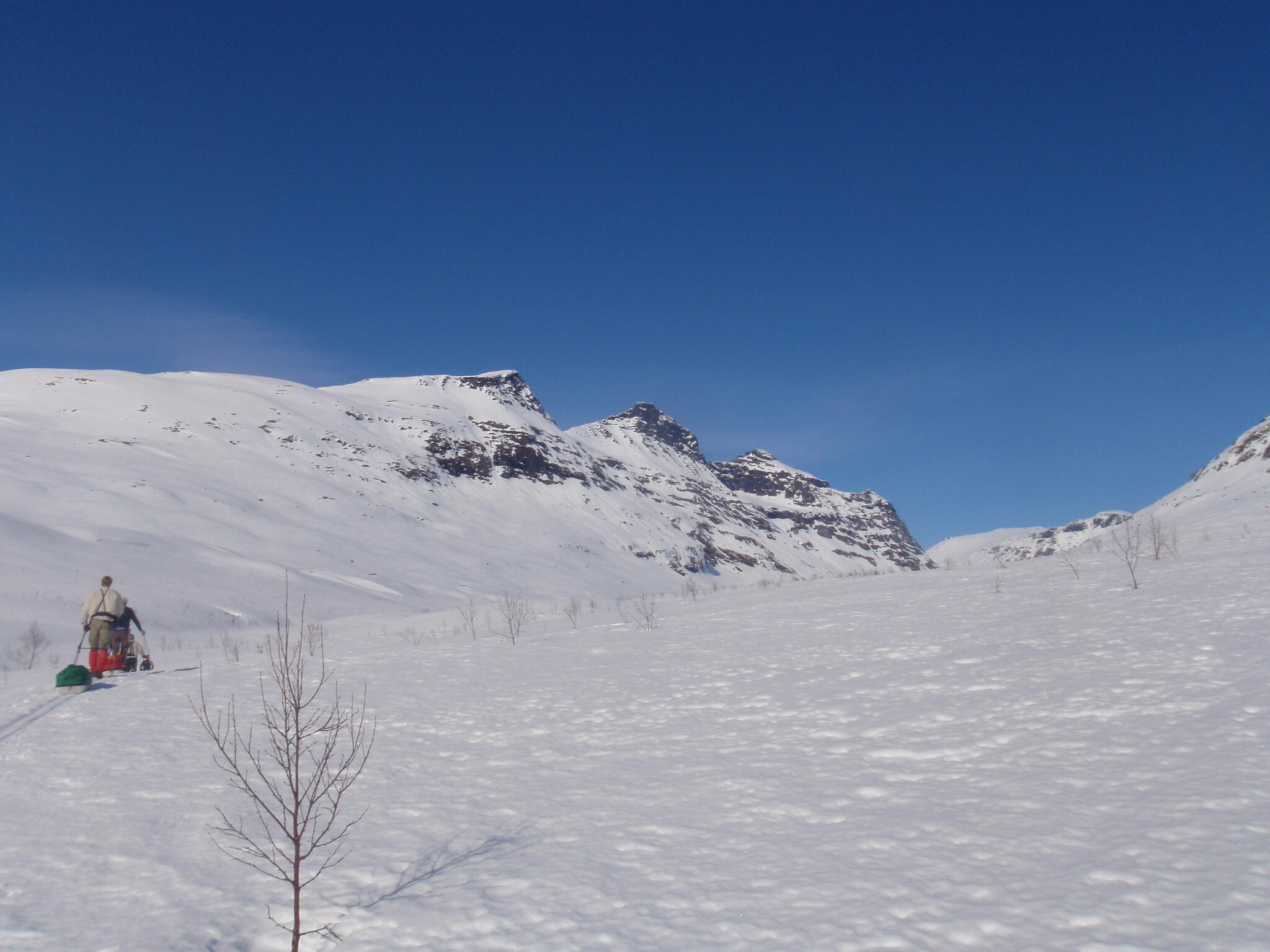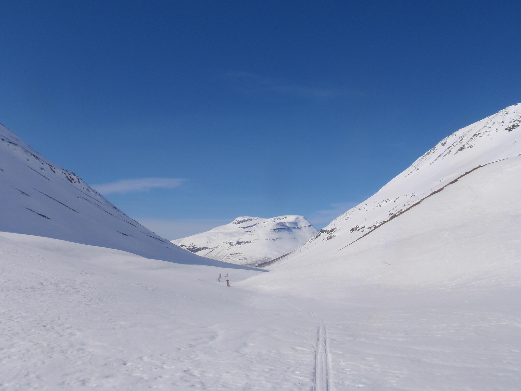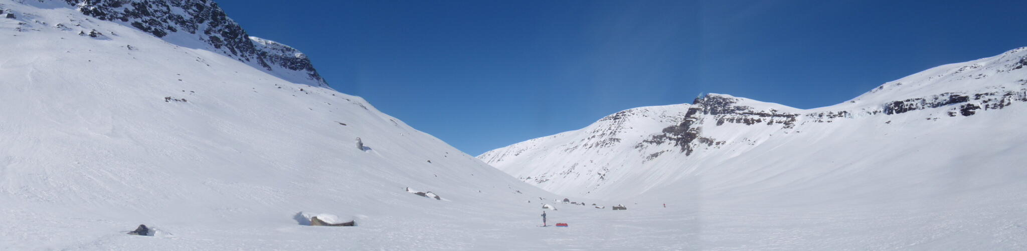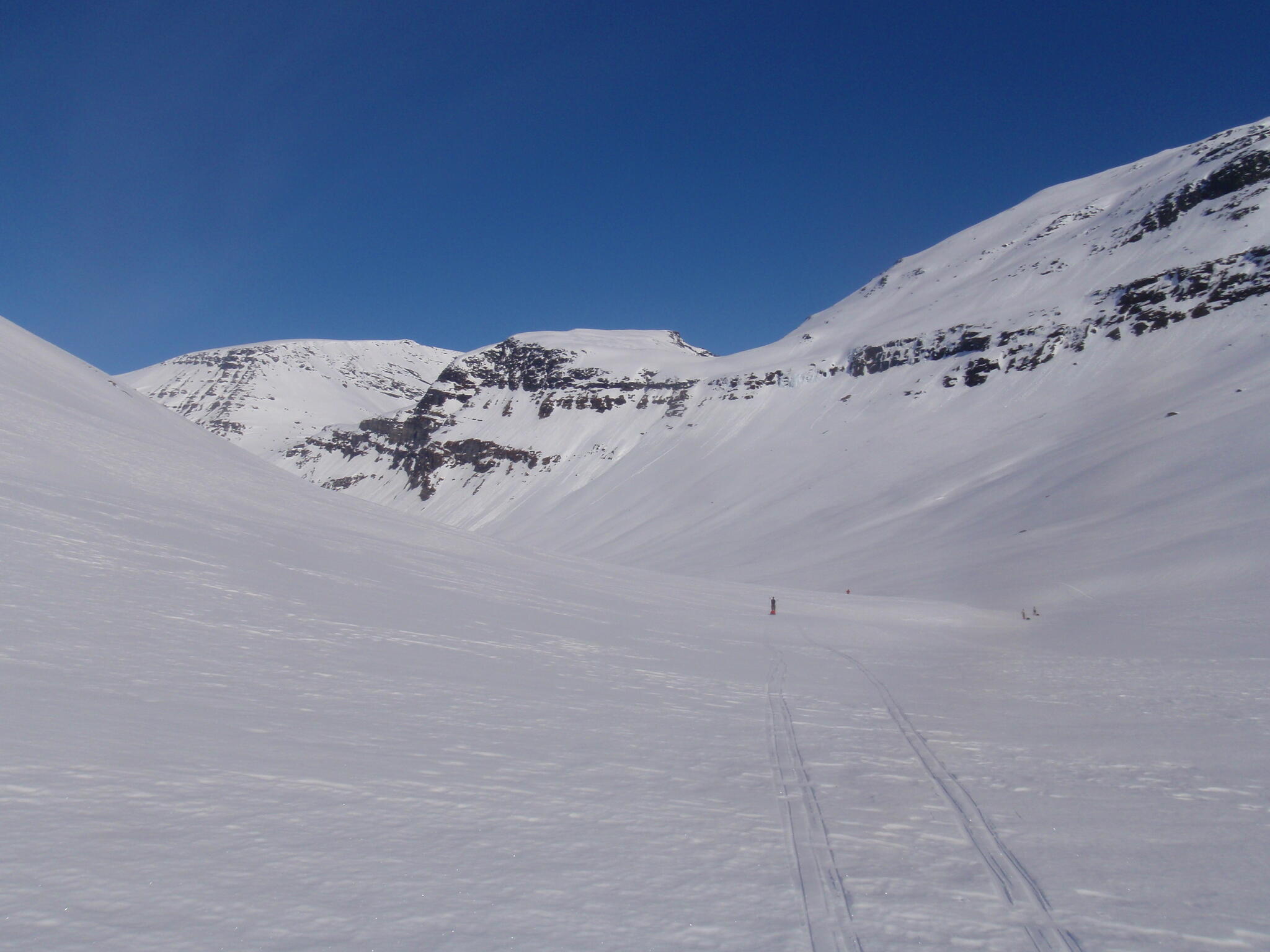 Gasasvaggi svänger högre upp åt nordväst och efter ett litet pass över går den i dalen Skinskardet / Duolljevággi. Vi skidade dit. Lämnade pulkorna där och gjorde en liten tur till den smala dalen mellan fjället Isogaisi och Tverrfjellet. Branta bergväggar men också massor av skoterspår. Lite oväntat och det blev inte den fina upplevelse vi hoppats på.