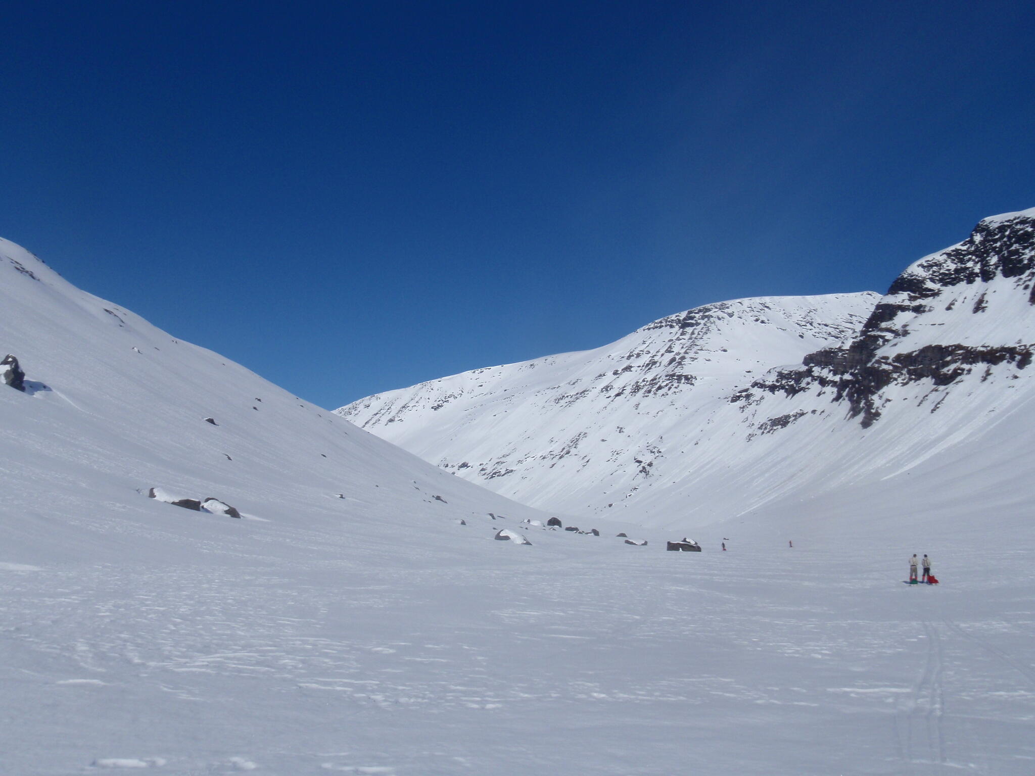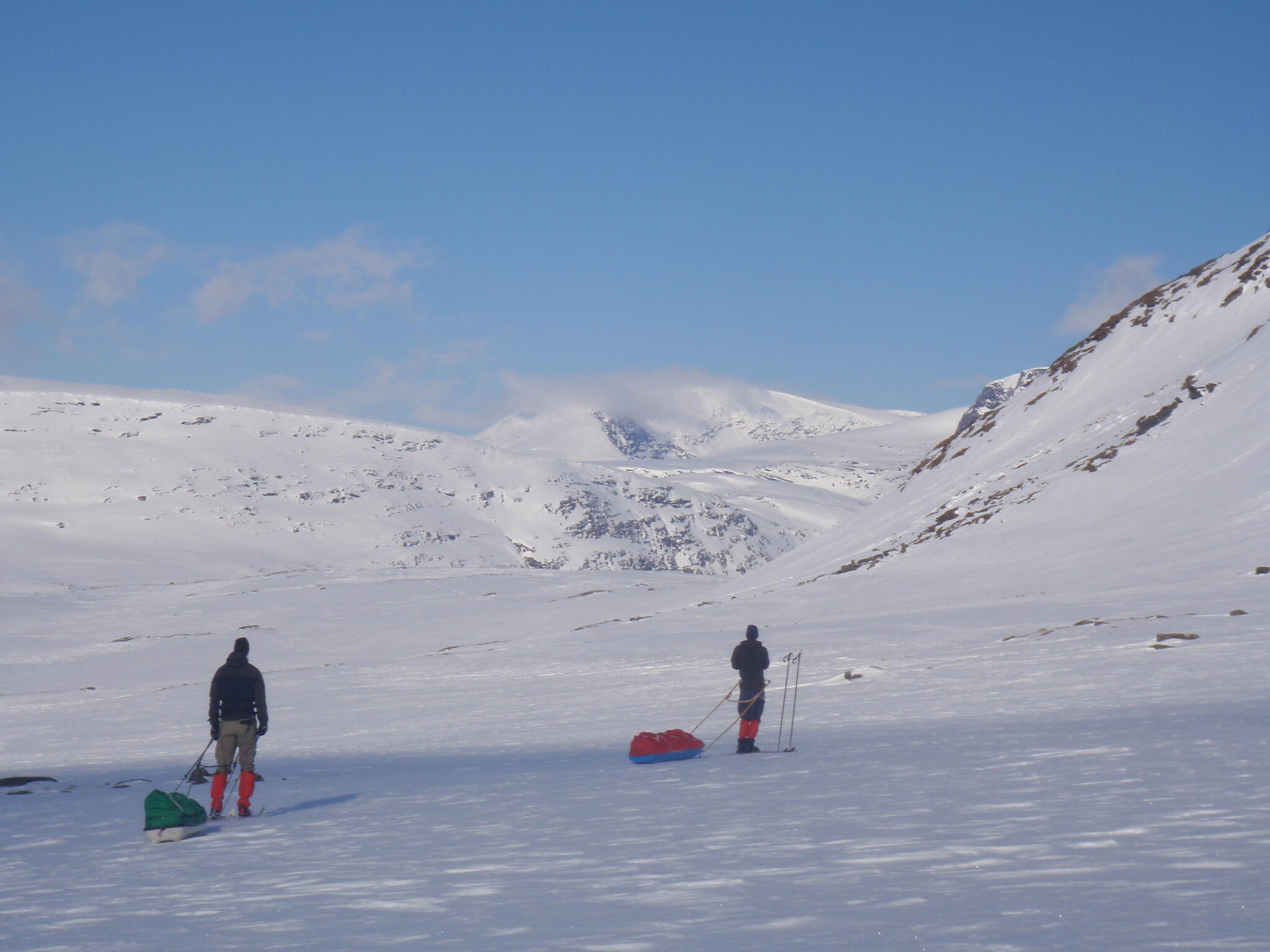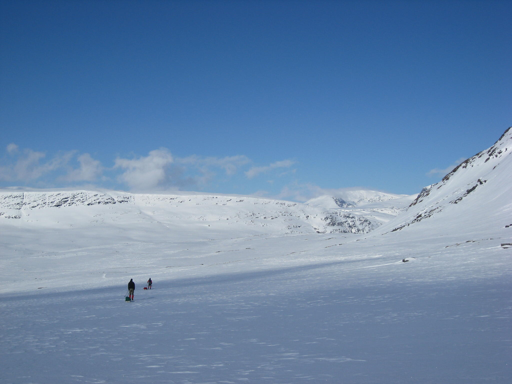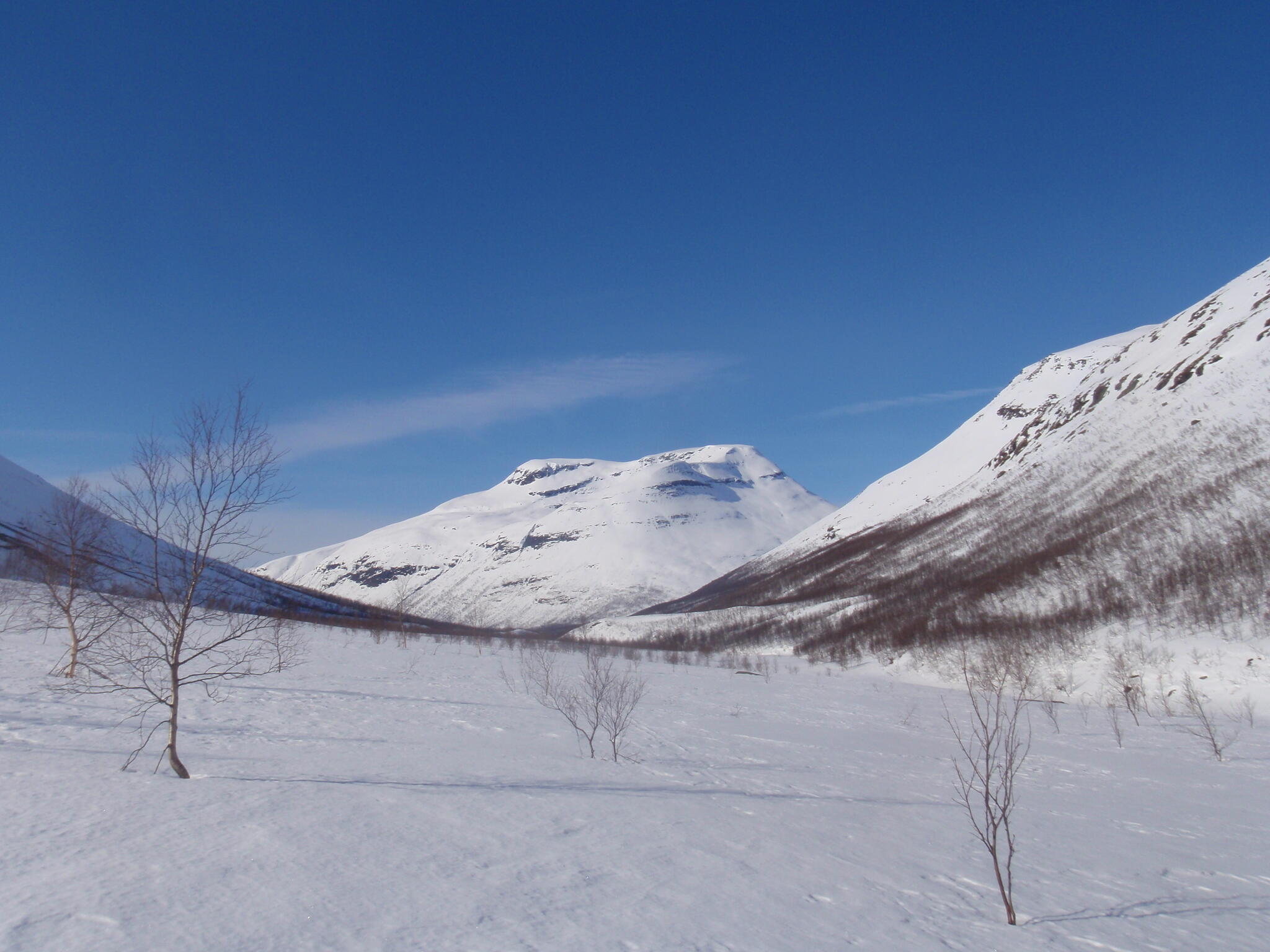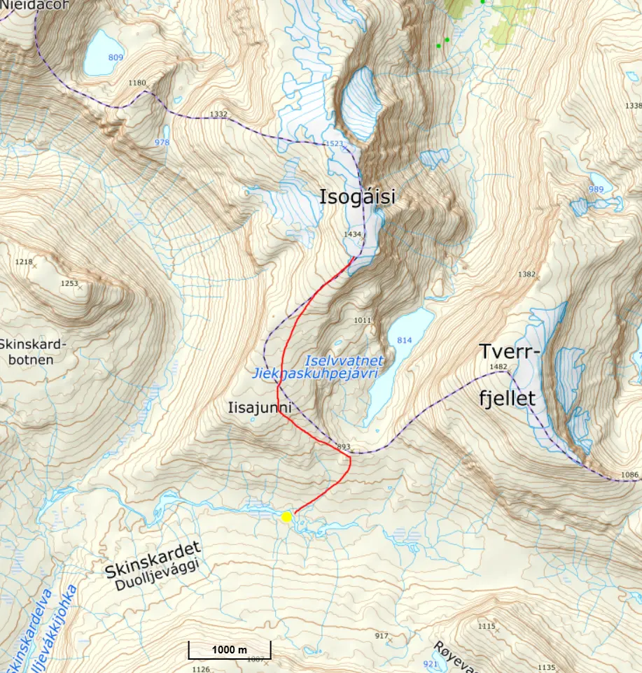 Gasasvaggi svänger högre upp åt nordväst och efter ett litet pass över går den i dalen Skinskardet / Duolljevággi. Vi skidade dit. Lämnade pulkorna där och gjorde en liten tur till den smala dalen mellan fjället Isogaisi och Tverrfjellet. Branta bergväggar men också massor av skoterspår. Lite oväntat och det blev inte den fina upplevelse vi hoppats på.