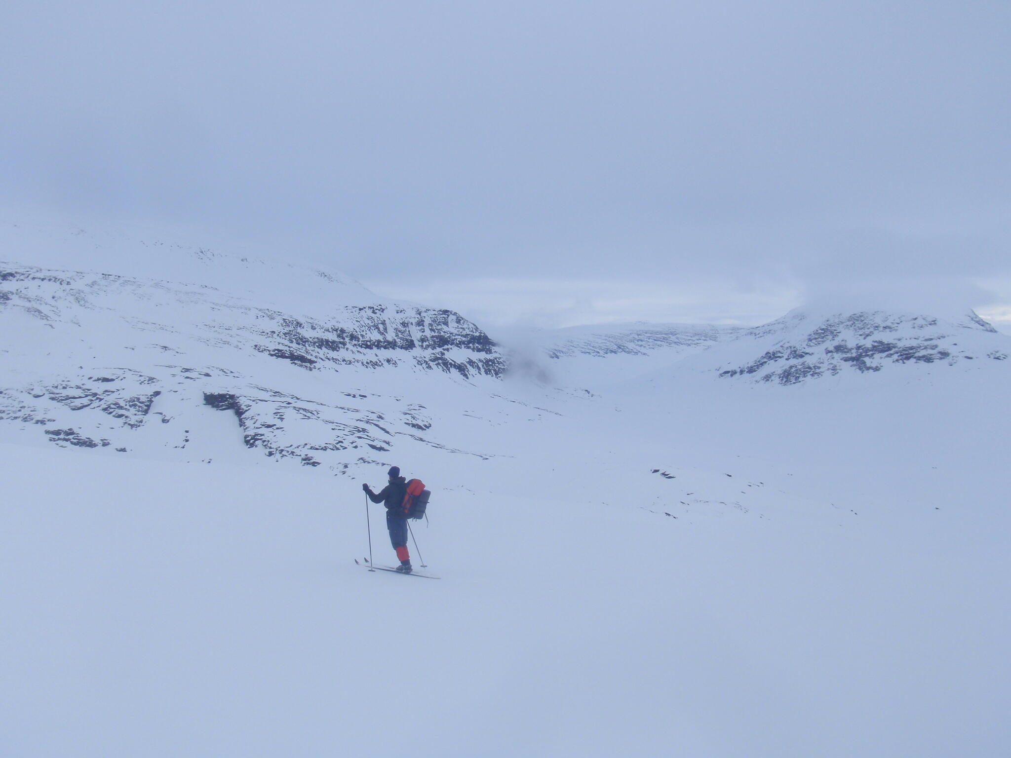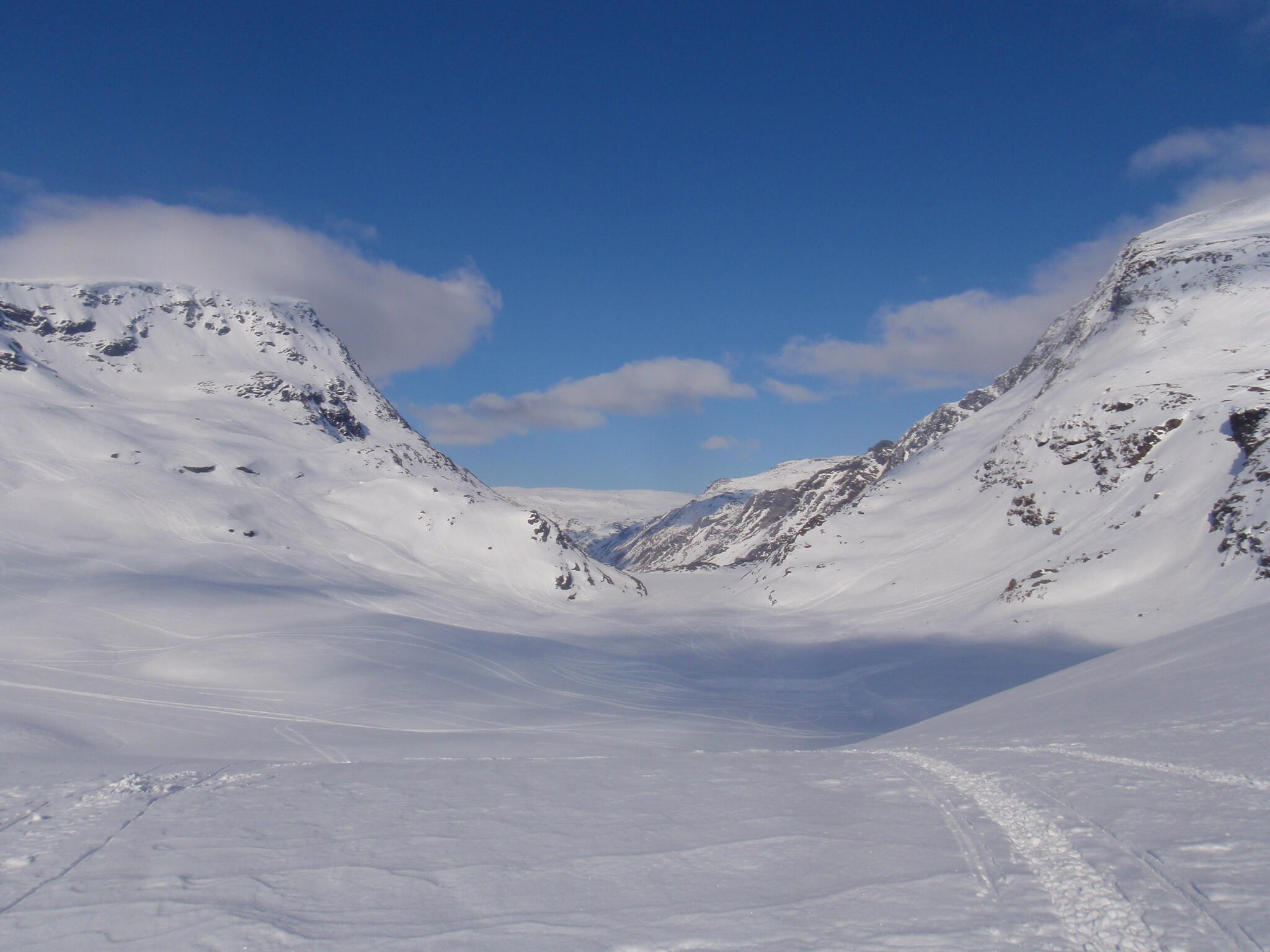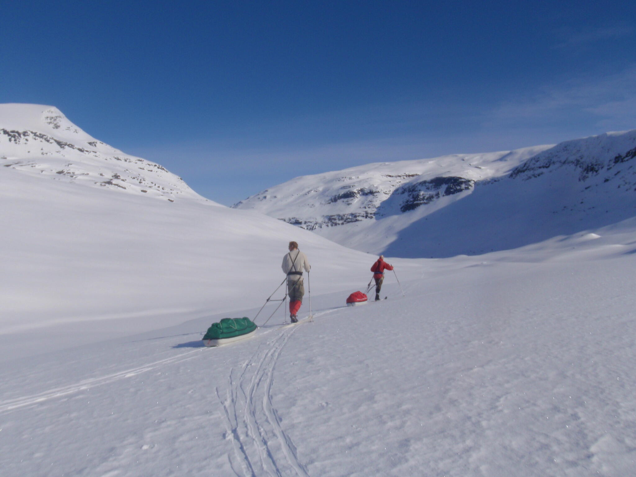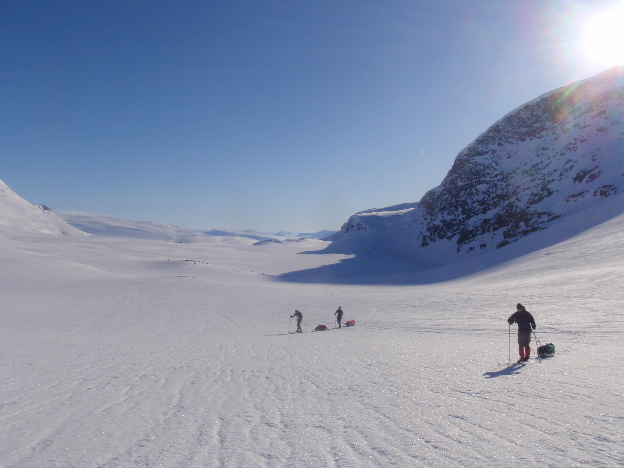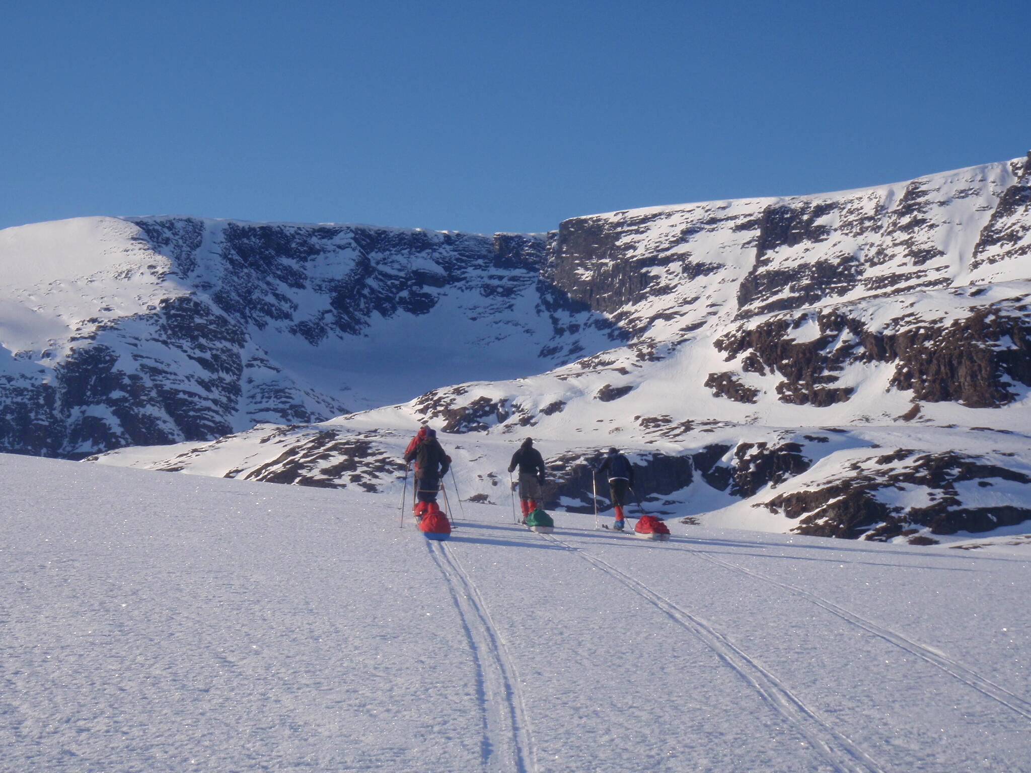 Gasasvaggi svänger högre upp åt nordväst och efter ett litet pass över går den i dalen Skinskardet / Duolljevággi. Vi skidade dit. Lämnade pulkorna där och gjorde en liten tur till den smala dalen mellan fjället Isogaisi och Tverrfjellet. Branta bergväggar men också massor av skoterspår. Lite oväntat och det blev inte den fina upplevelse vi hoppats på.