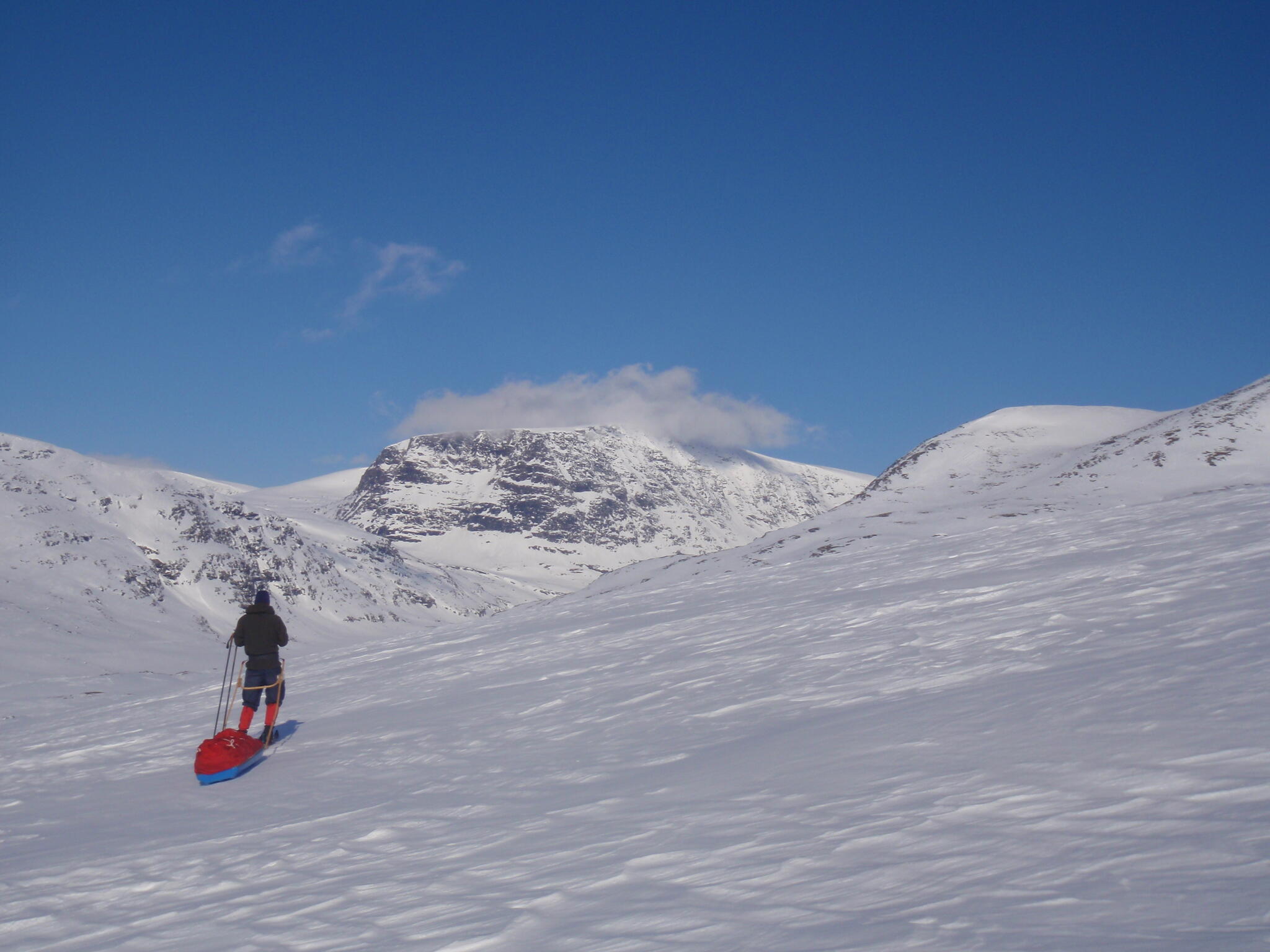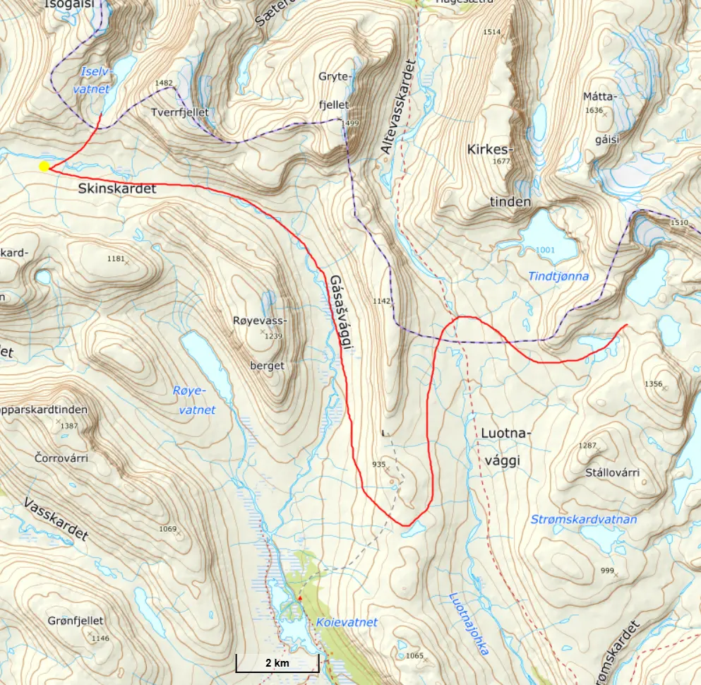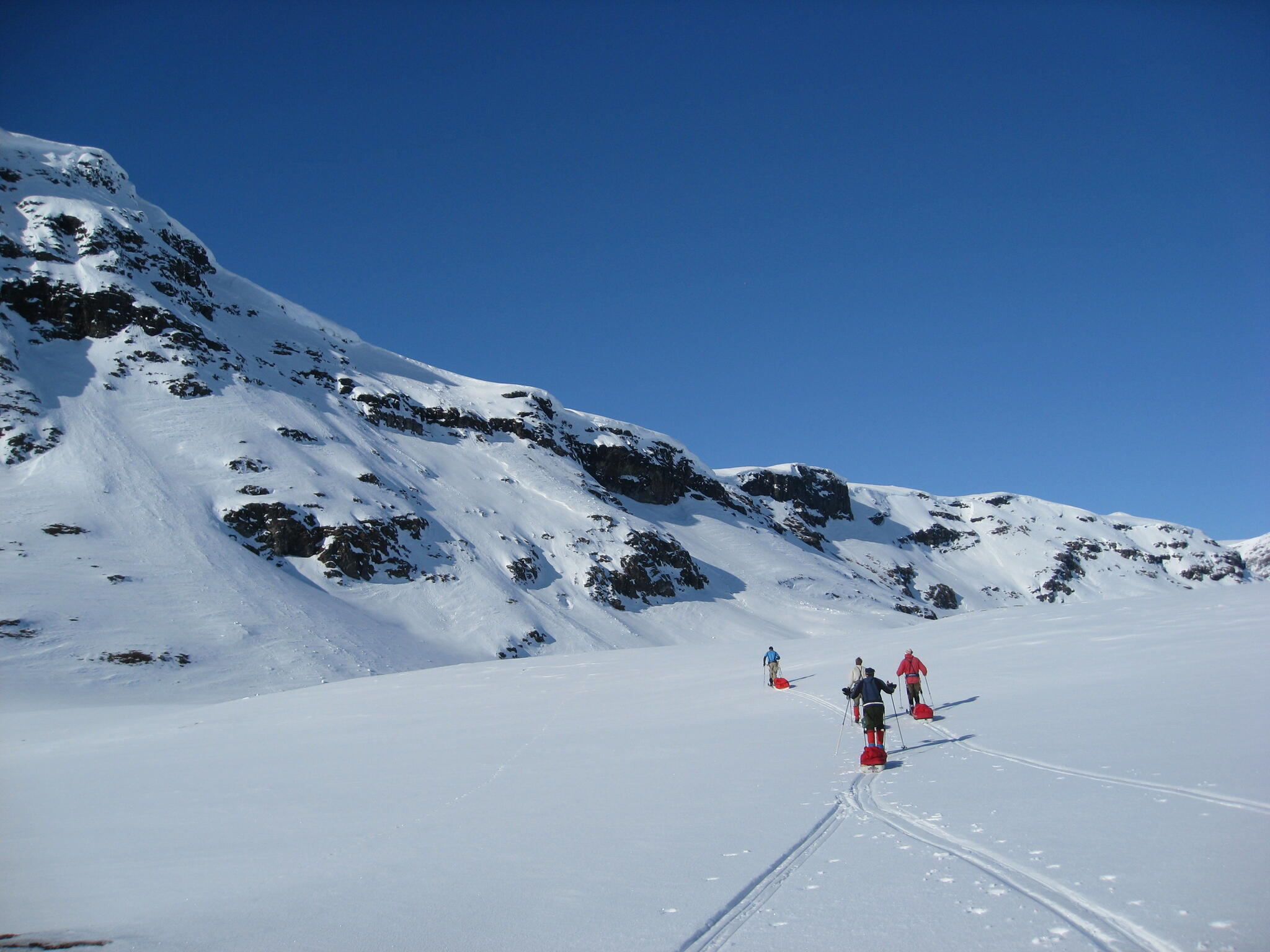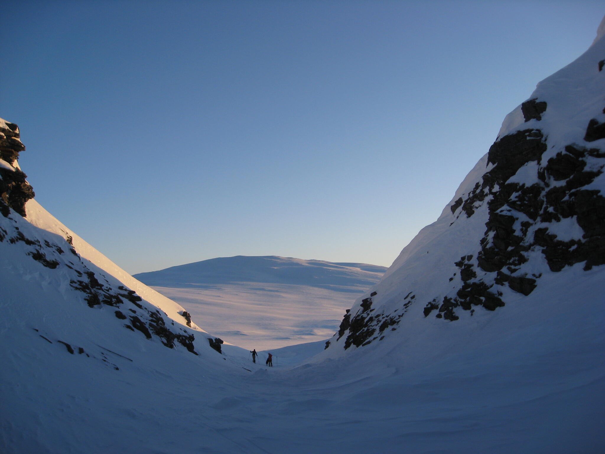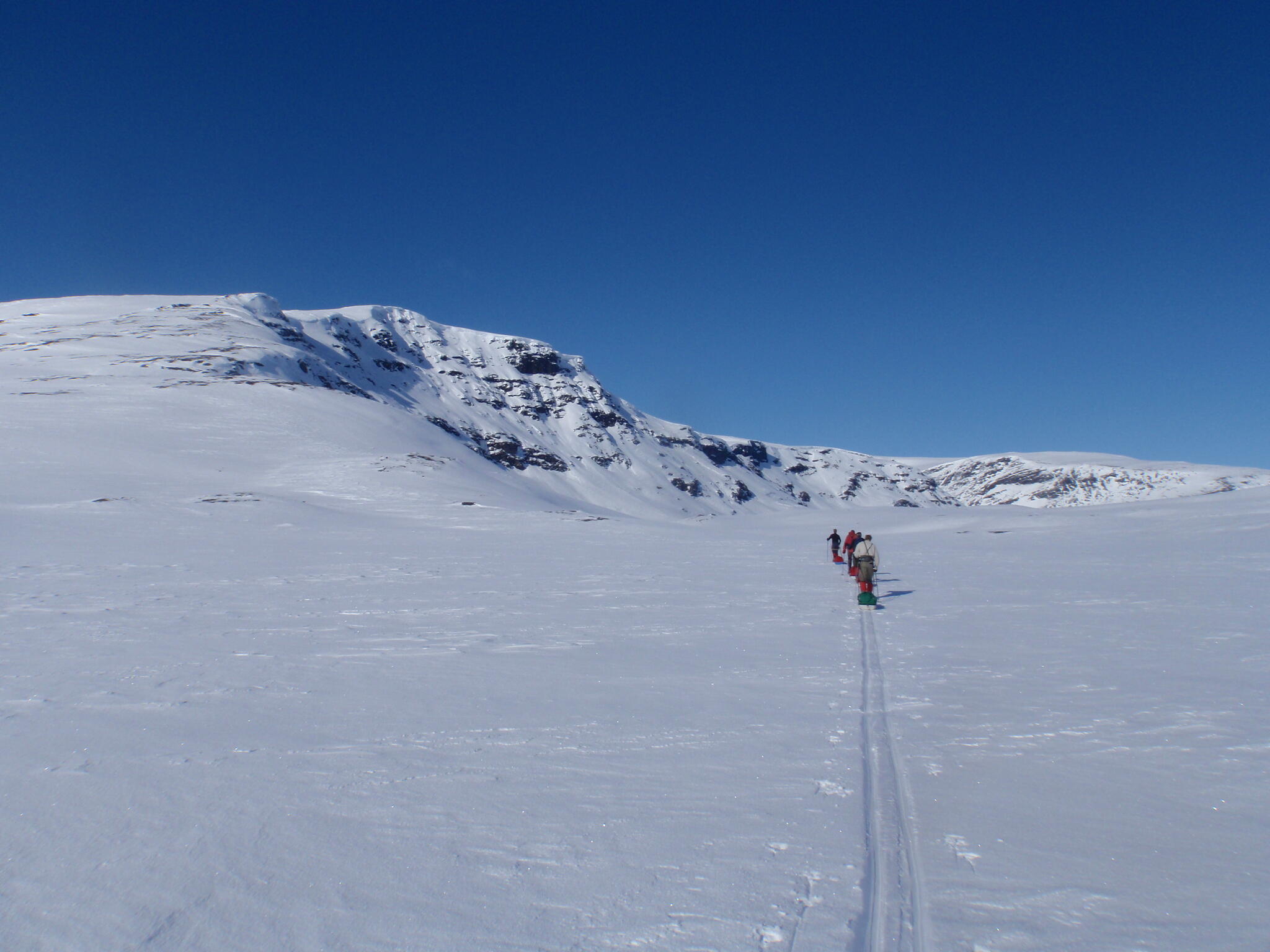 Gasasvaggi svänger högre upp åt nordväst och efter ett litet pass över går den i dalen Skinskardet / Duolljevággi. Vi skidade dit. Lämnade pulkorna där och gjorde en liten tur till den smala dalen mellan fjället Isogaisi och Tverrfjellet. Branta bergväggar men också massor av skoterspår. Lite oväntat och det blev inte den fina upplevelse vi hoppats på.