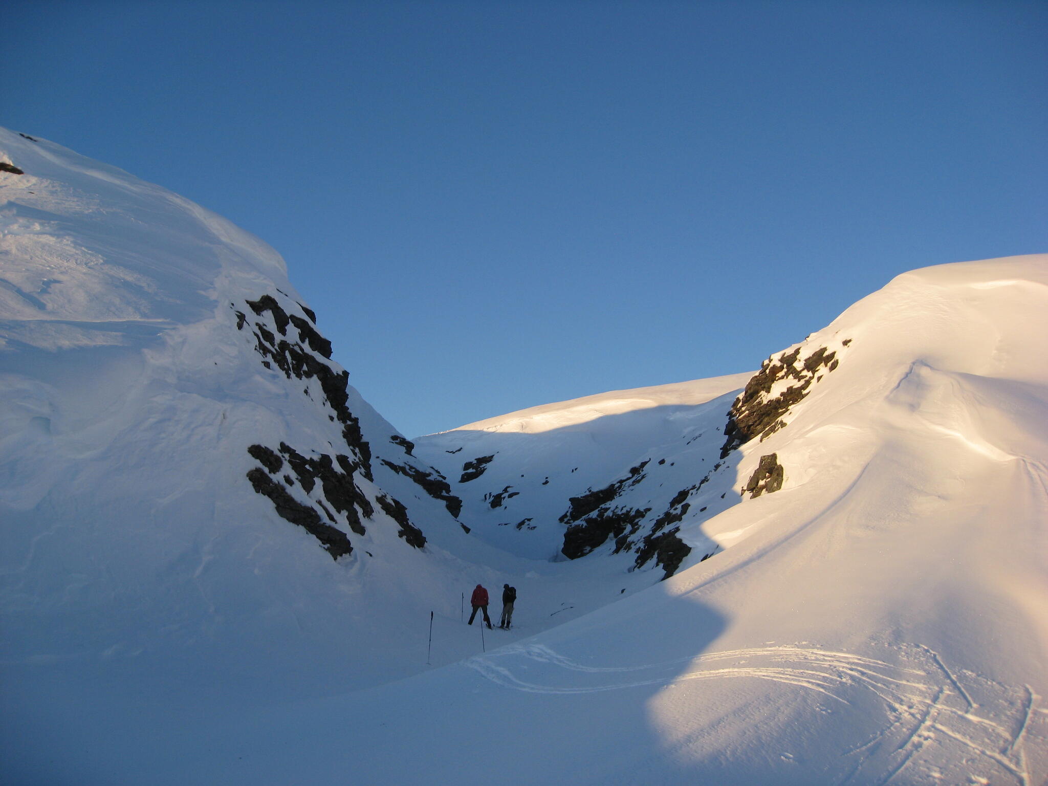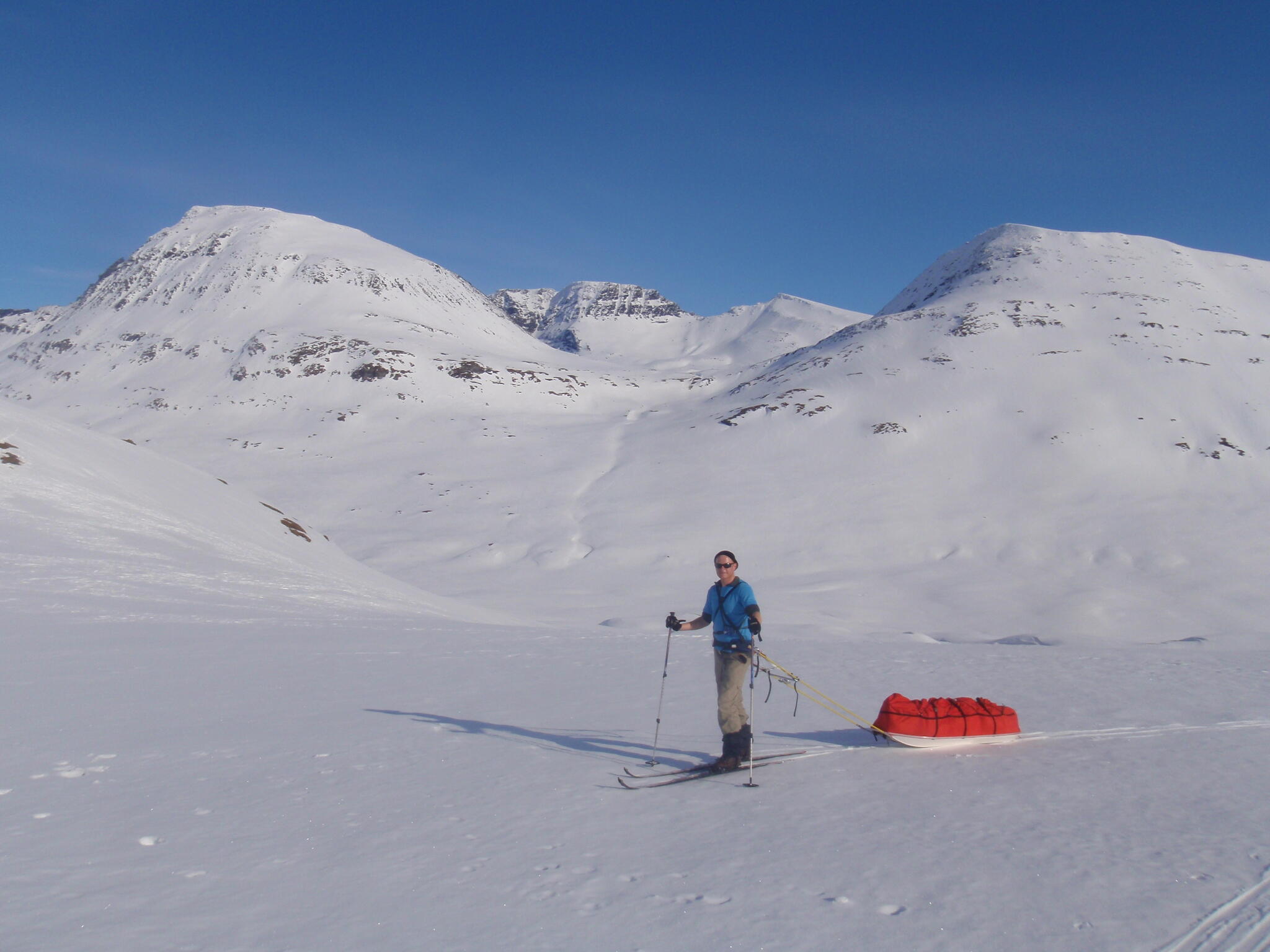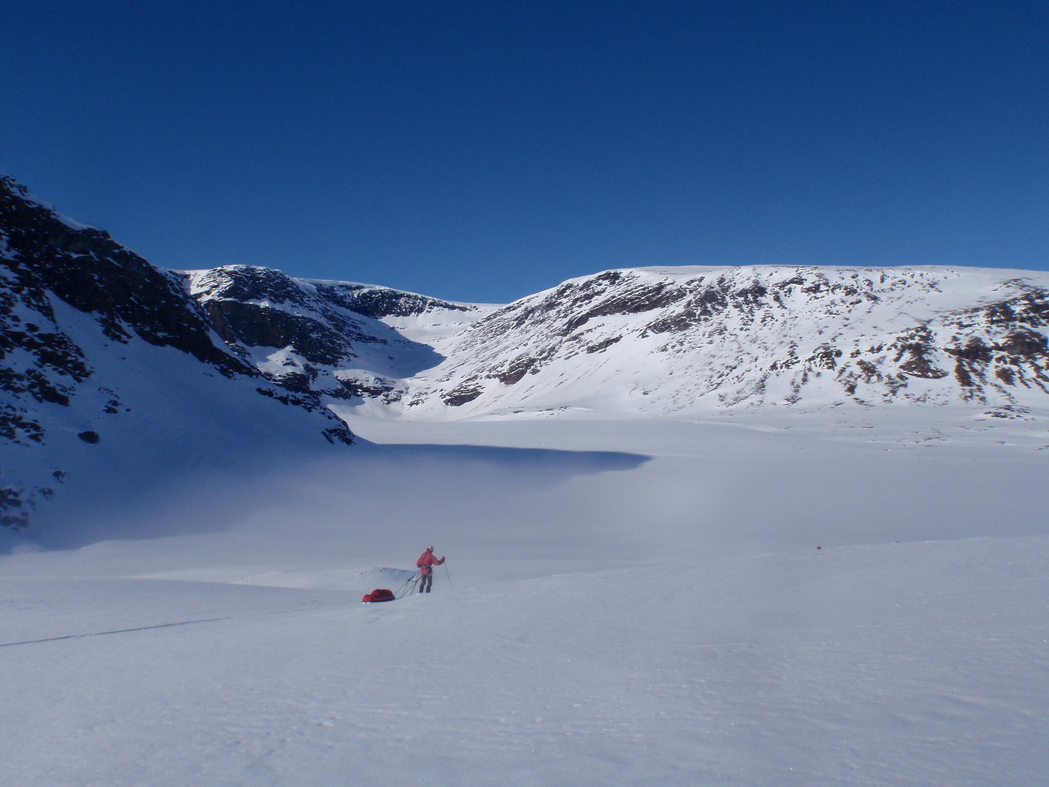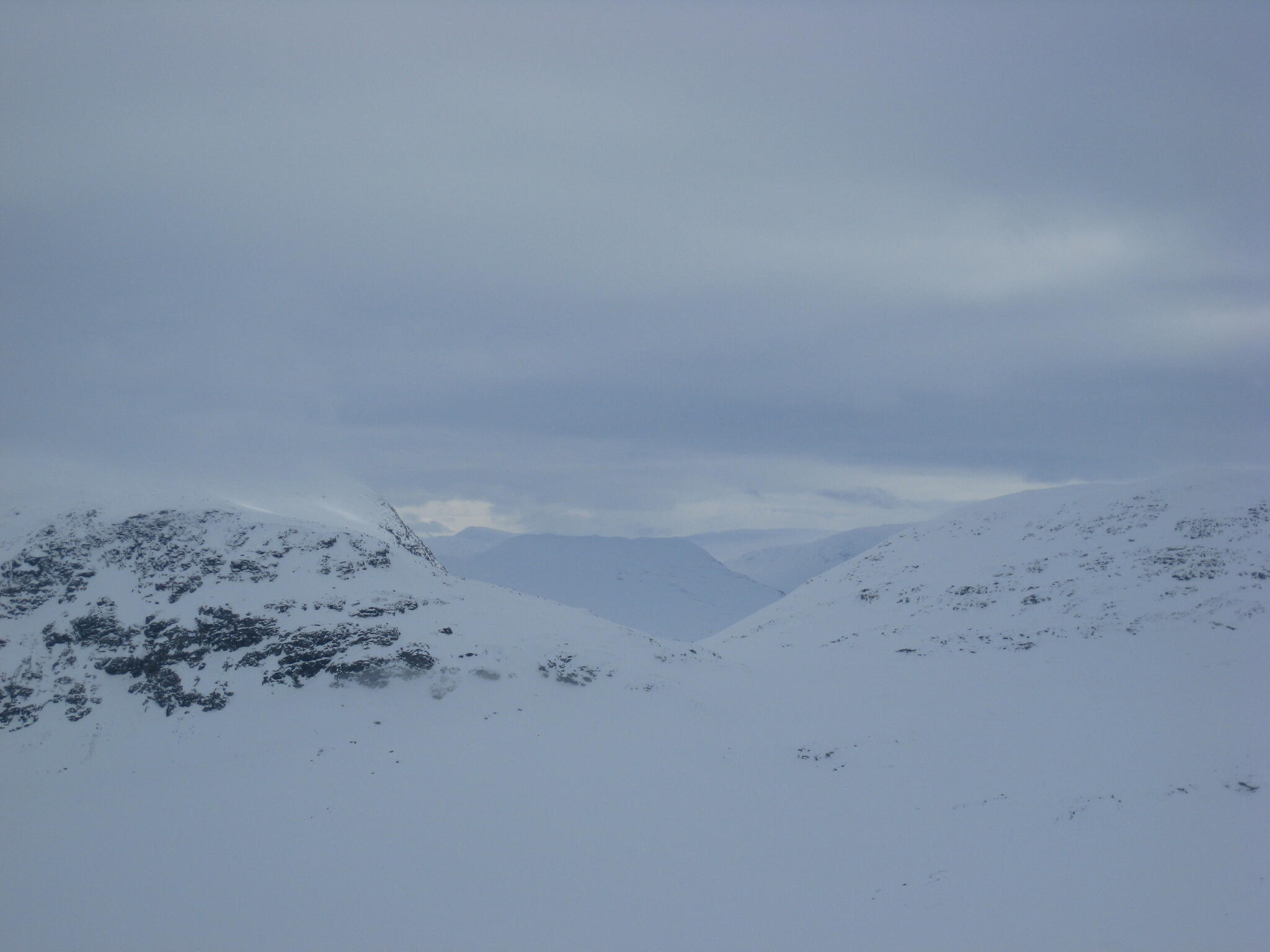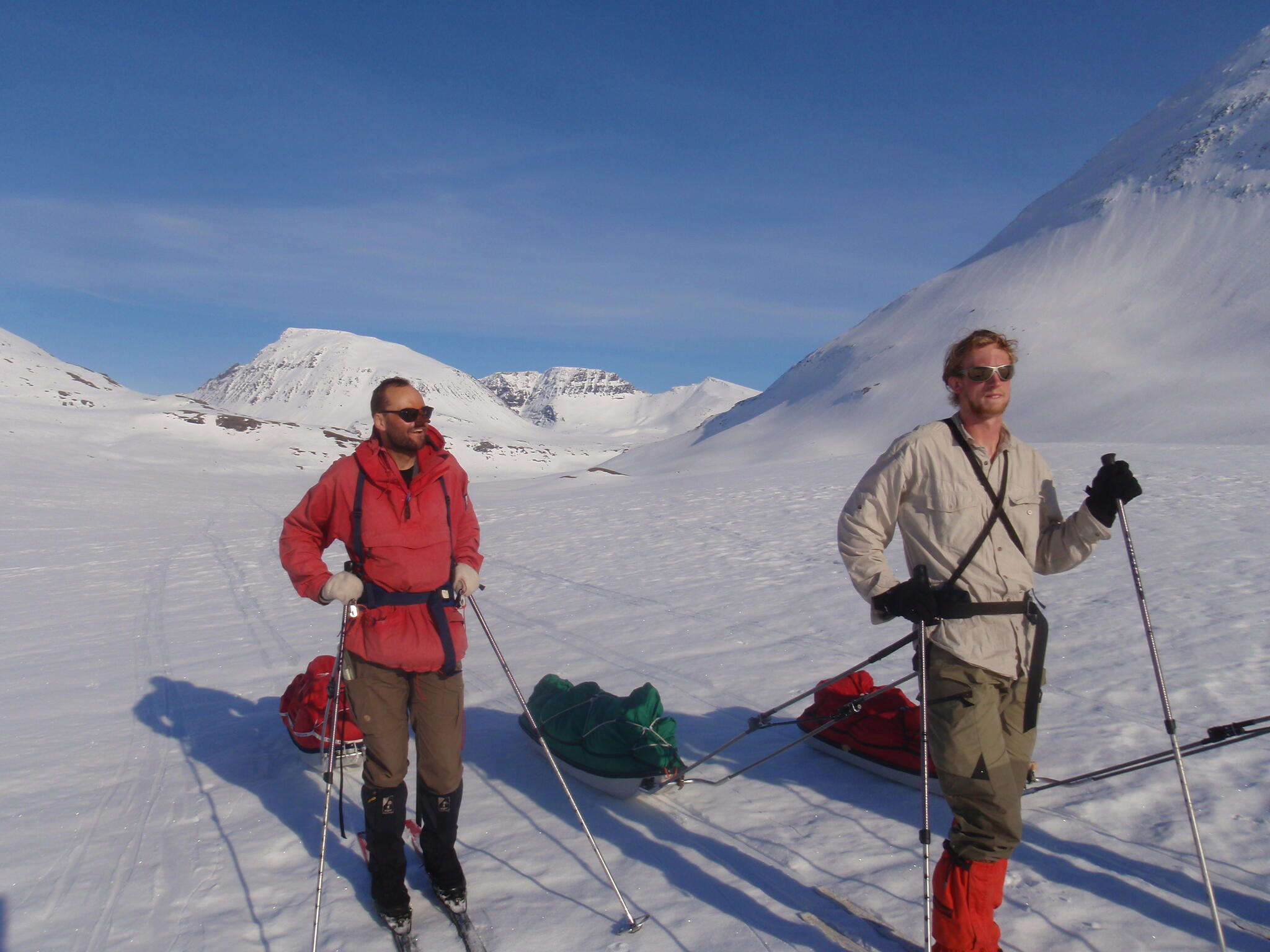 Gasasvaggi svänger högre upp åt nordväst och efter ett litet pass över går den i dalen Skinskardet / Duolljevággi. Vi skidade dit. Lämnade pulkorna där och gjorde en liten tur till den smala dalen mellan fjället Isogaisi och Tverrfjellet. Branta bergväggar men också massor av skoterspår. Lite oväntat och det blev inte den fina upplevelse vi hoppats på.