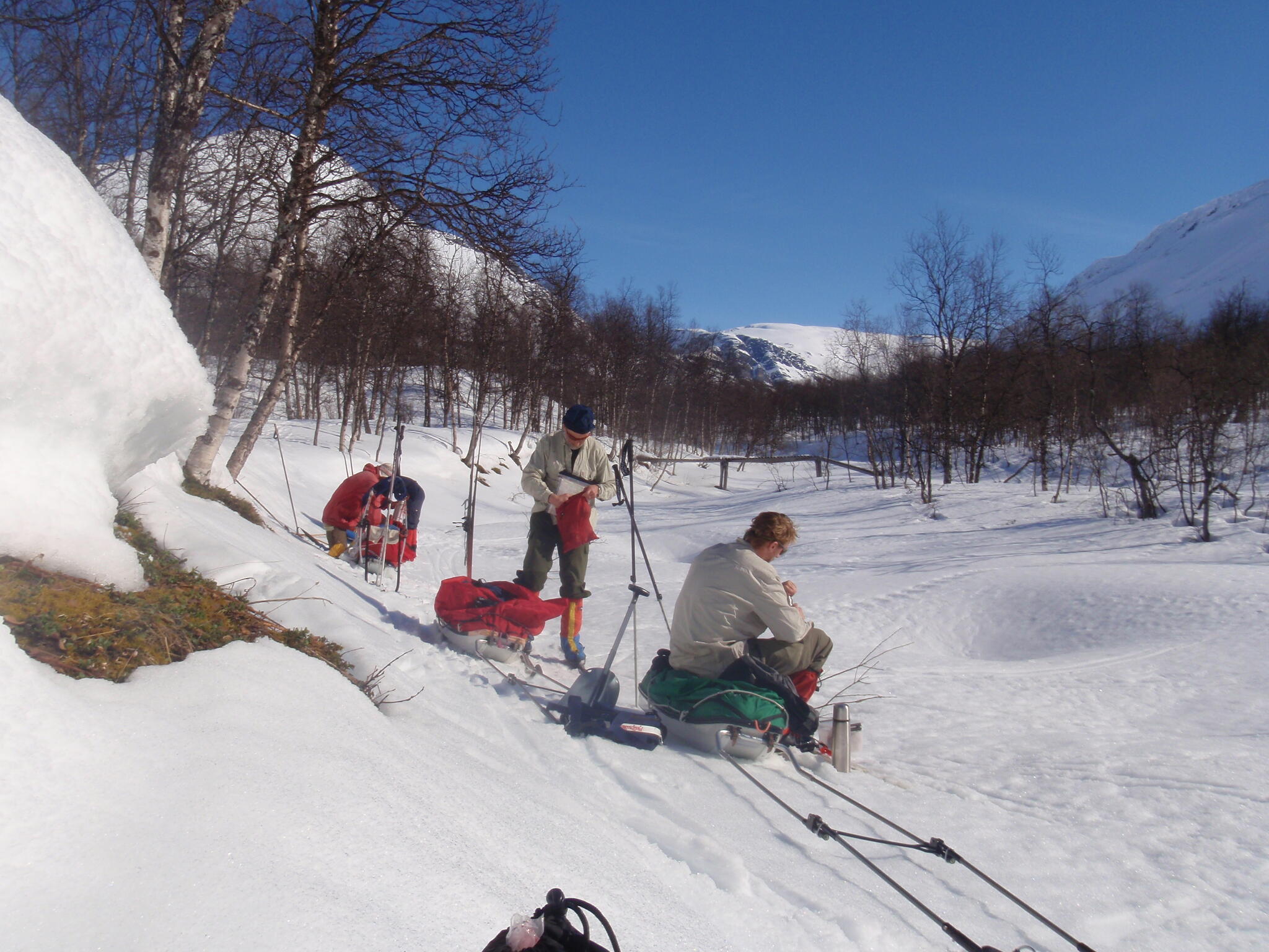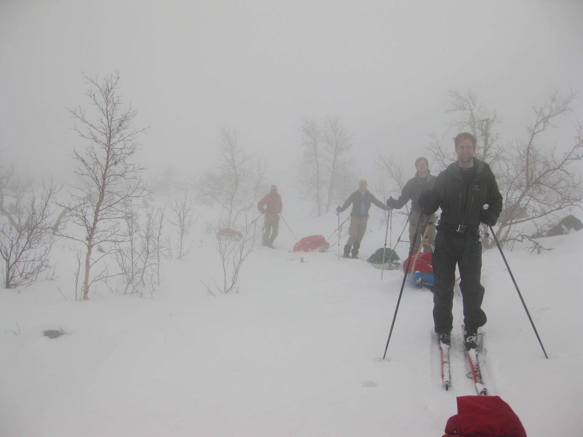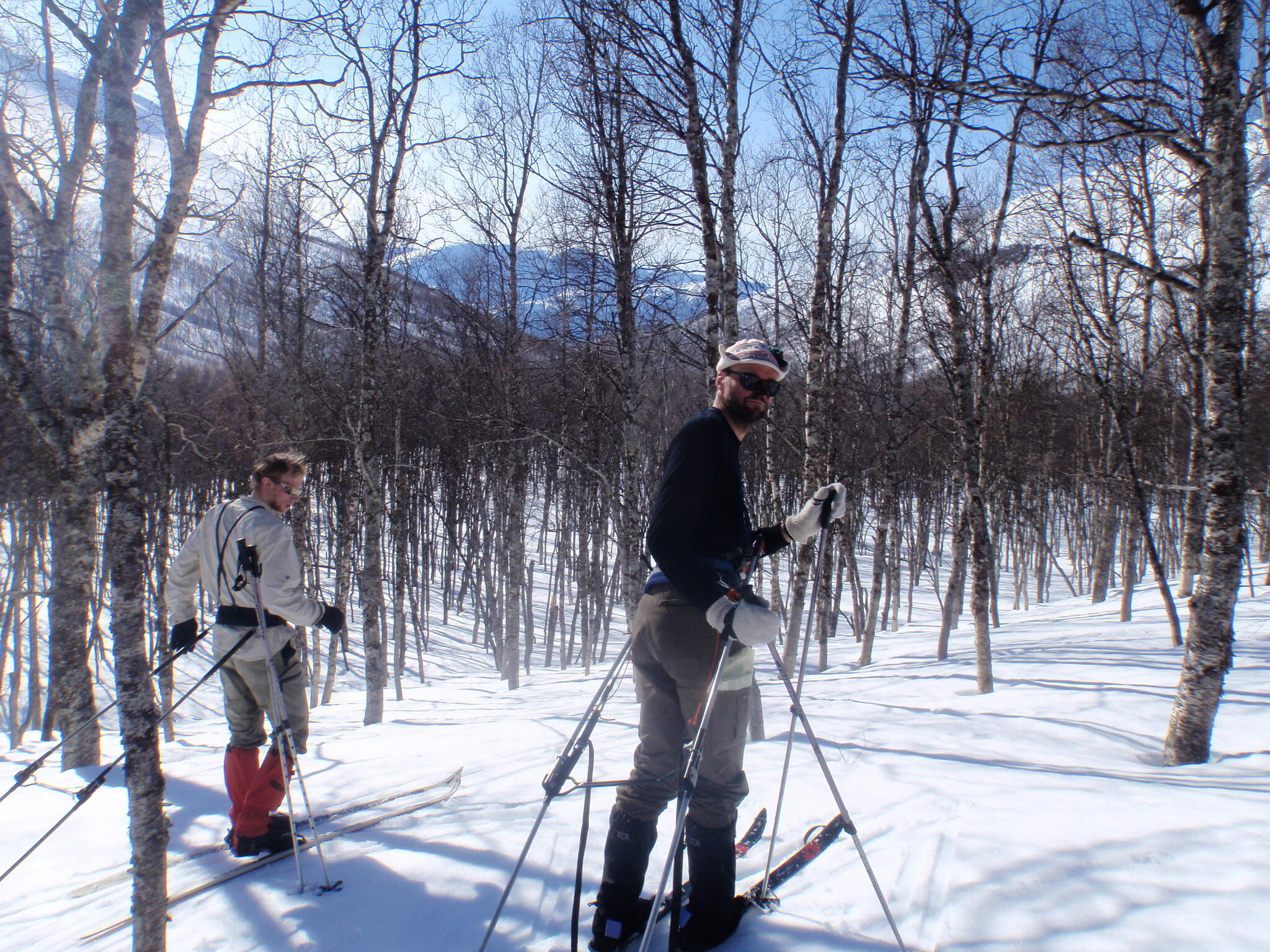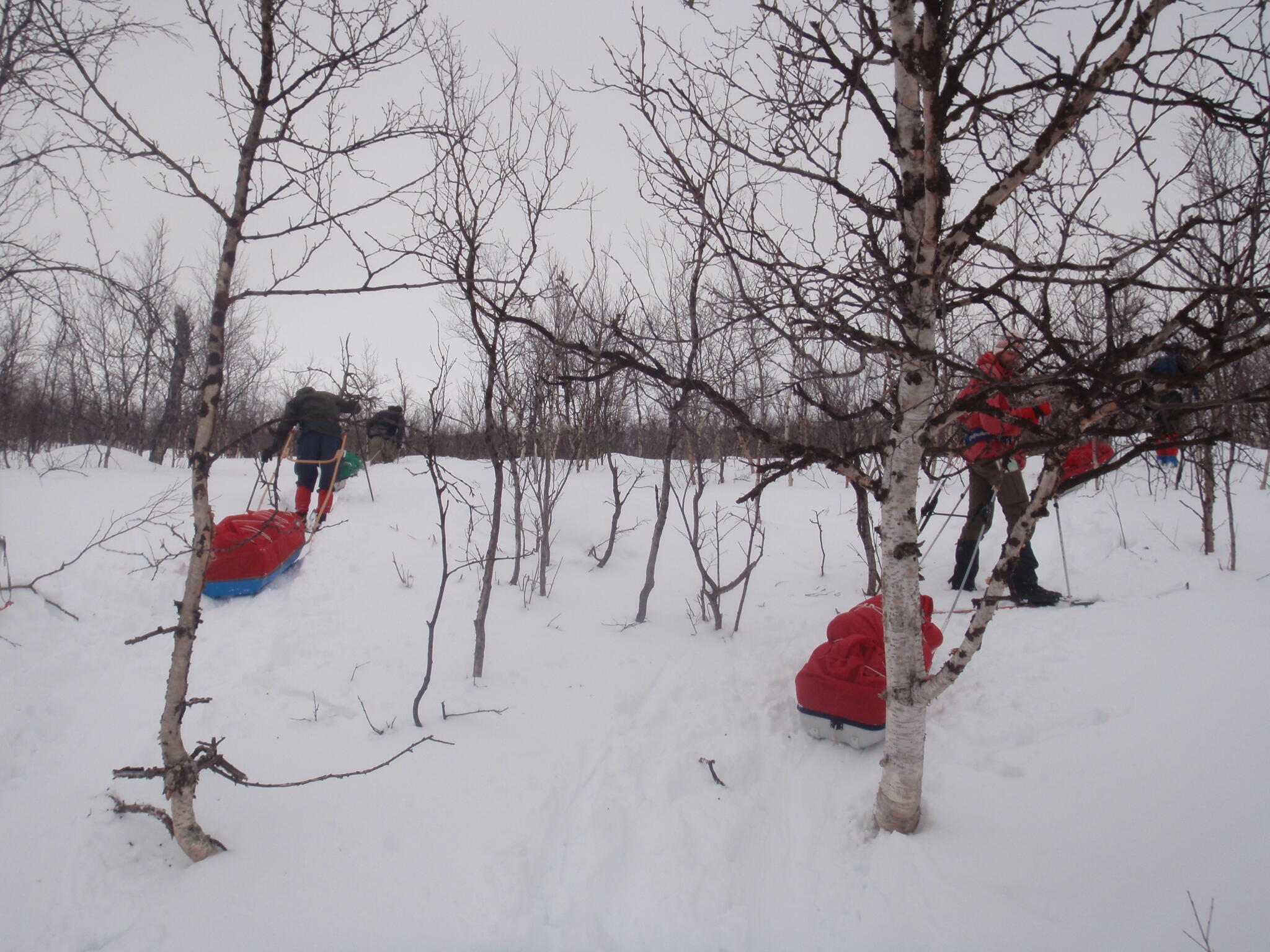 Skidföret var enligt Magnus S hans "livs sämsta skidföre" upp genom björkskogen. Snöytan brast, det sjönk till ungefär knäna och det fastnade. En av oss fick vara spårare och skida utan pulka. Magnus A gick näst sist och drog två pulkor.