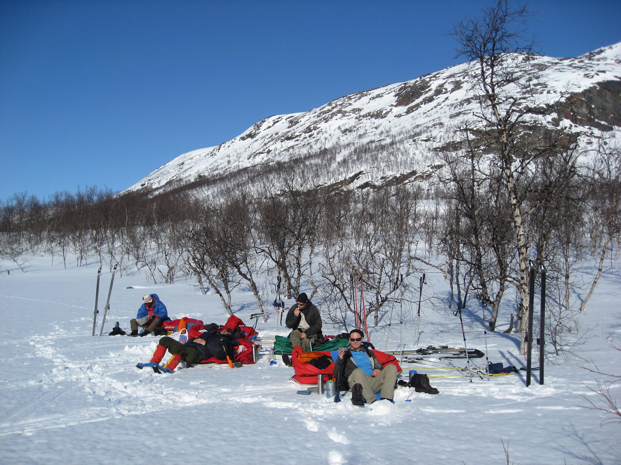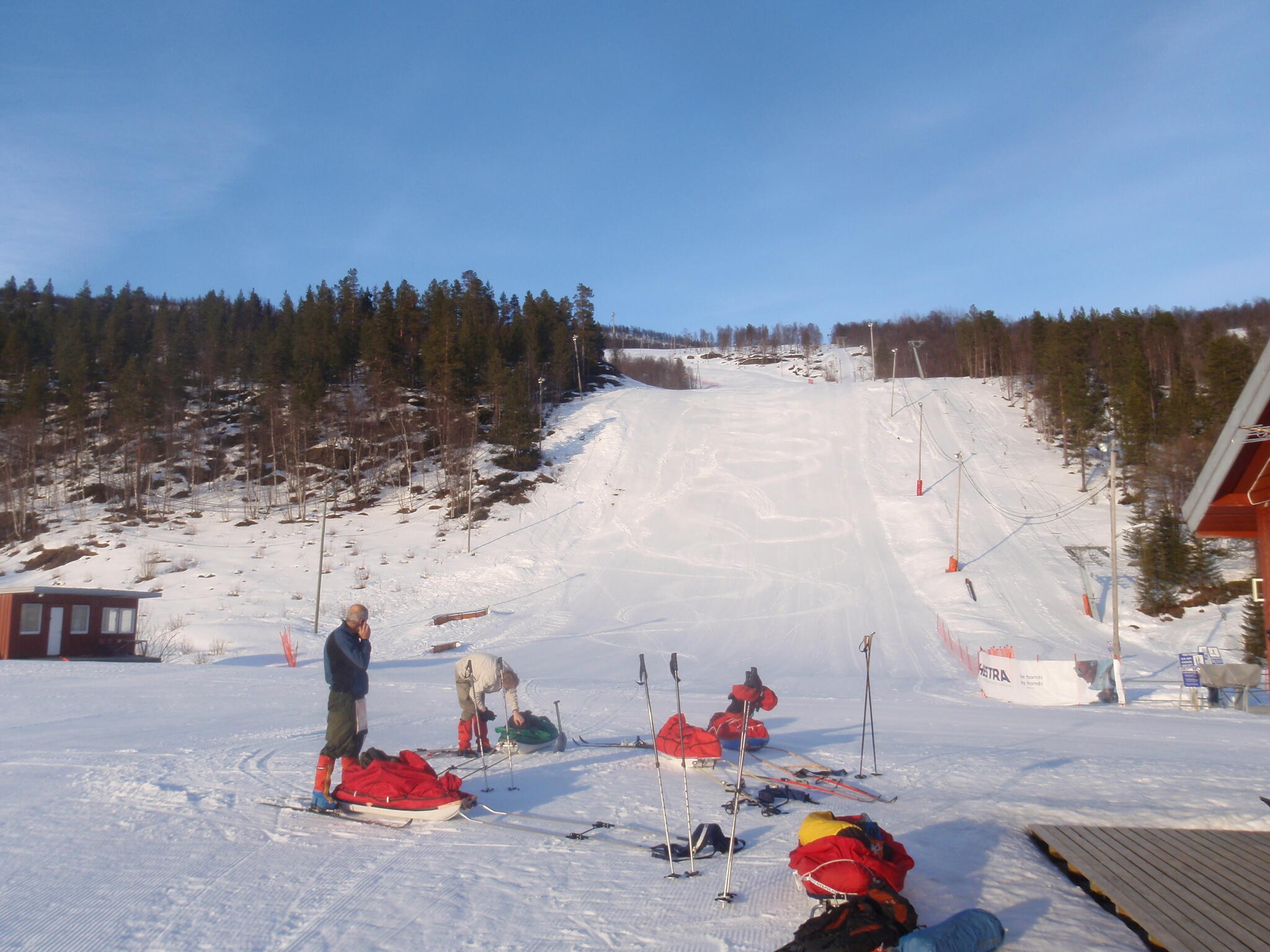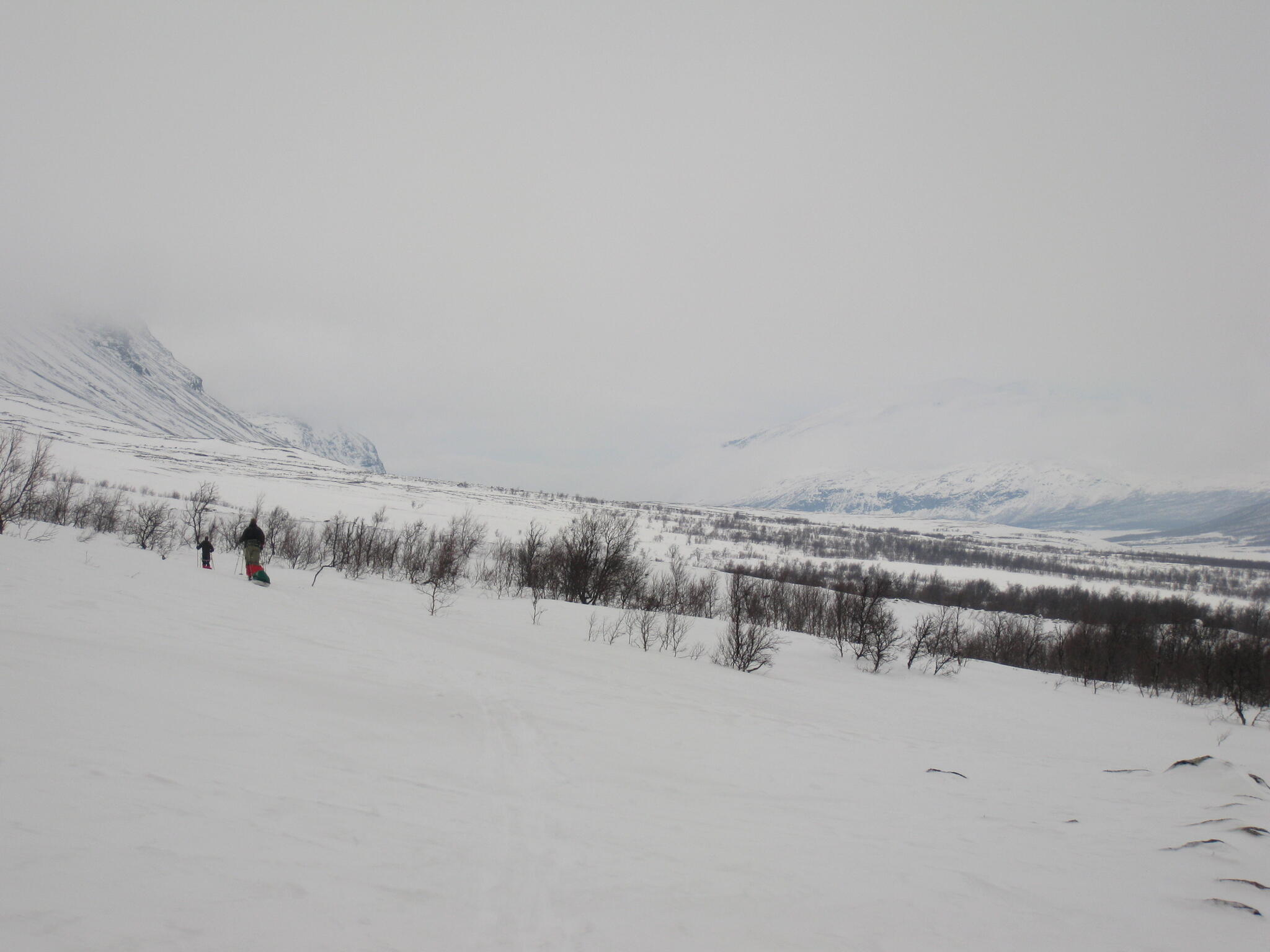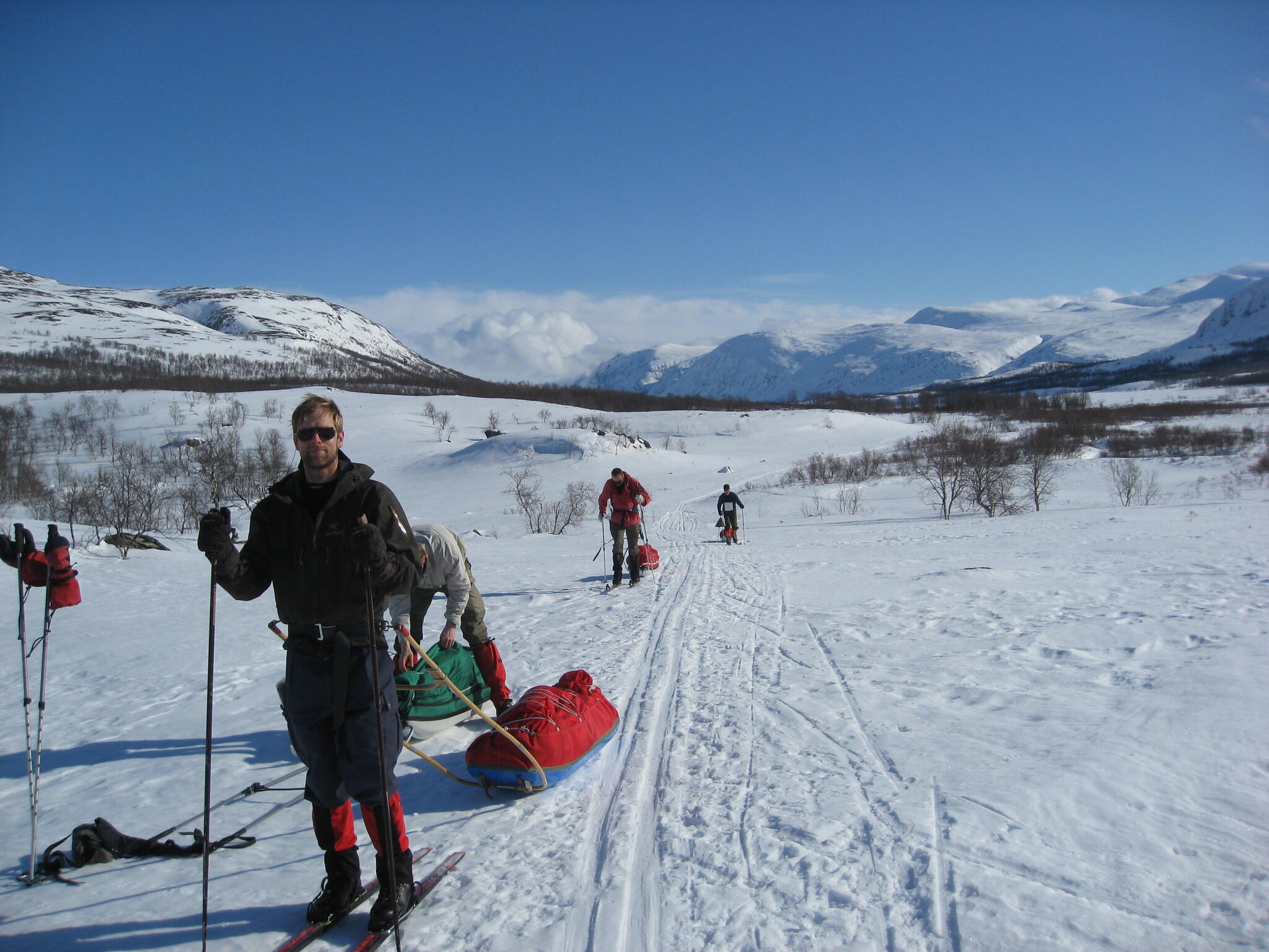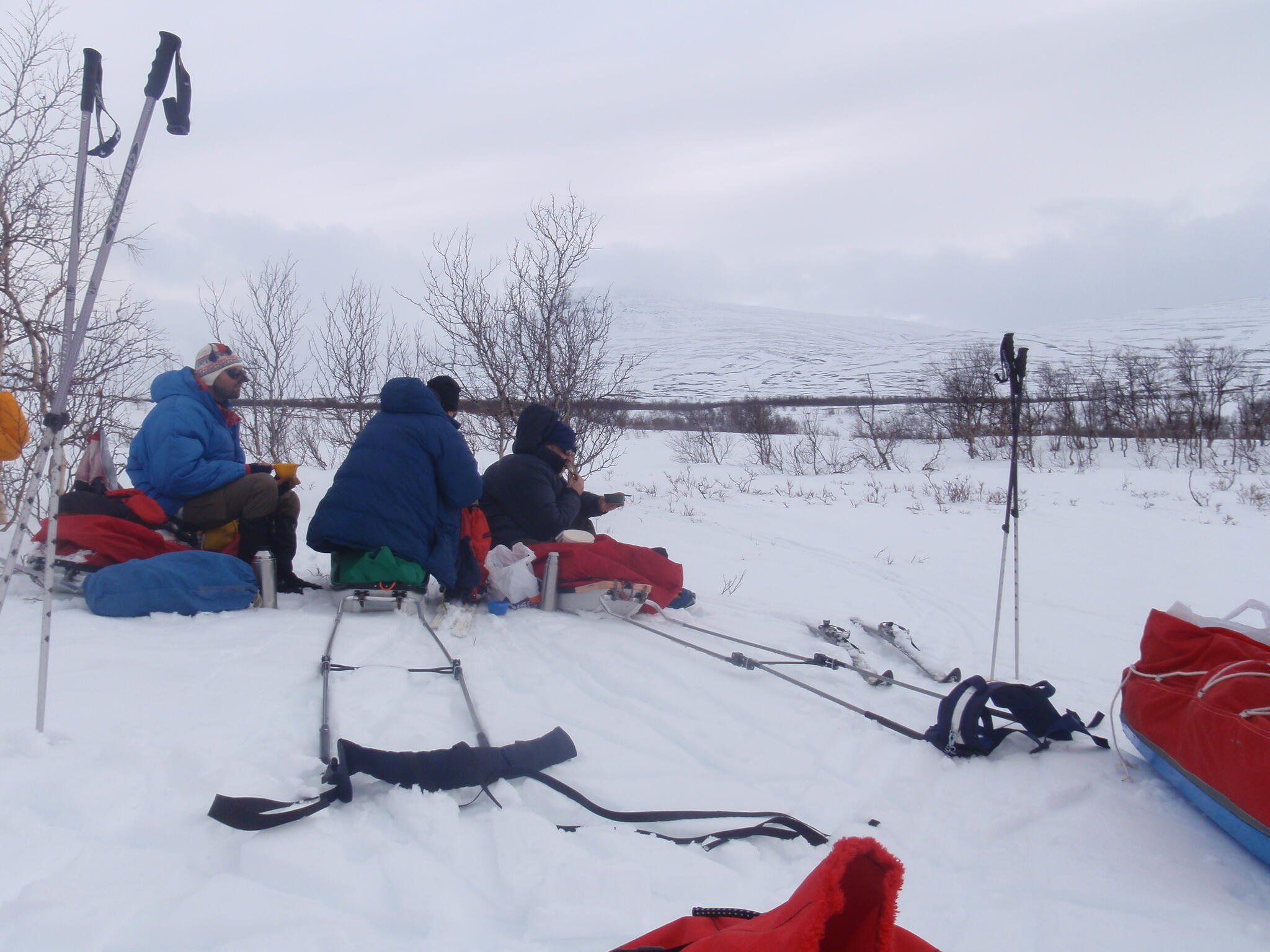 Skidföret var enligt Magnus S hans "livs sämsta skidföre" upp genom björkskogen. Snöytan brast, det sjönk till ungefär knäna och det fastnade. En av oss fick vara spårare och skida utan pulka. Magnus A gick näst sist och drog två pulkor.