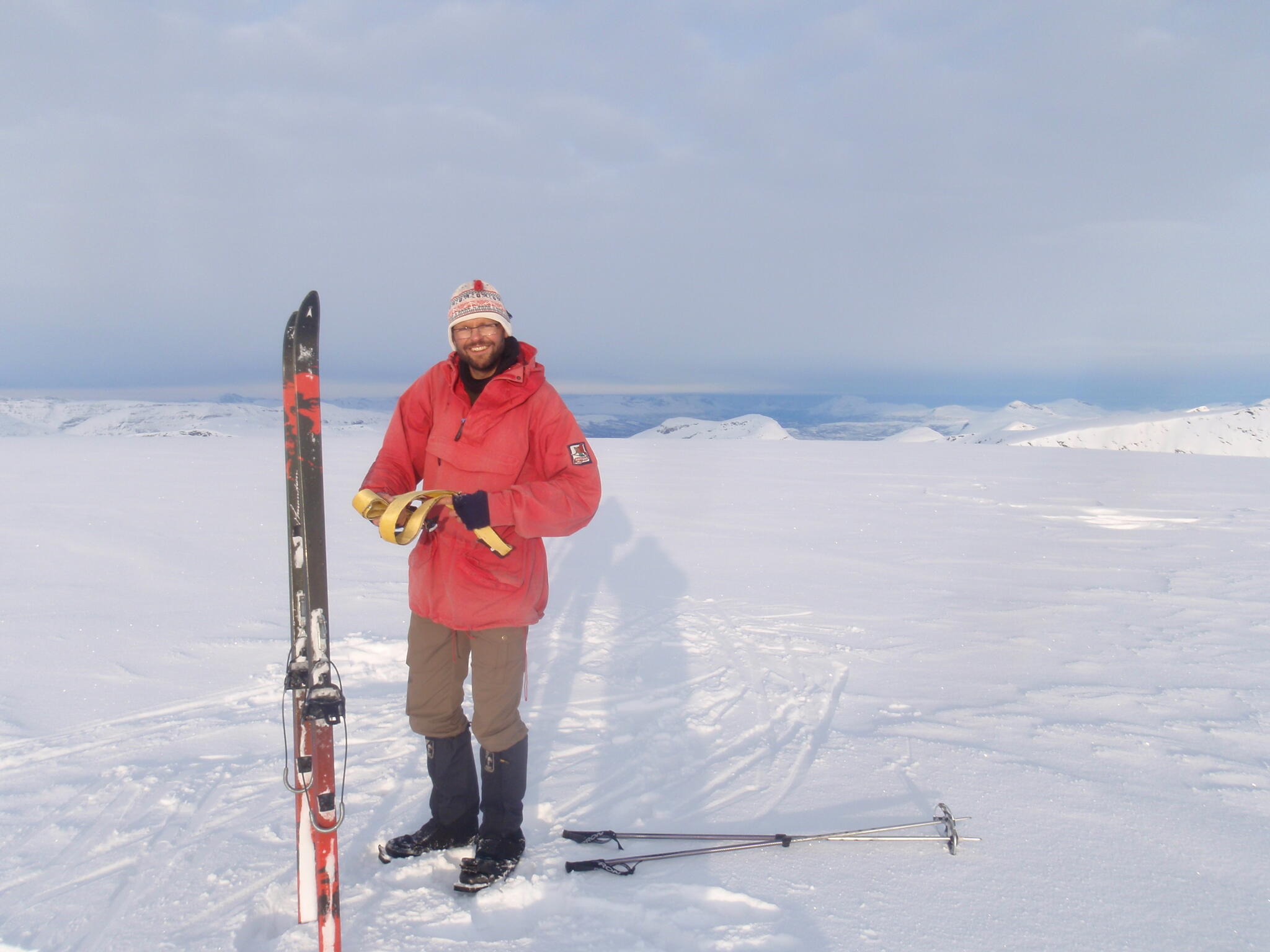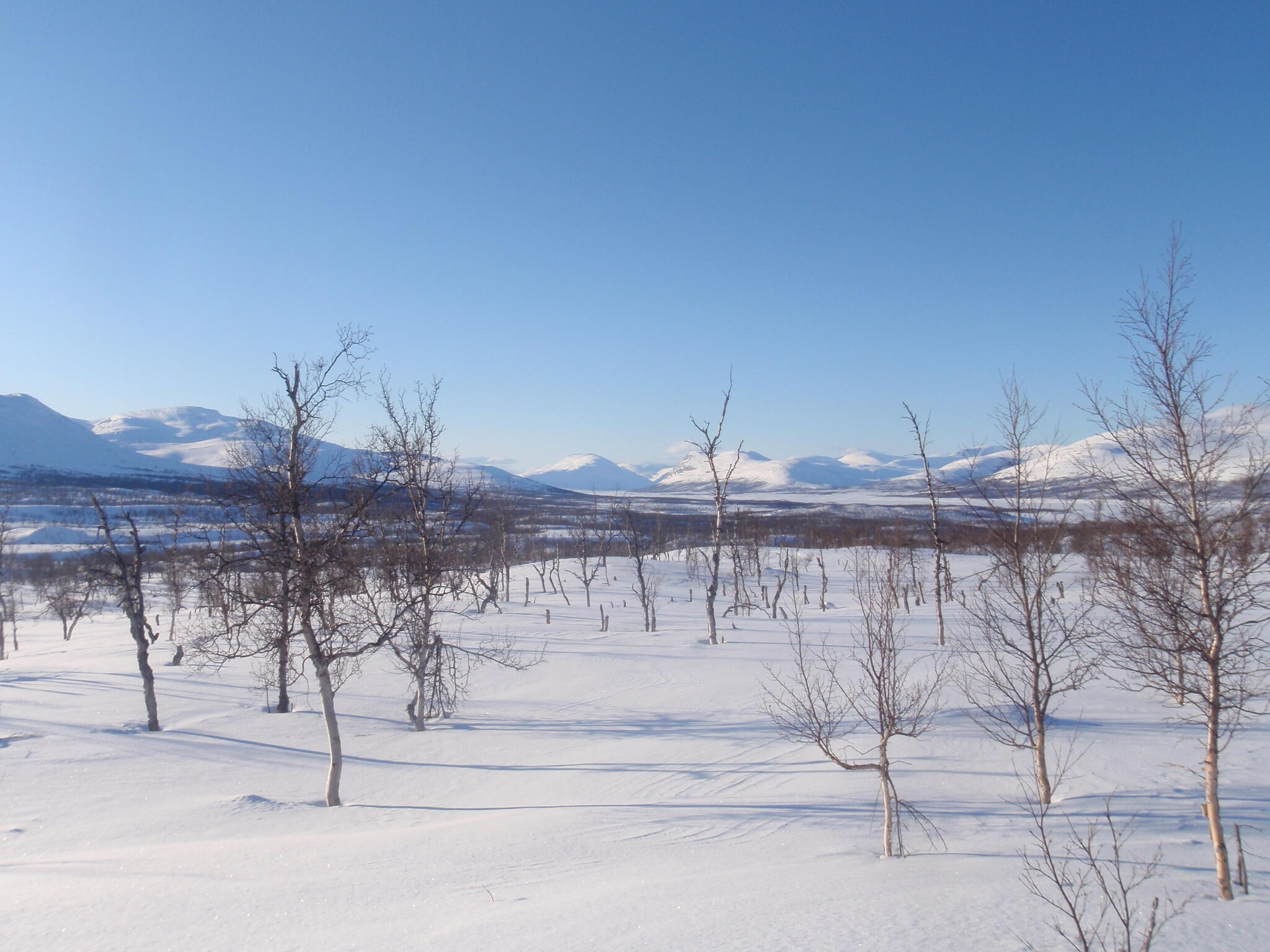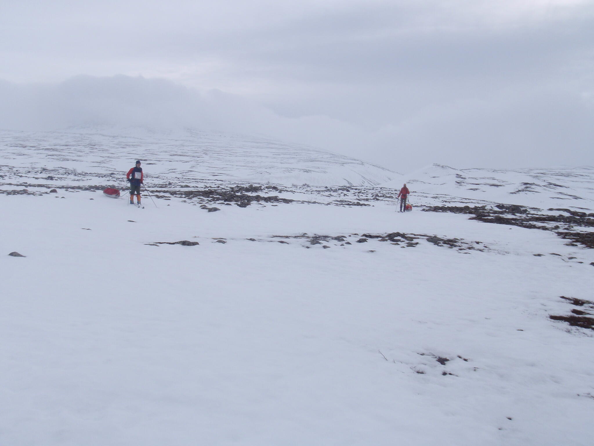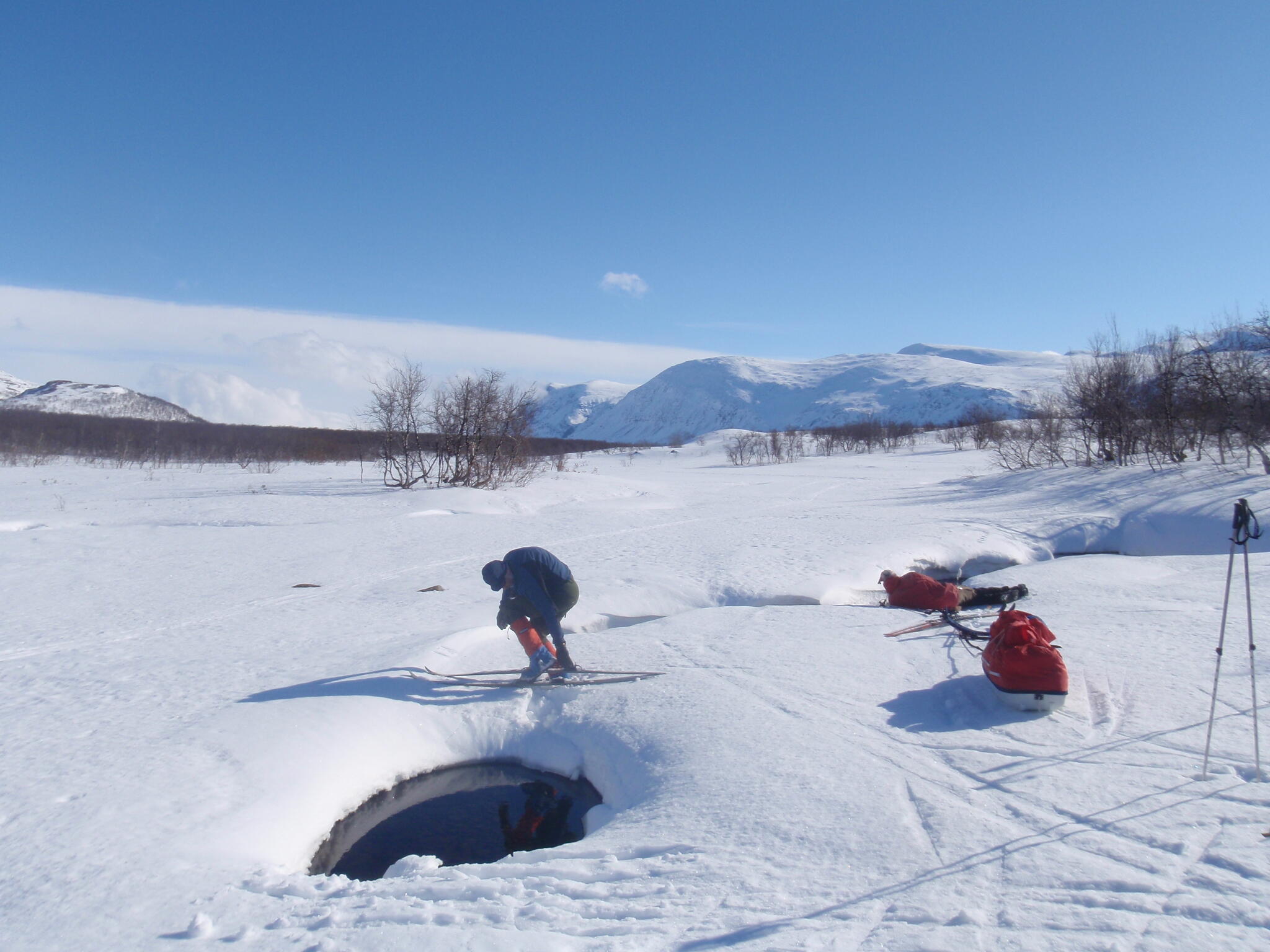 Skidföret var enligt Magnus S hans "livs sämsta skidföre" upp genom björkskogen. Snöytan brast, det sjönk till ungefär knäna och det fastnade. En av oss fick vara spårare och skida utan pulka. Magnus A gick näst sist och drog två pulkor.