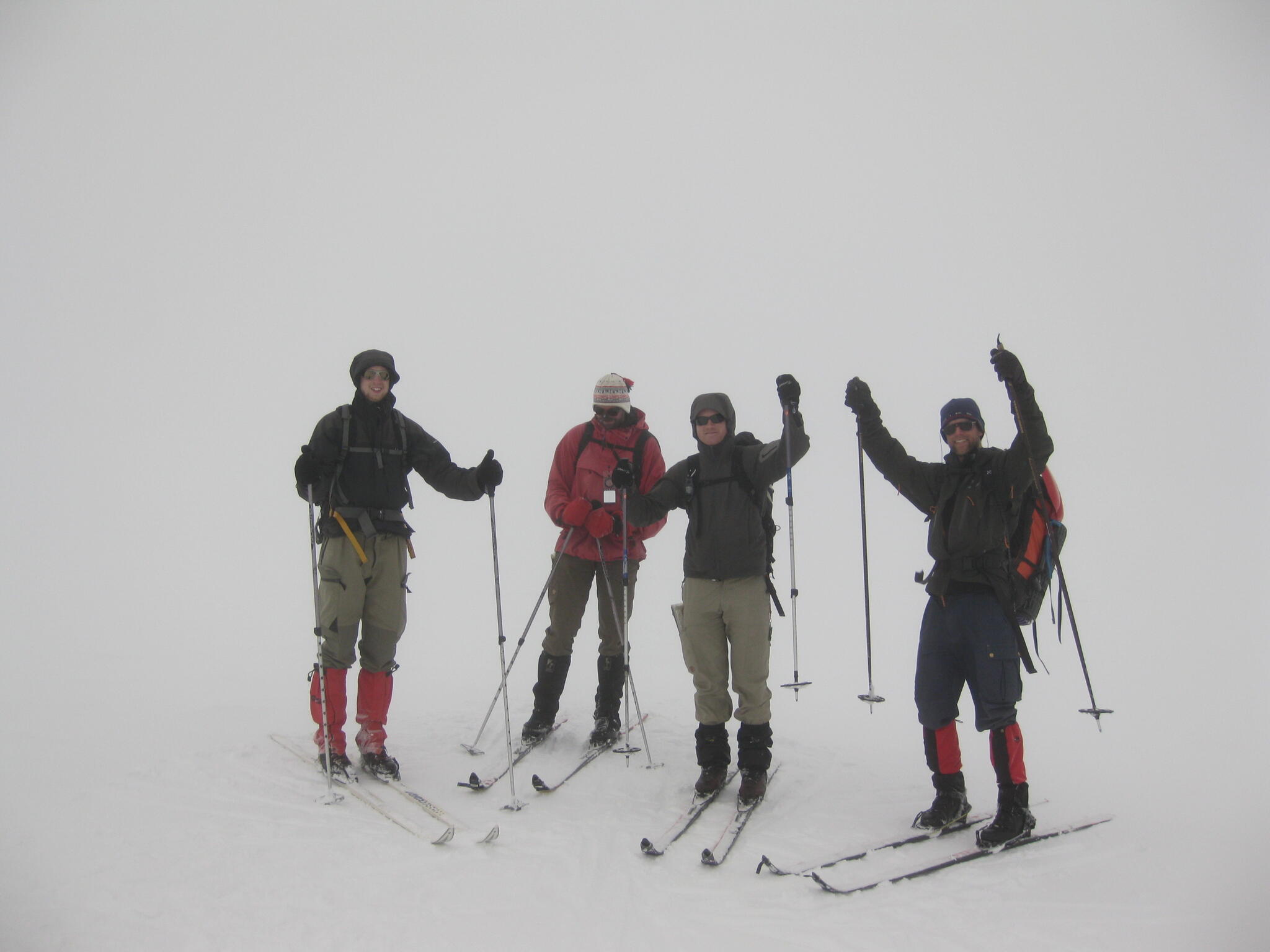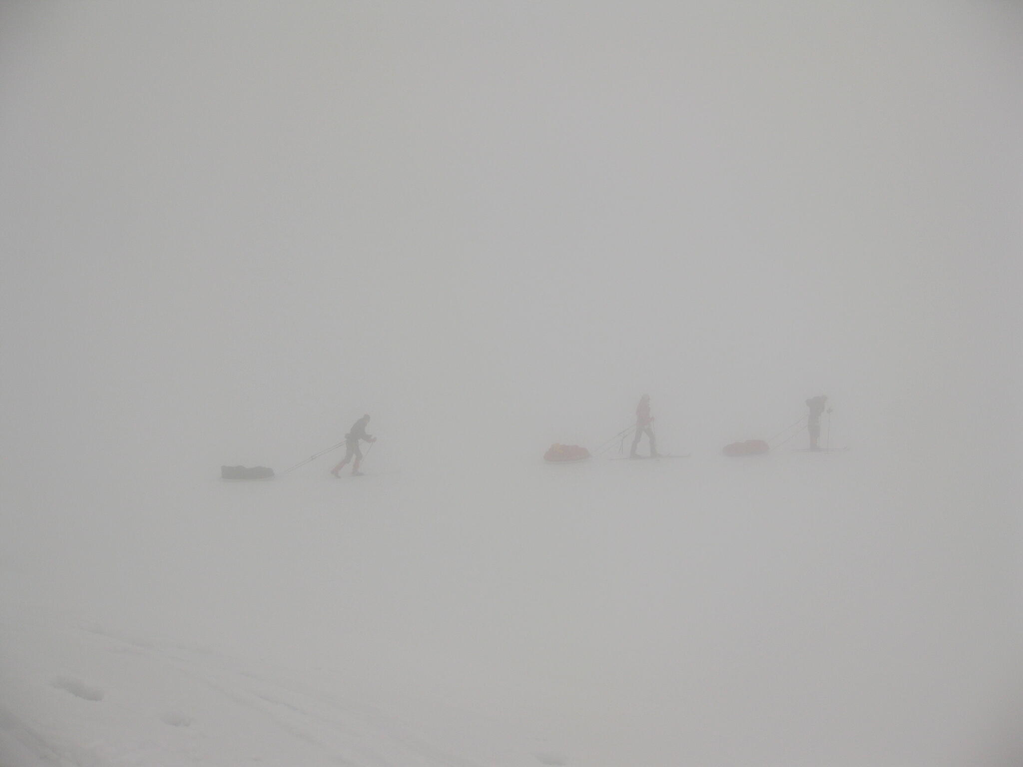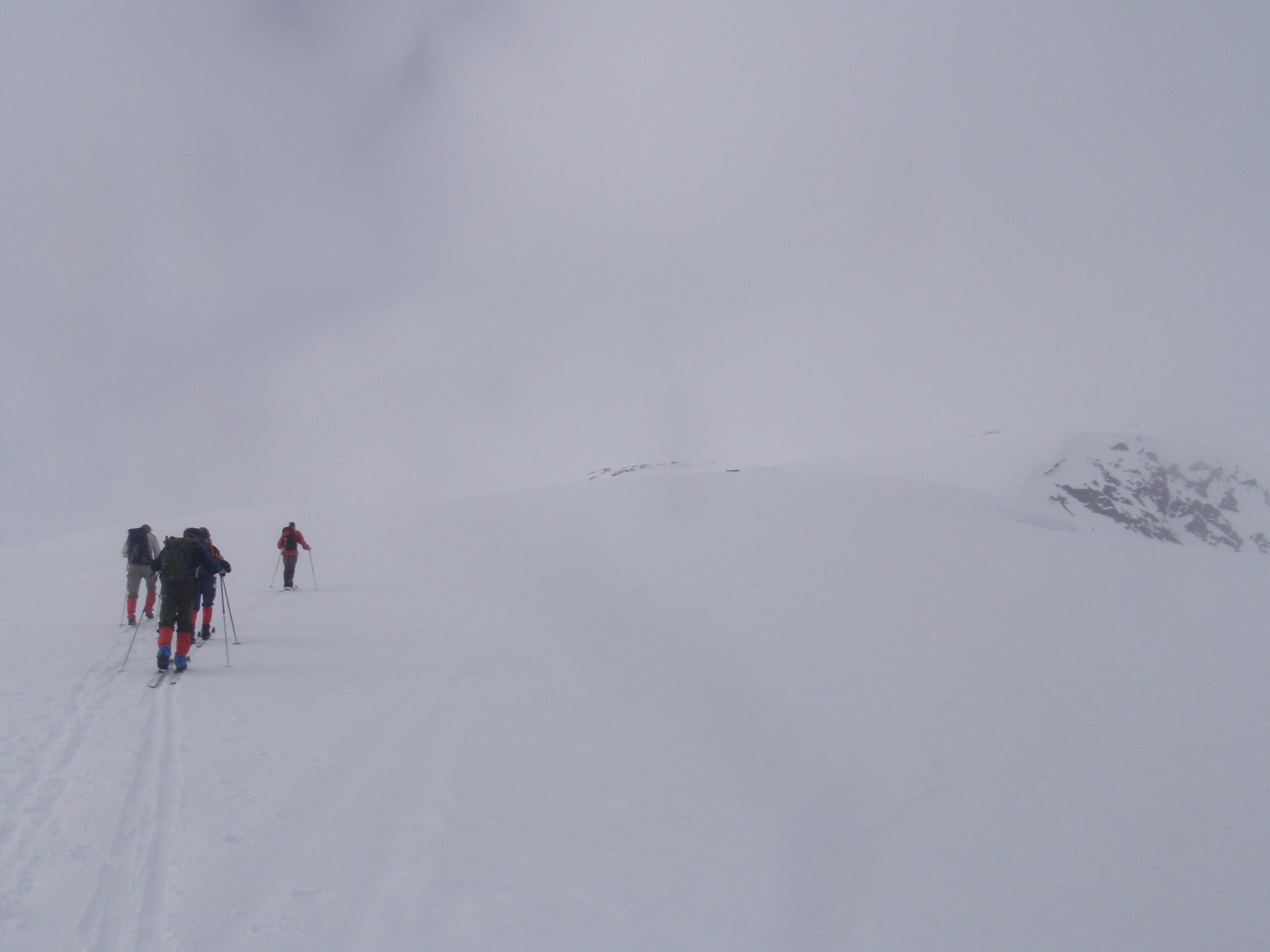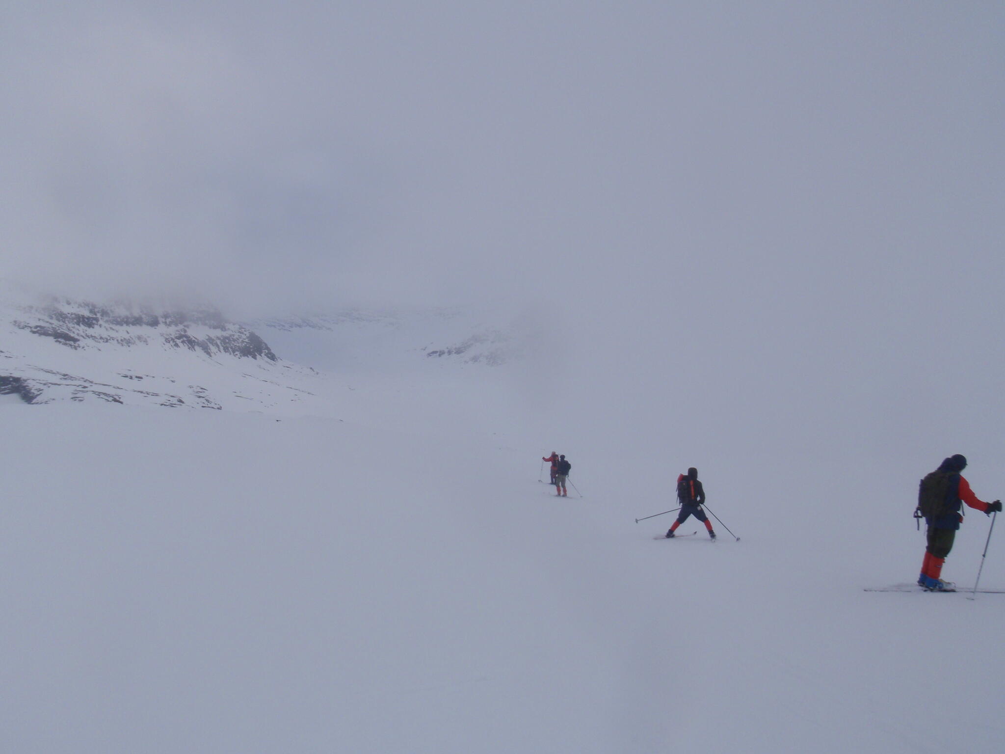 Vi skidade på skrå som bitvis var brant. Så småningom kom vi ur dimman.