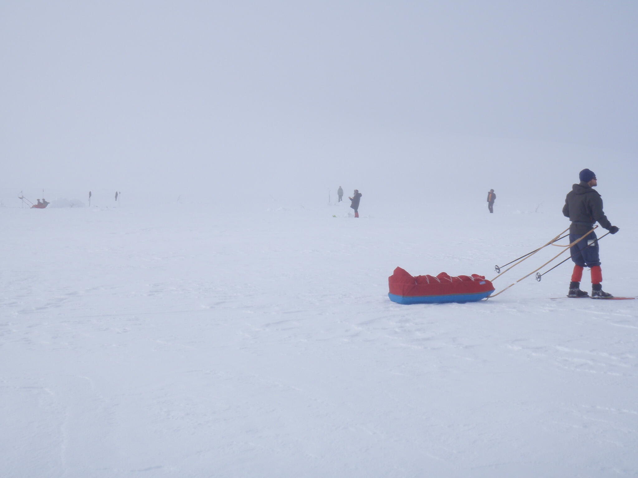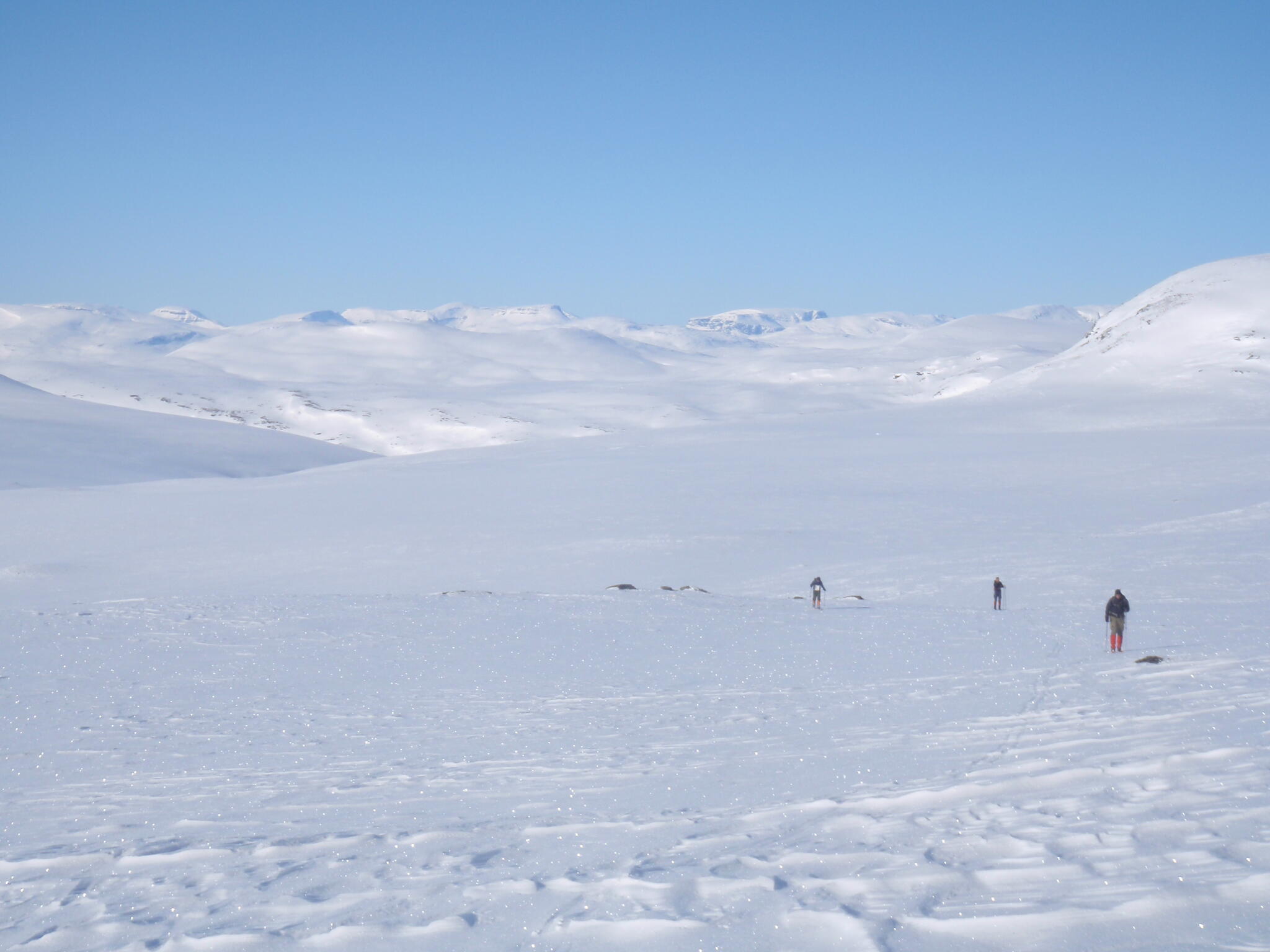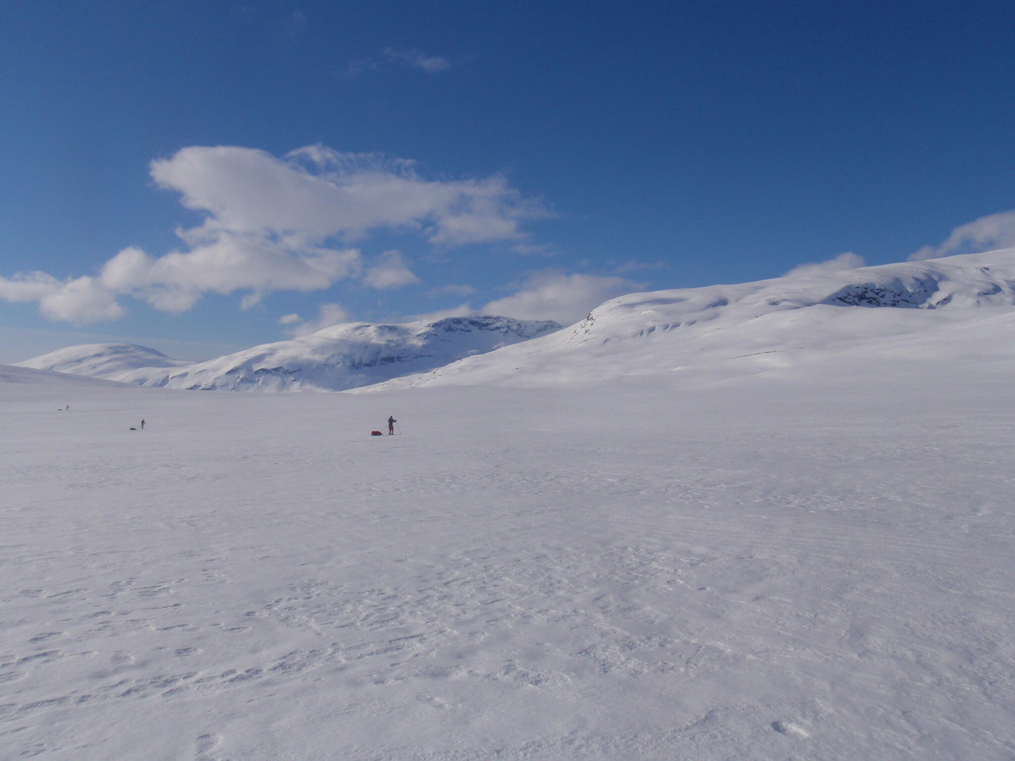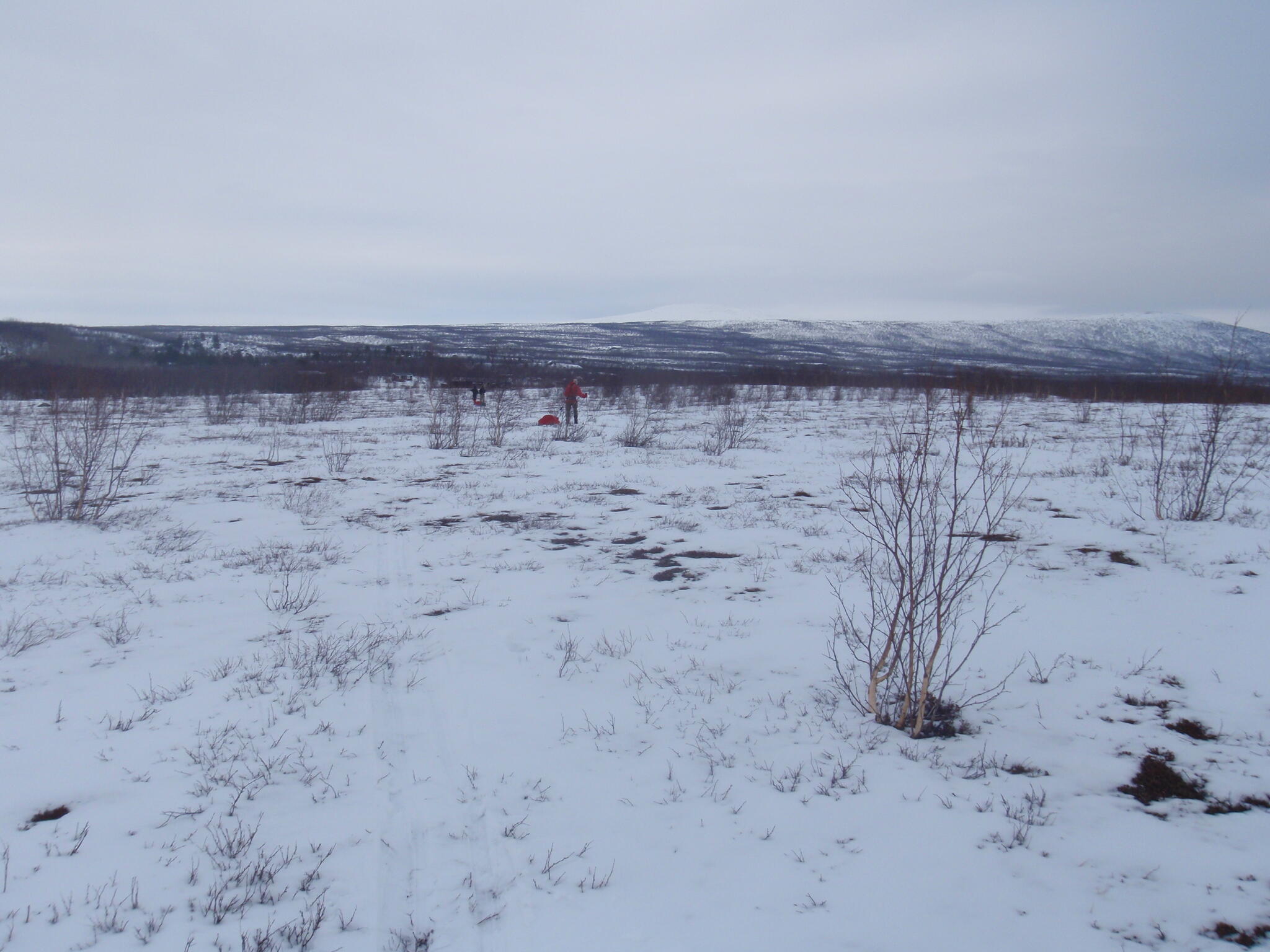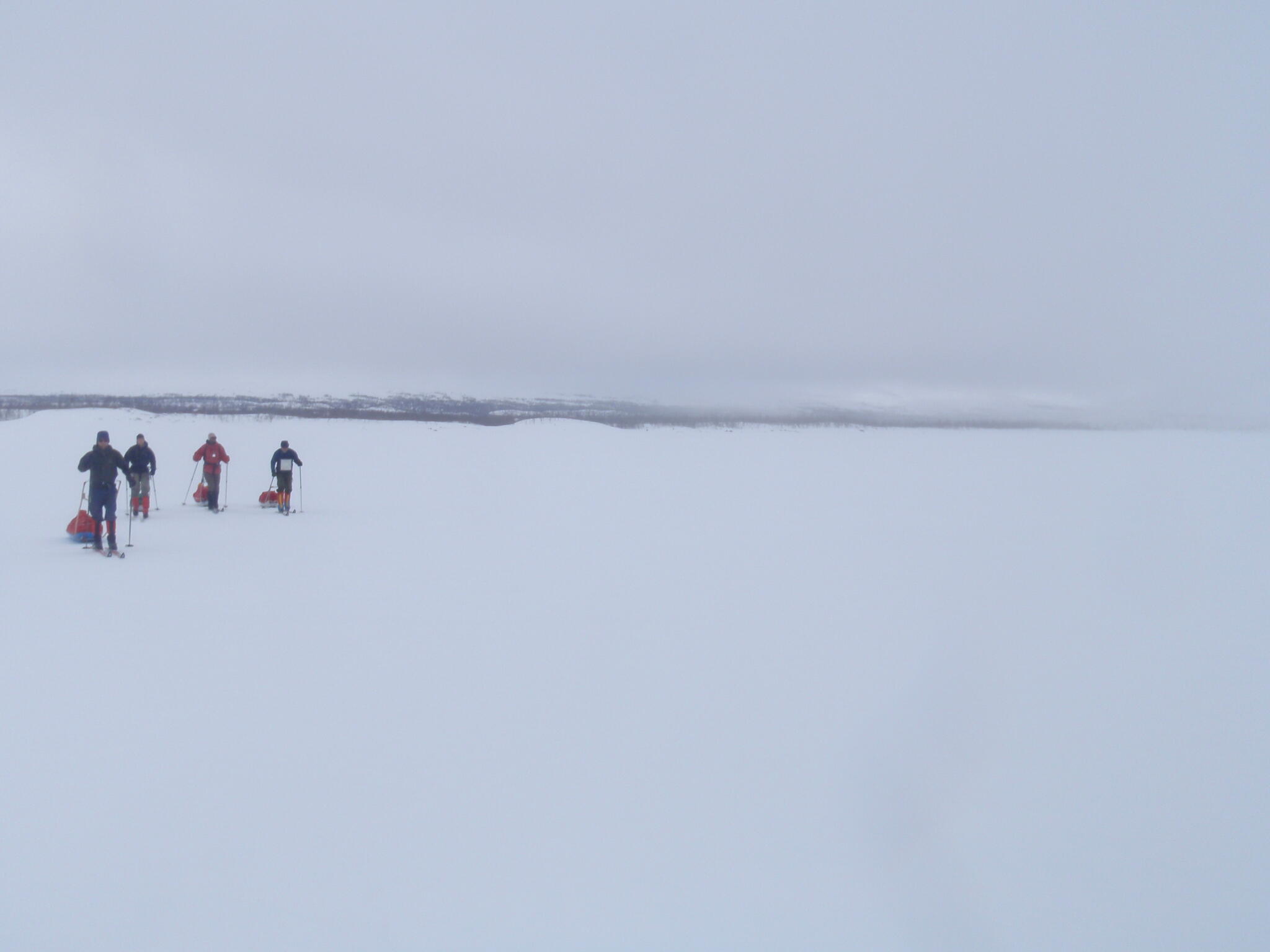 Vi mötte inga andra som var på turåkning annat än till och från pimpelfiskeplatser. Med tanke på hur pass vackert och lättillgängligt området är från Sverige så var det förvånansvärt få svenskar där. Trots att vi var i området runt påsk så såg vi inga norrmän som var på tur. Vi tältade ca ett dygn vid Nordkalottleden och under den tiden passerade ingen.